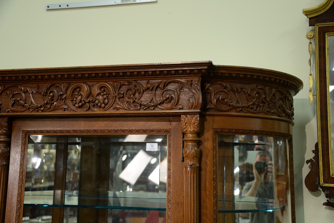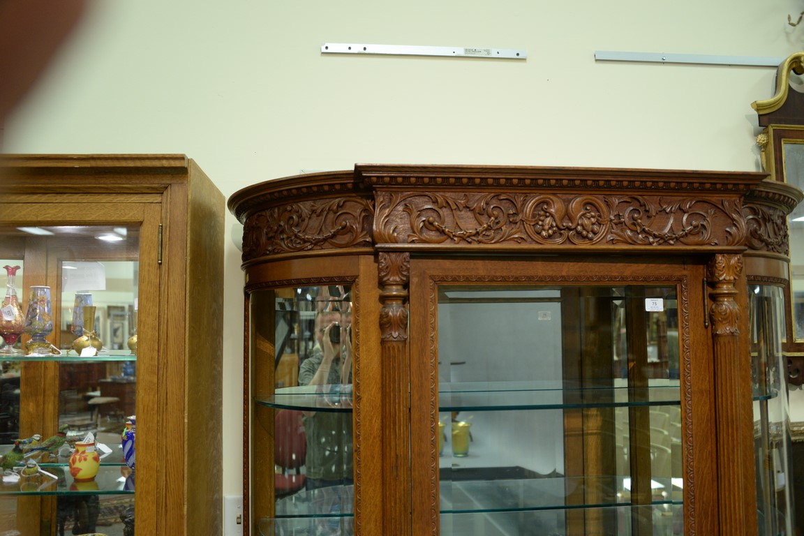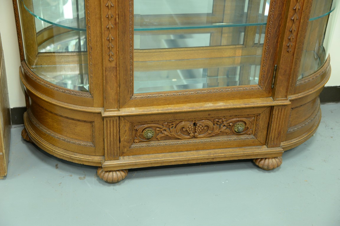 Lot 75: R. J. Horner Victorian oak china cabinet having carved top, columns, and drawer, bowed bevel glass sides with bevel glass door and g…