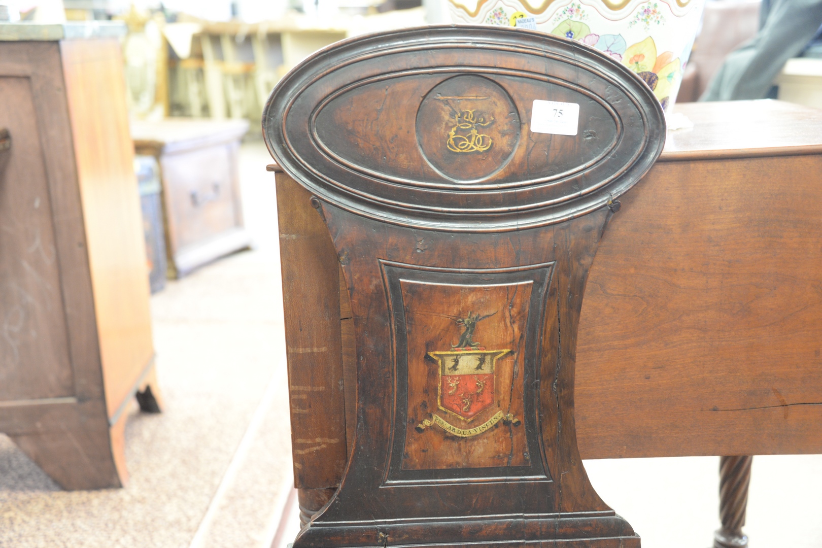 having shaped, paneled back, painted with a monogram and coat of arms, above a paneled seat, raised on ring-turned tapering legs