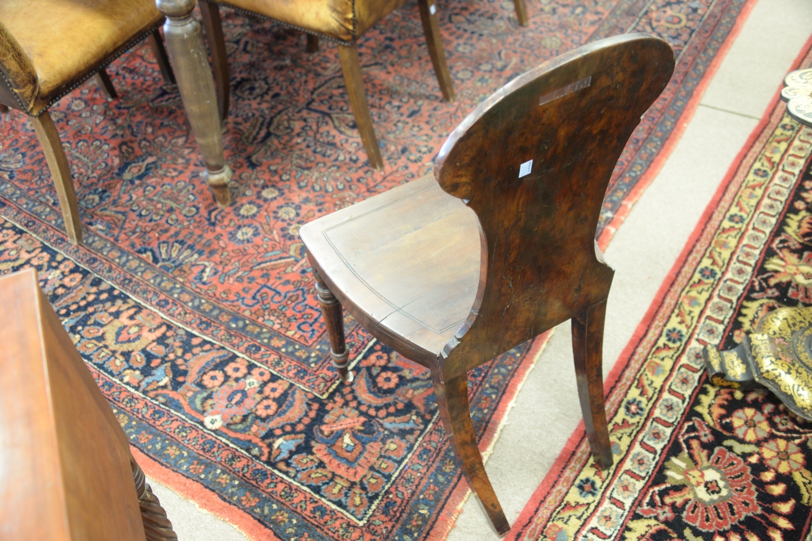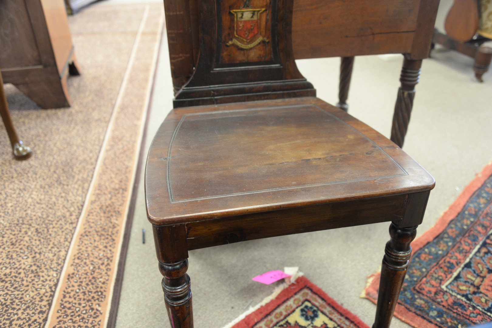 Lot 75: Regency Mahogany Side Chair 19th Century having shaped, paneled back, painted with a monogram and coat of arms, above a paneled seat…