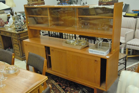 Teak Danish Modern sideboard with sliding glass cabinet. ht. 57 in. wd. 71 in. dp. 18 in.