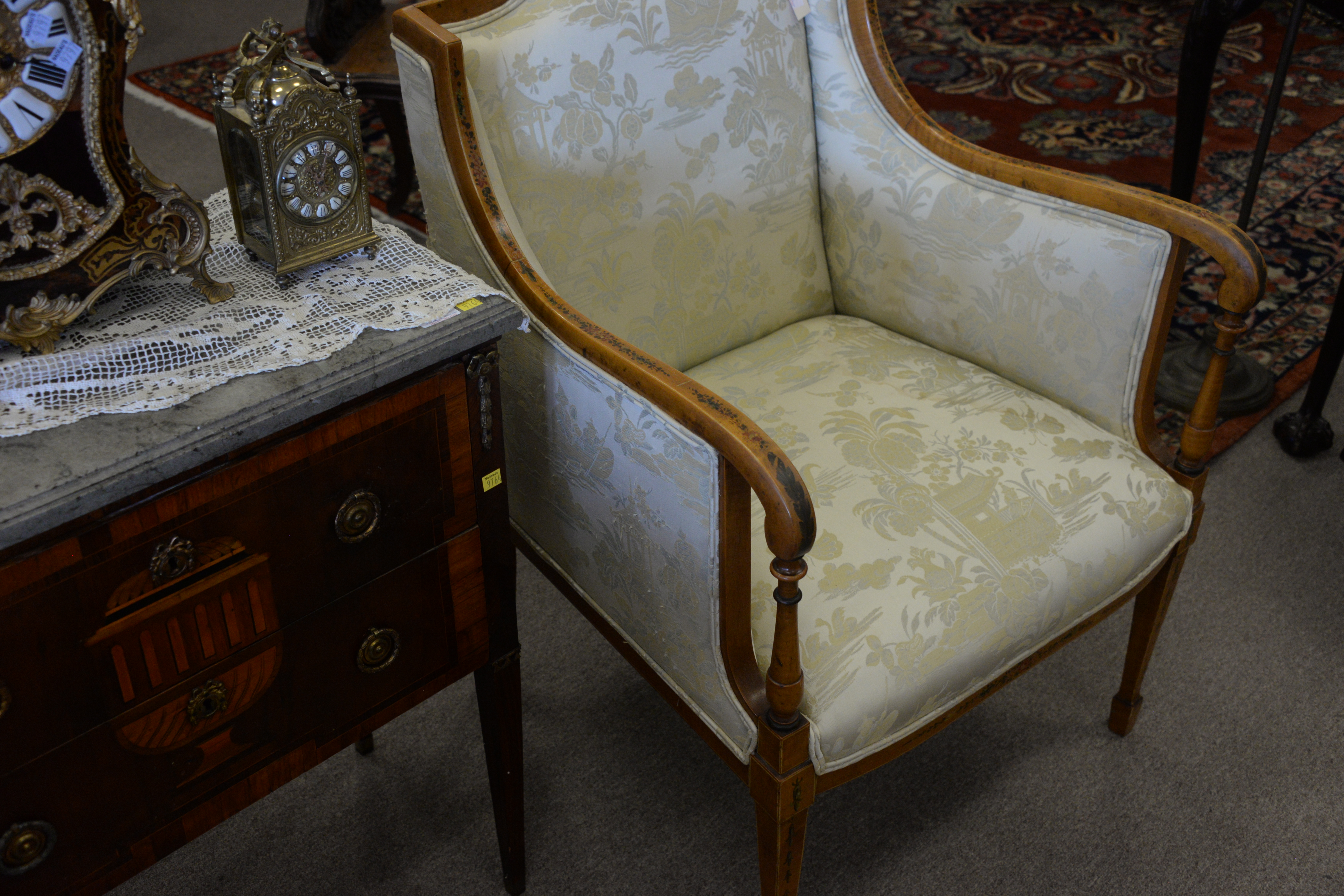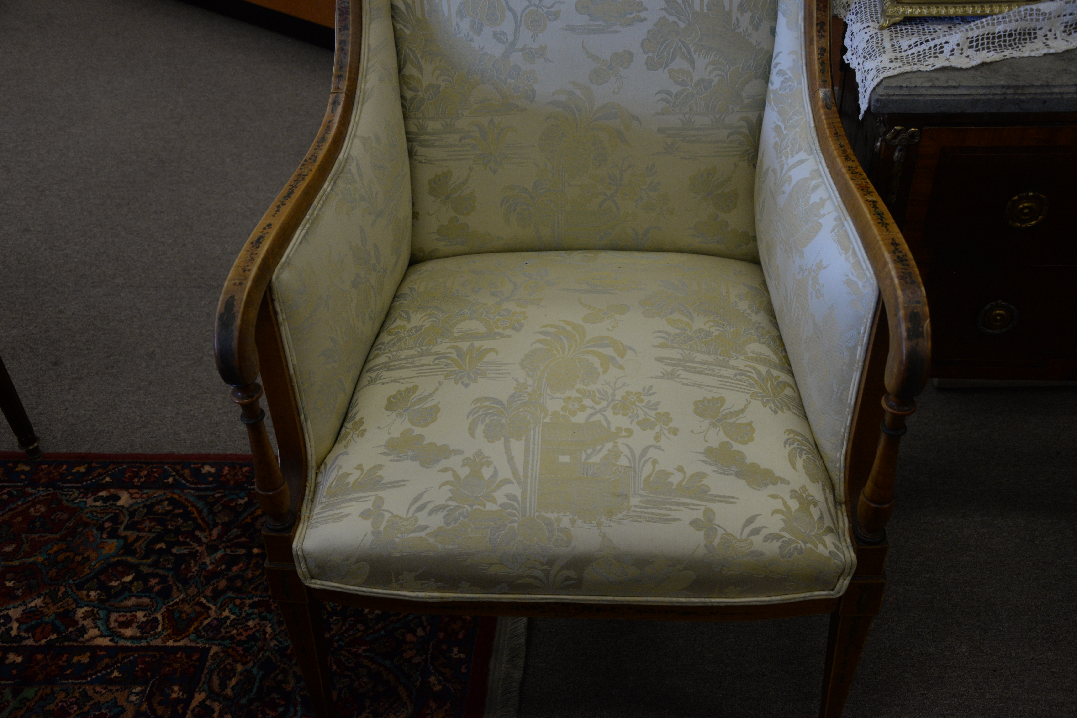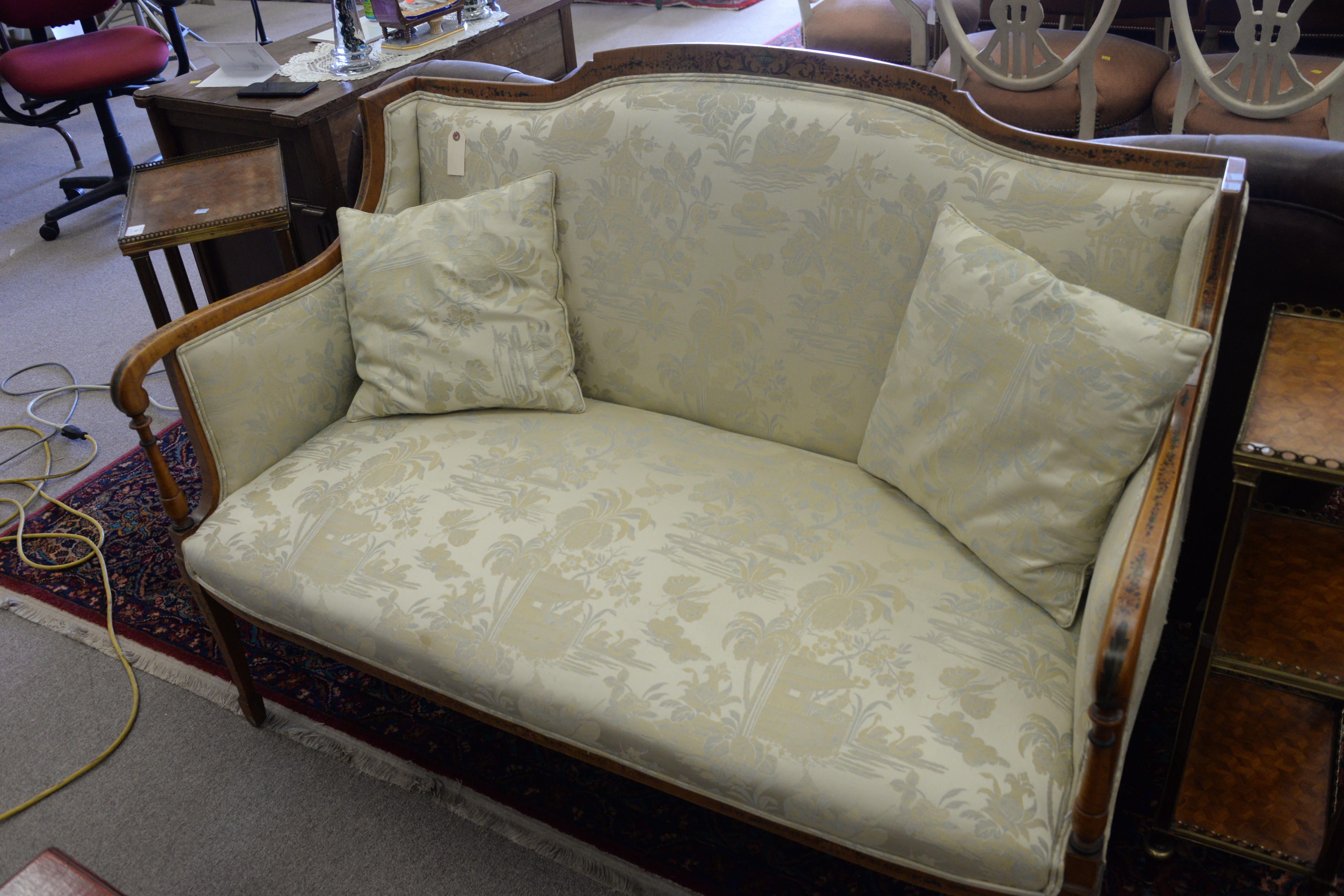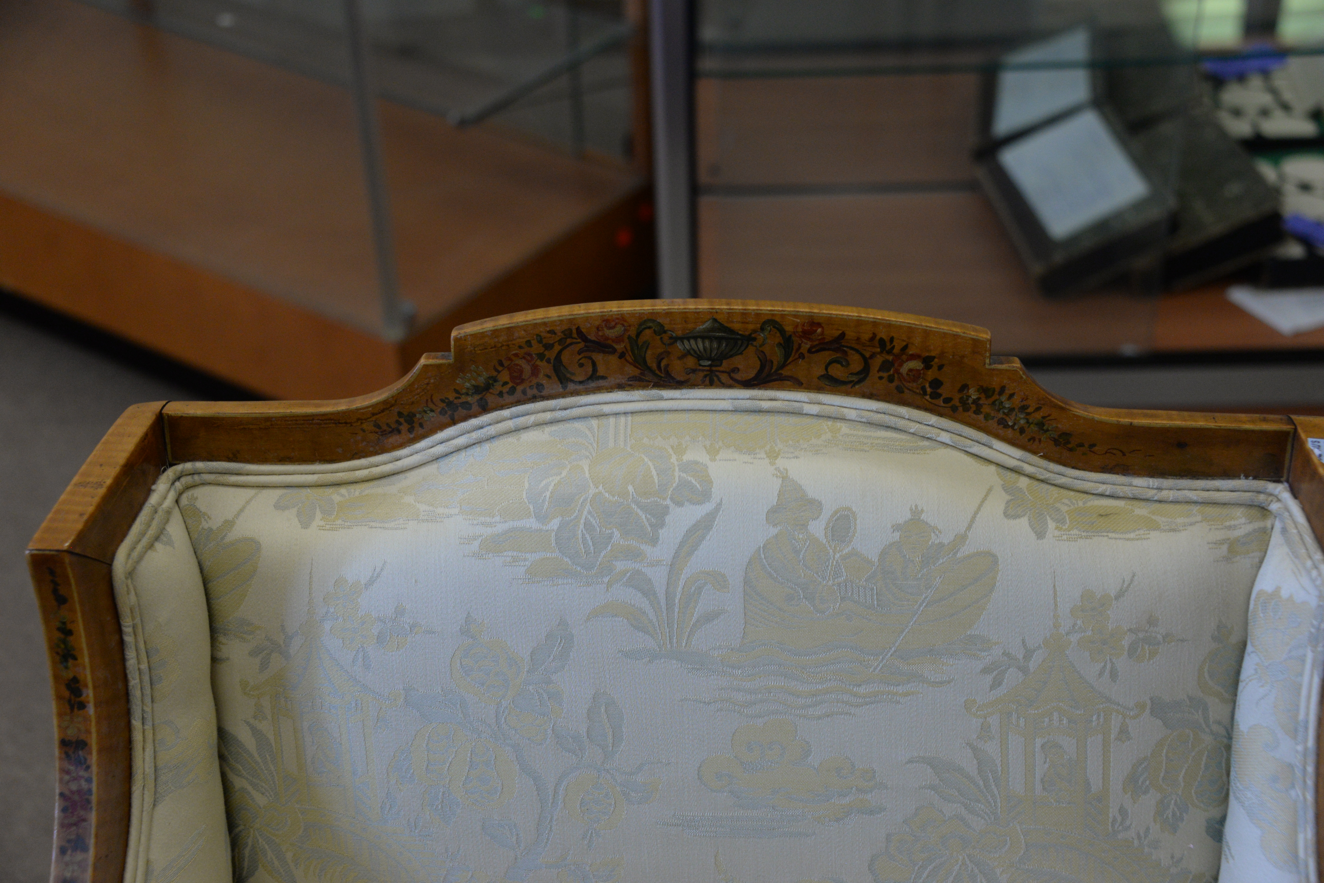 Lot 75: Three Piece Edwardian Style Settee, along with two arm chairs, satinwood with paint decoration one seat with stain, height 37 1/2…