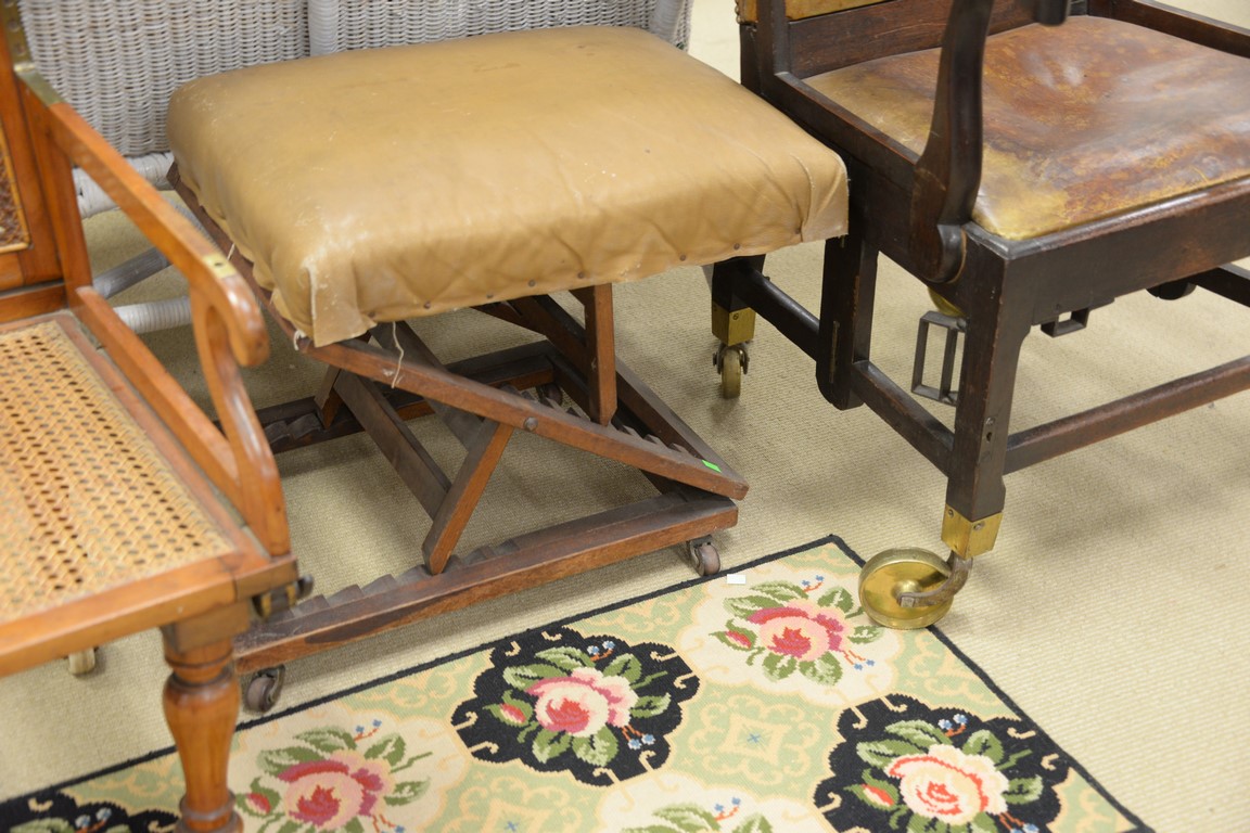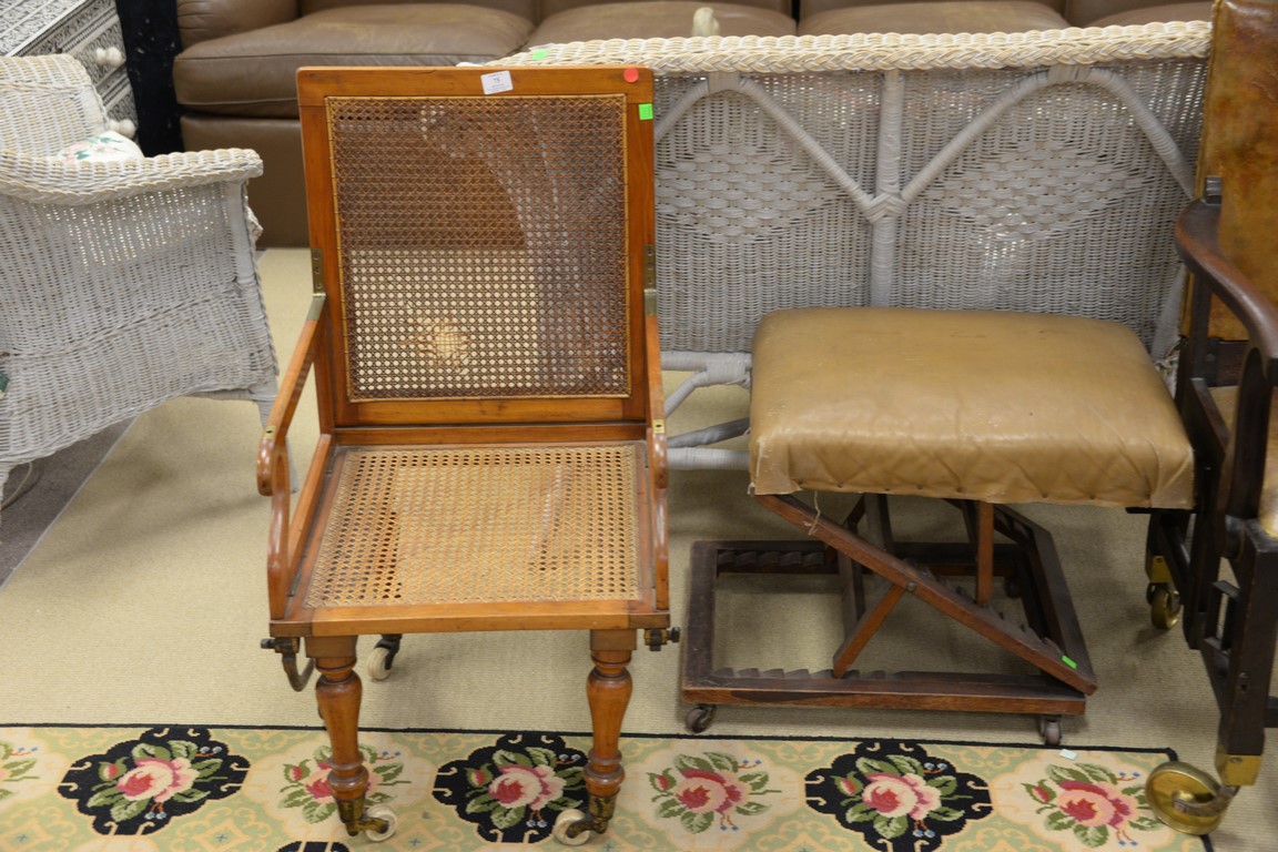 Three piece lot to include caned campaign wheelchair with folding arms and back, a leather upholstered folding campaign wheelchair, and an adjustable stool.