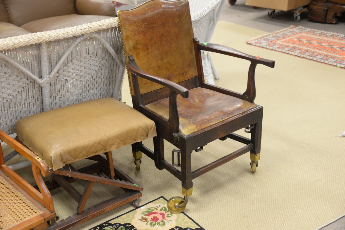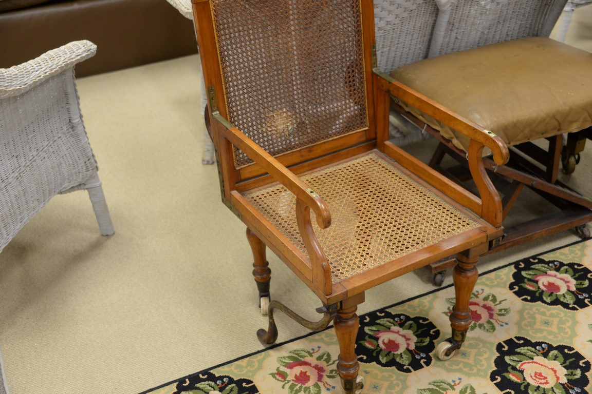 Lot 75: Three piece lot to include caned campaign wheelchair with folding arms and back, a leather upholstered folding campaign wheelchair, …