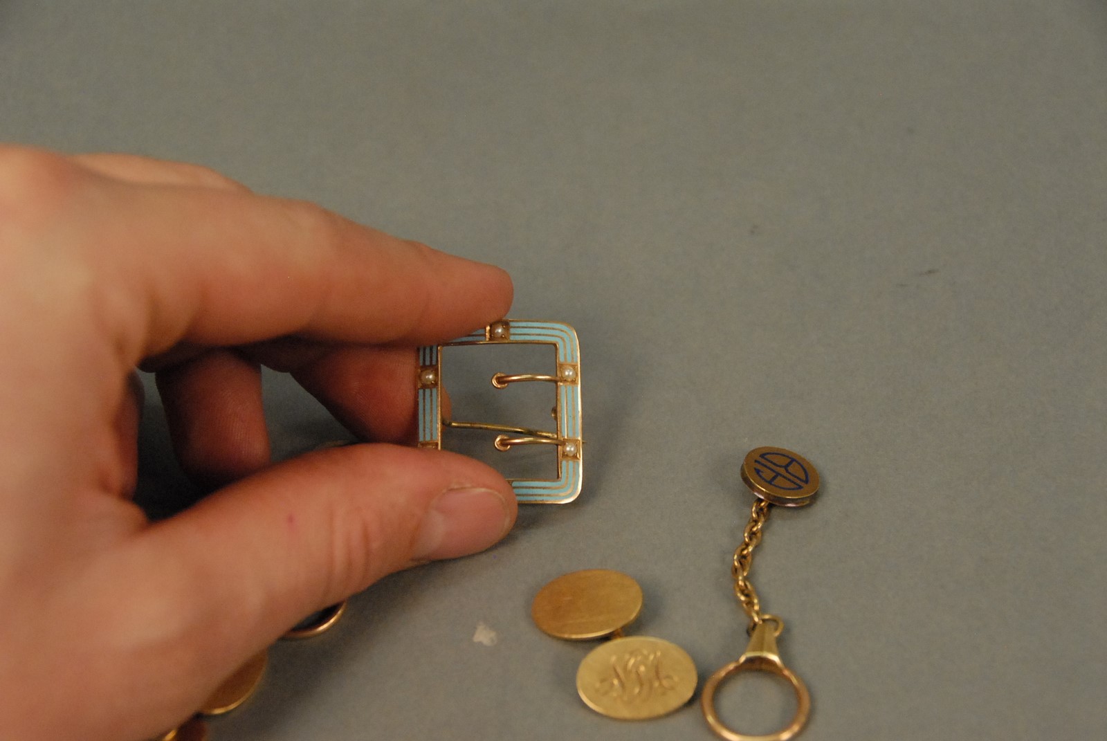 Two pairs of 14K gold cufflinks and 14K gold enameled belt buckle 32.2 grams.