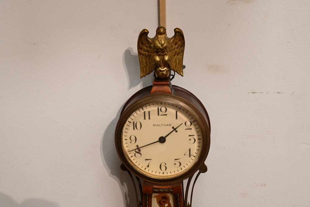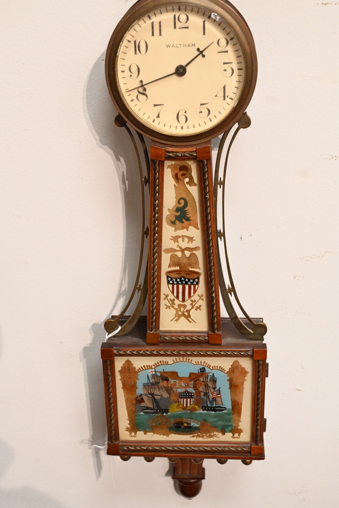 Lot 75: Waltham Miniature Banjo Clock having mahogany case, painted dial and brass rope front trim, reverse painted tablets of ship battle length 21 1/2 inches Provenance: Fifty Year Personal Collection of Clocks and American Antiques from Thomas Bailey, Manchester, Connecticut.