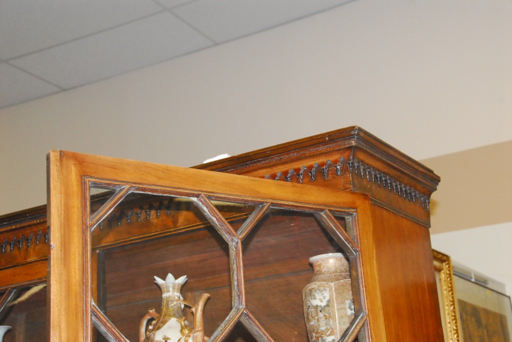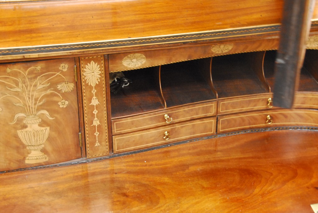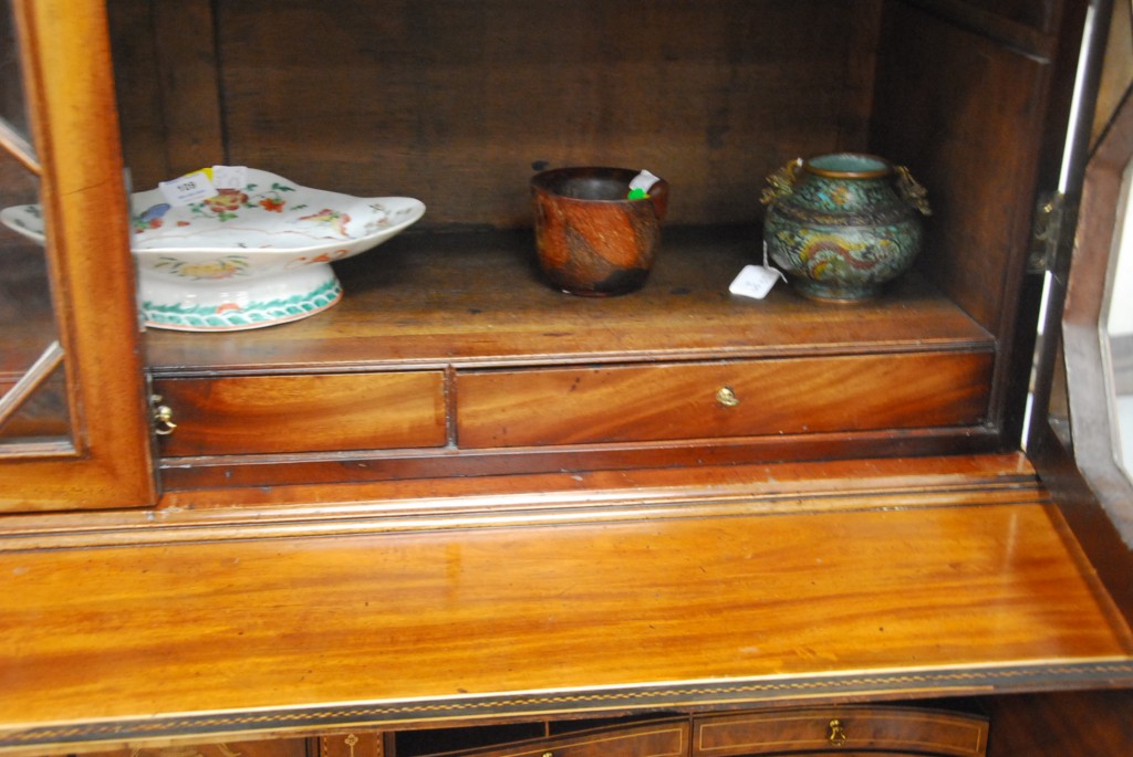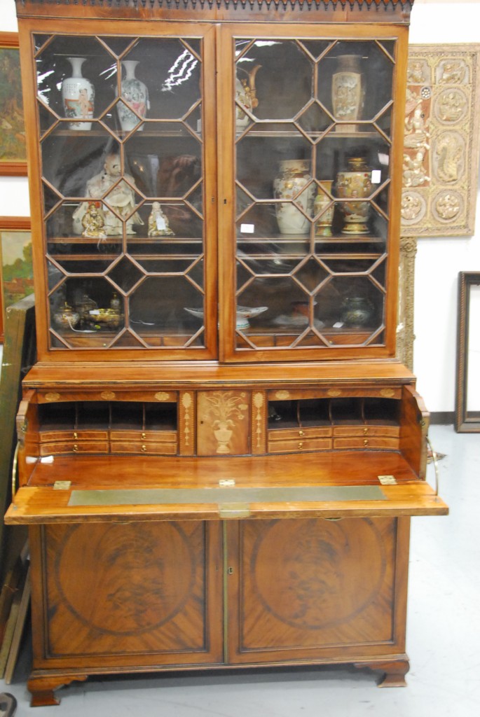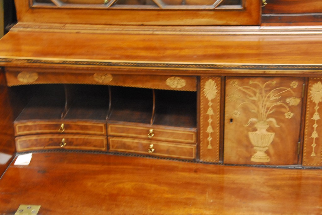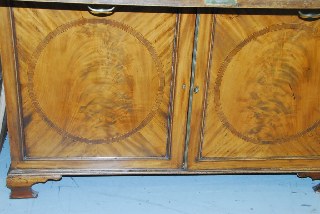 George IV mahogany butler’s secretary desk in two parts with bookcase top over pull out desk over two doors set on ogee feet, circa 1800. – ht. 88in. wd. 48in. dp. 22in.