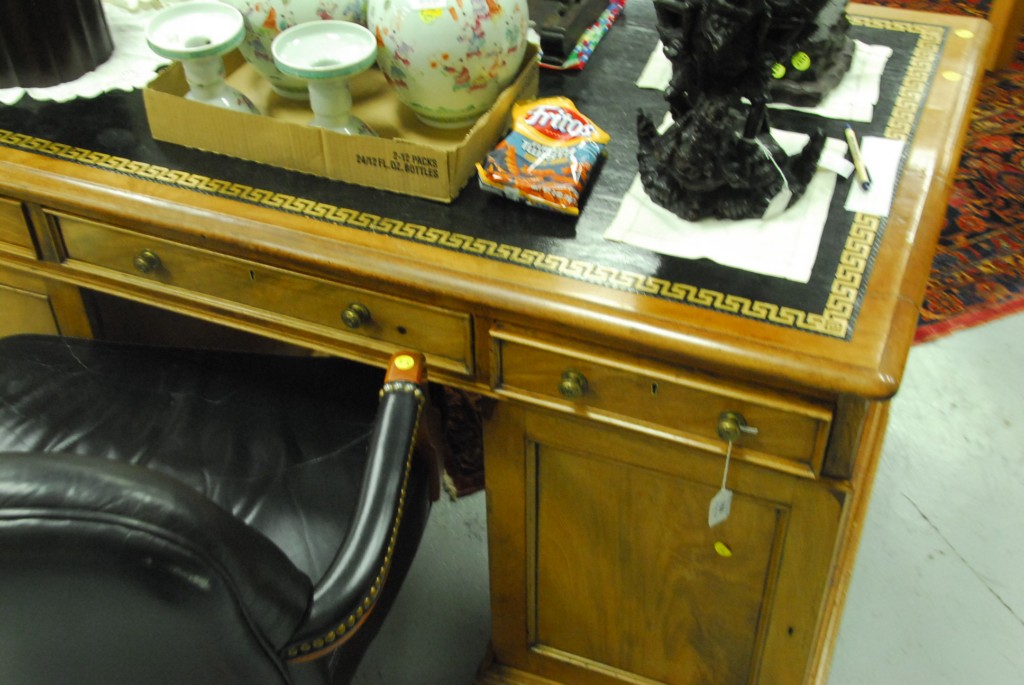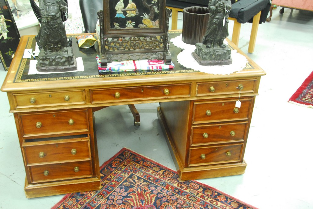Lot 759: Two piece lot George IV mahogany partner’s desk in three parts with black leather top, one side with all drawers, one side with dra…