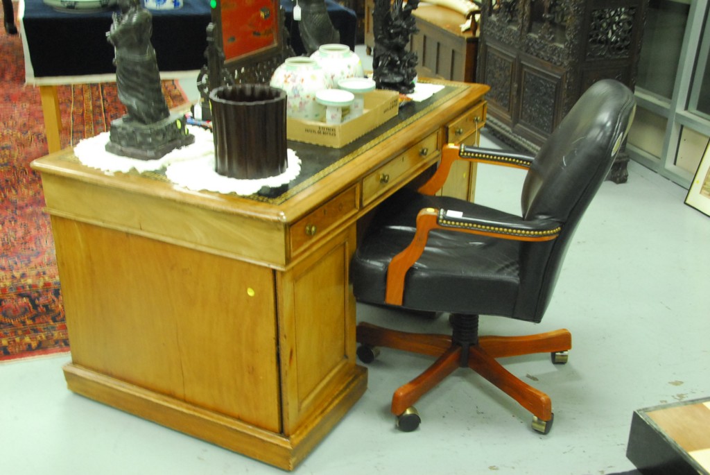 Two piece lot George IV mahogany partner’s desk in three parts with black leather top, one side with all drawers, one side with drawers and doors and a leather swivel chair. – ht. 29 1/2in. lg. 54in. dp. 32in.