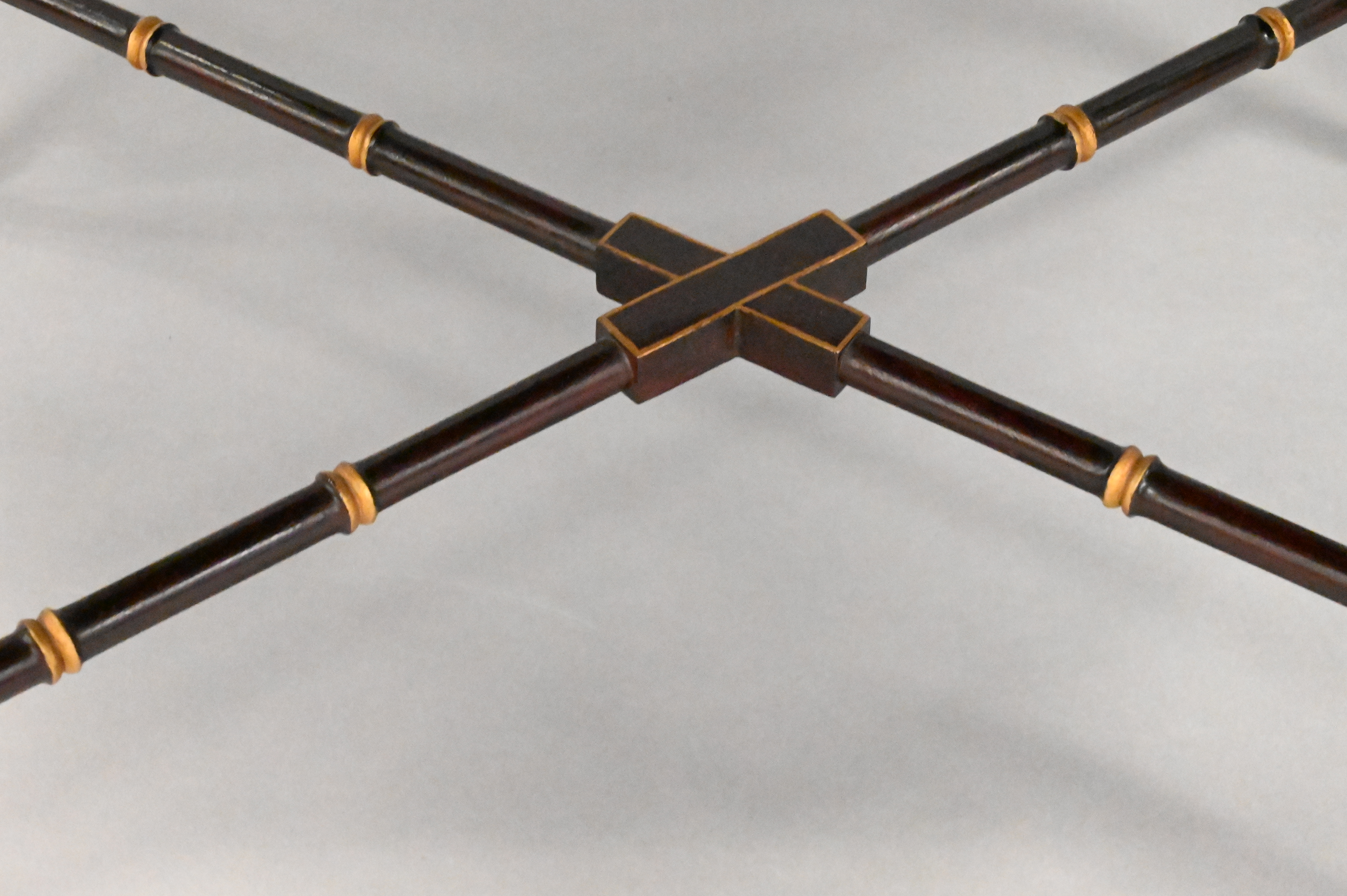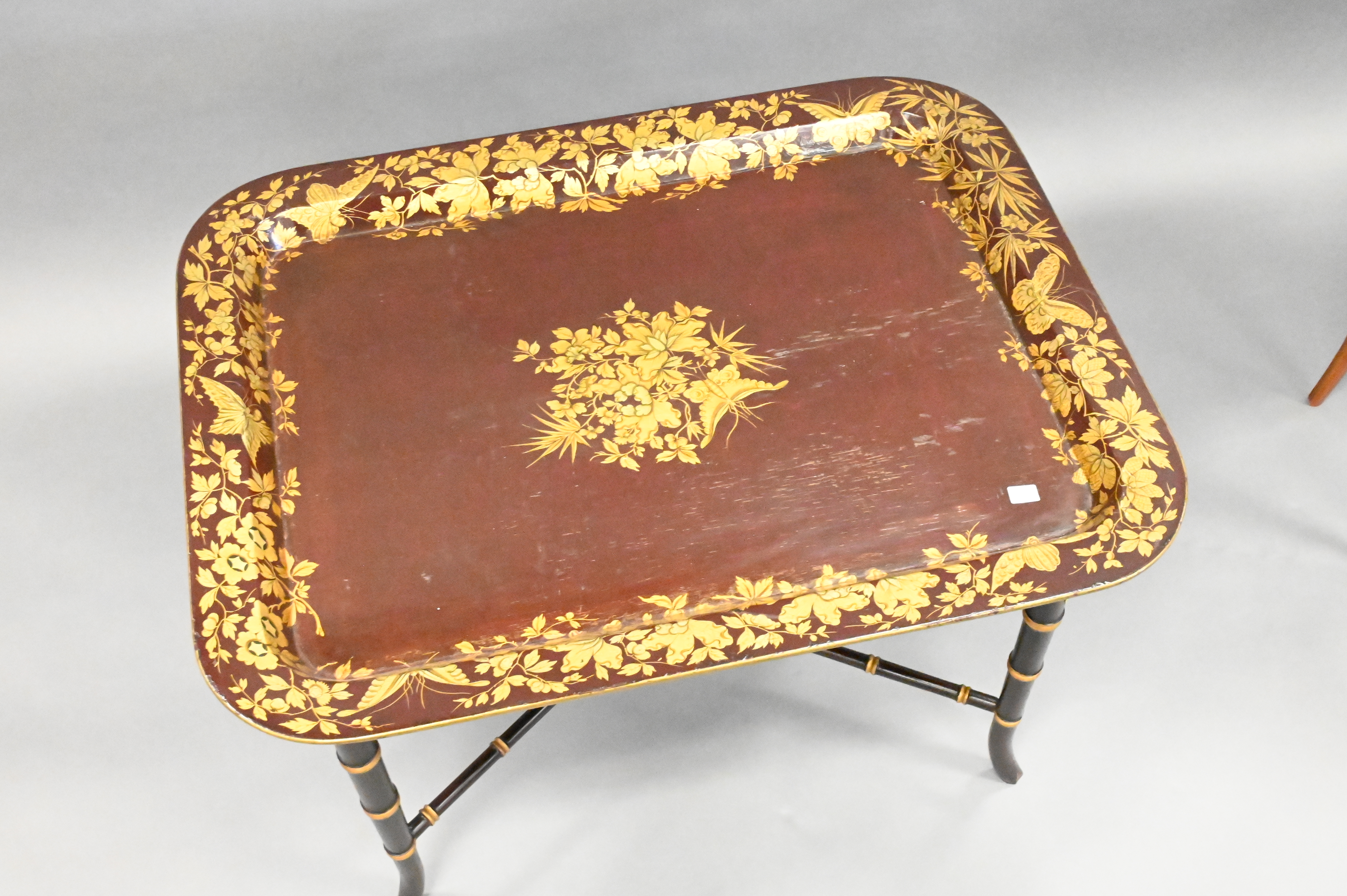 Hand Painted Tray Top Table, having top butterfly and floral motifs, set on faux bamboo base with “x” stretcher.