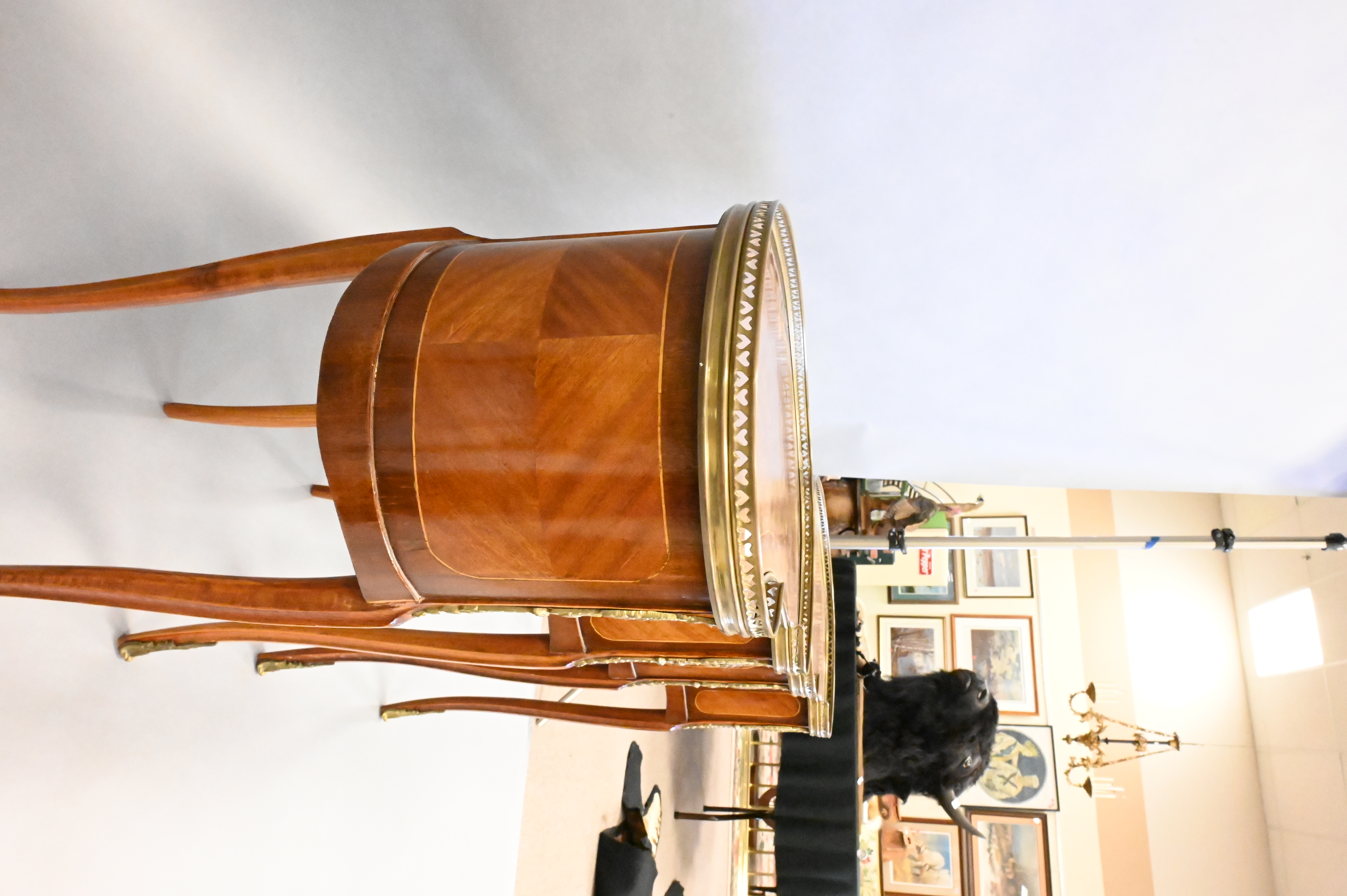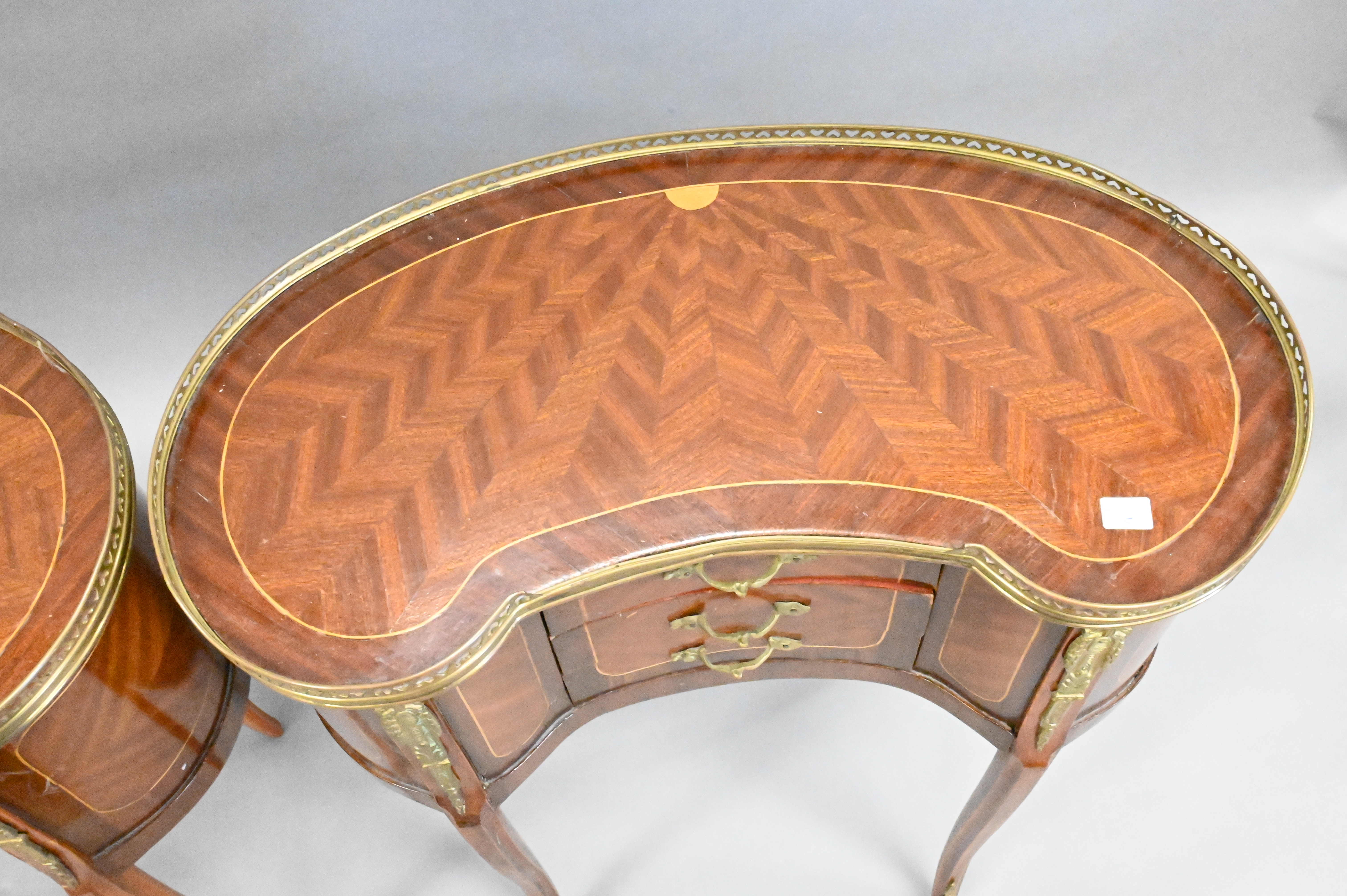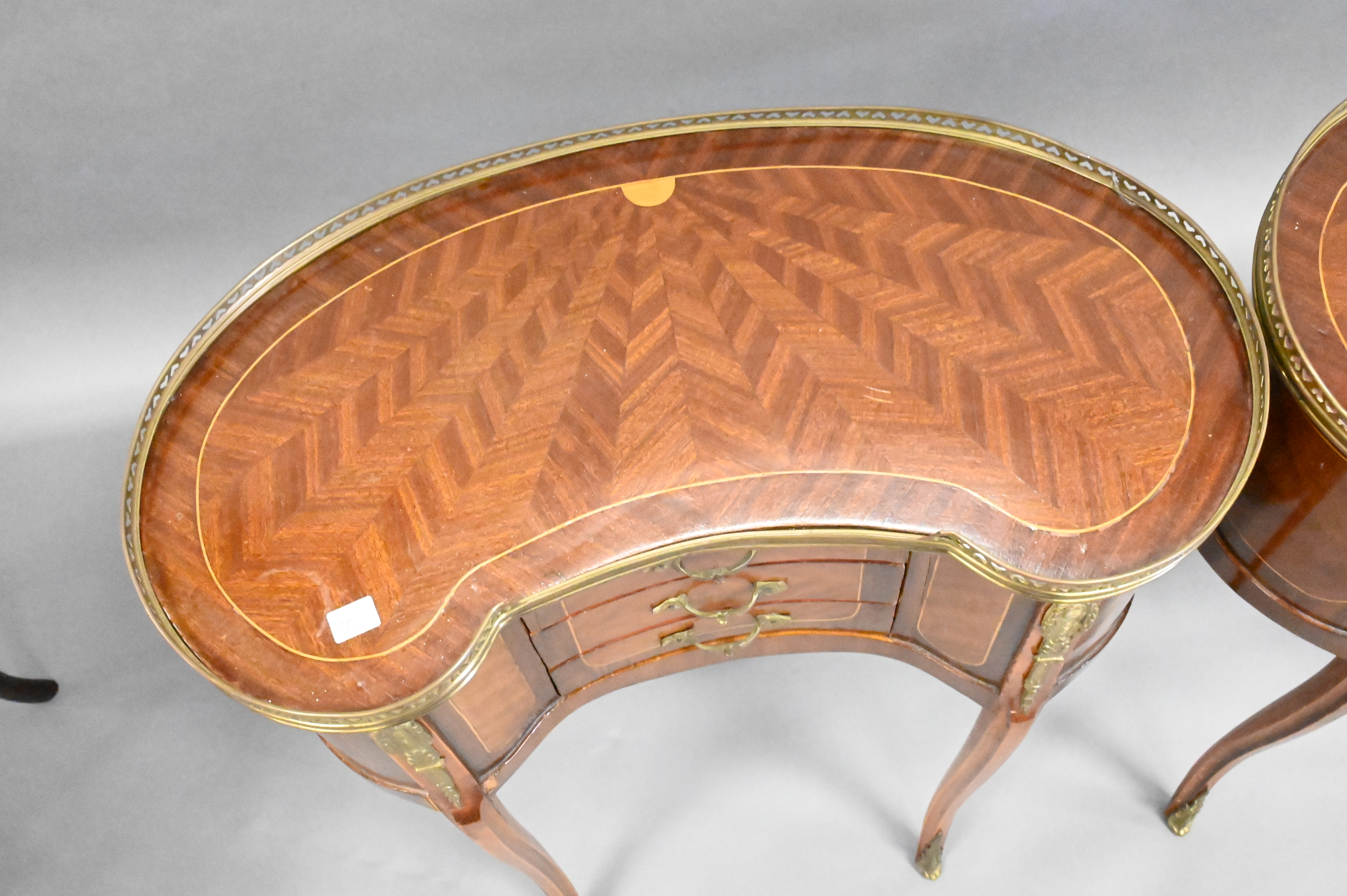 Pair of Three Drawer Kidney Shaped Inlaid Side Tables, each having brass gallery and brass mounts, height 28 1/4 inches, top 12″ x 22″