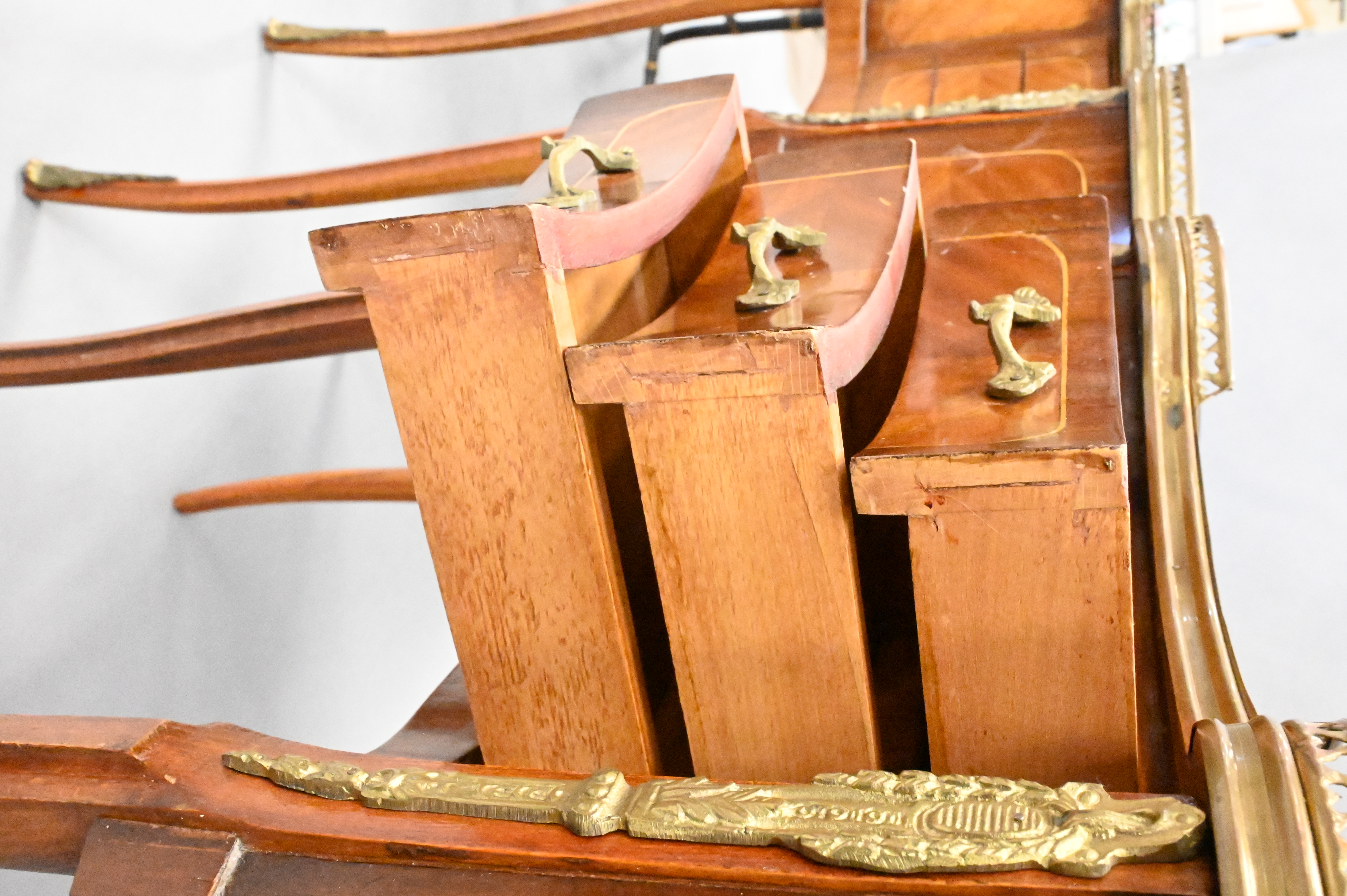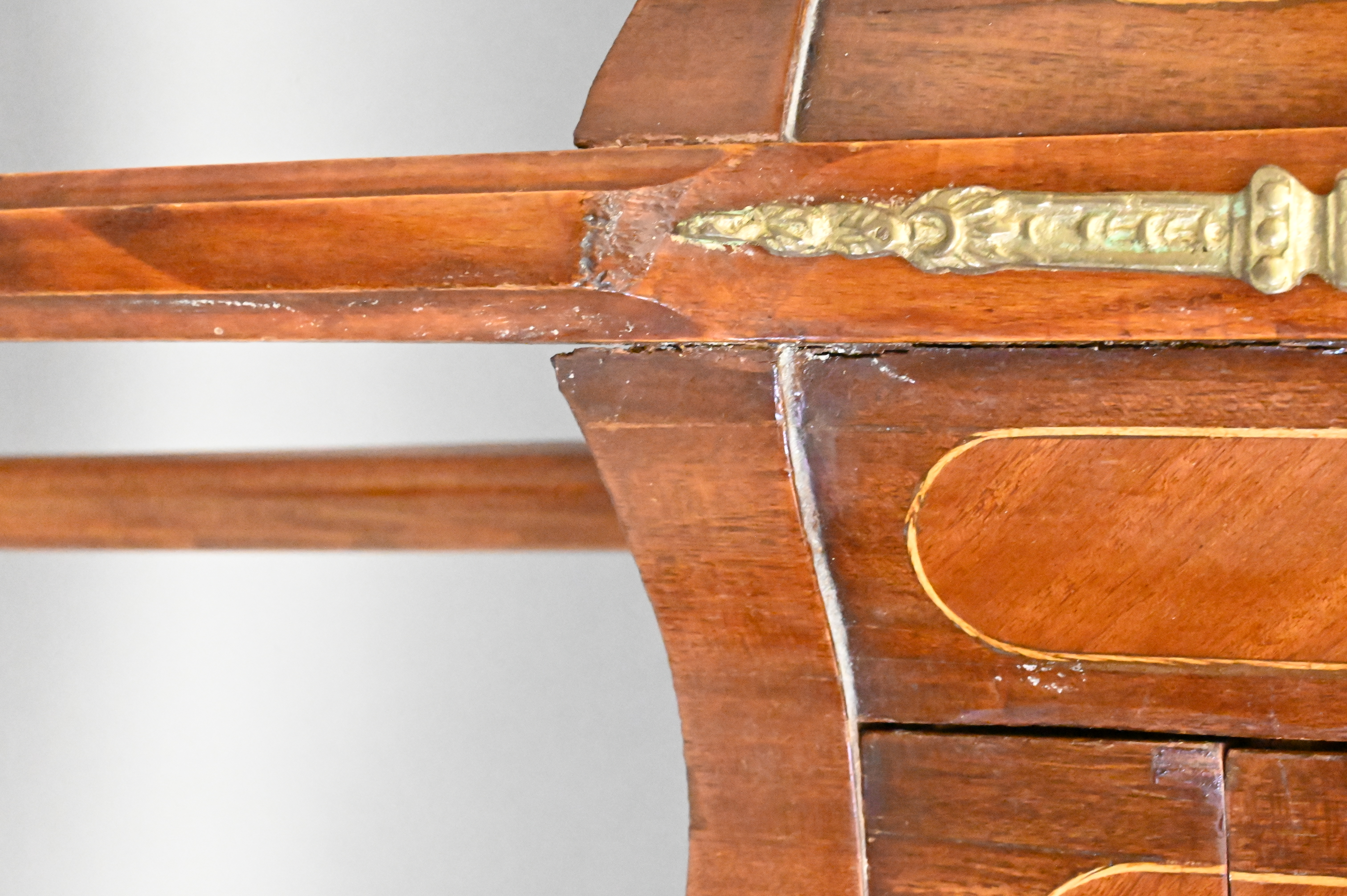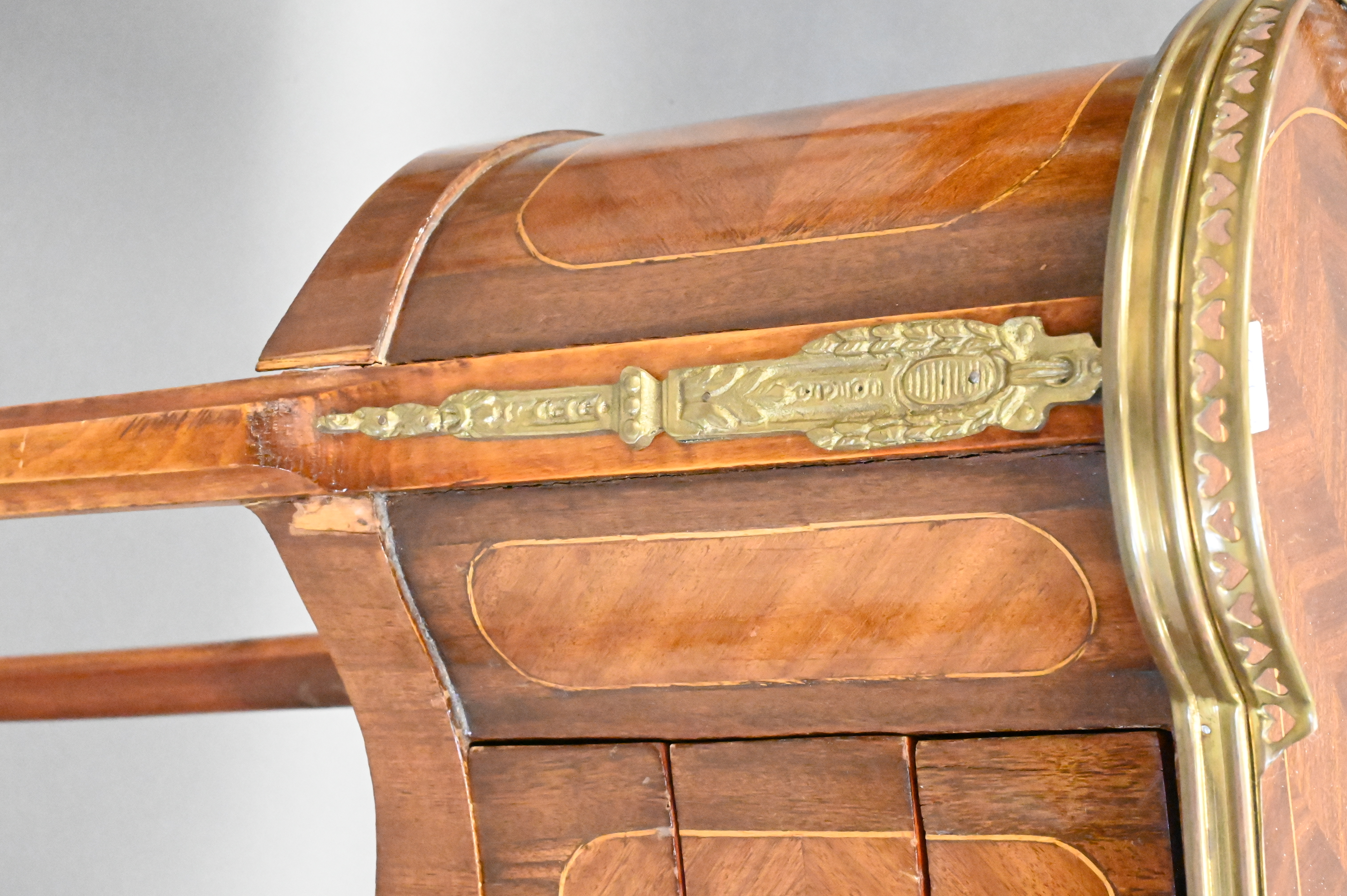 Pair of Three Drawer Kidney Shaped Inlaid Side Tables, each having brass gallery and brass mounts, height 28 1/4 inches, top 12″ x 22″