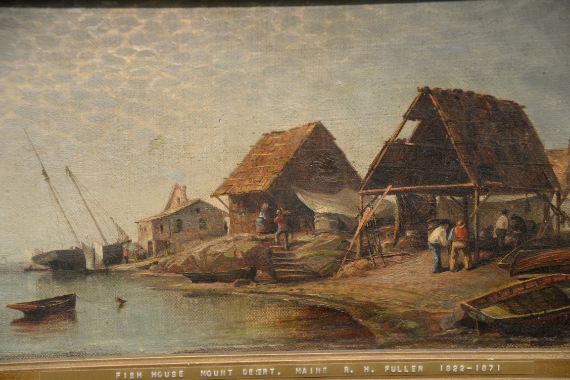 Attributed to Richard Henry Fuller 1822-1871, oil on canvas, Fish House Mount Desert Maine, unsigned, old paper label on verso sold by Hiram Parker 1915, 7 x 12 1/4. Provenance: Estate of Arthur C. Pinto, MD