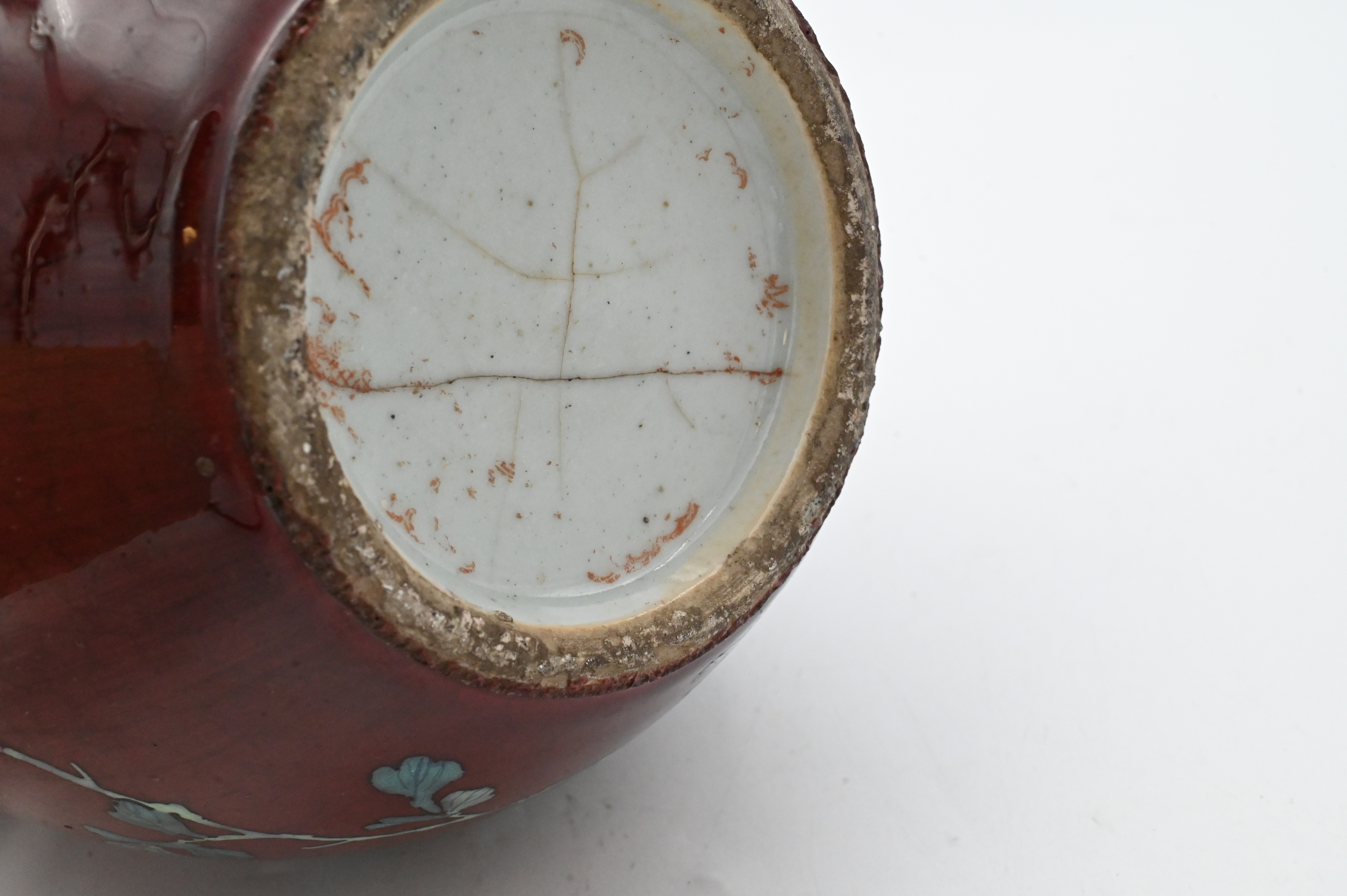 Sange de boeuf, ox-blood, red ground glaze with enamel peaches, branches and birds of paradise motif