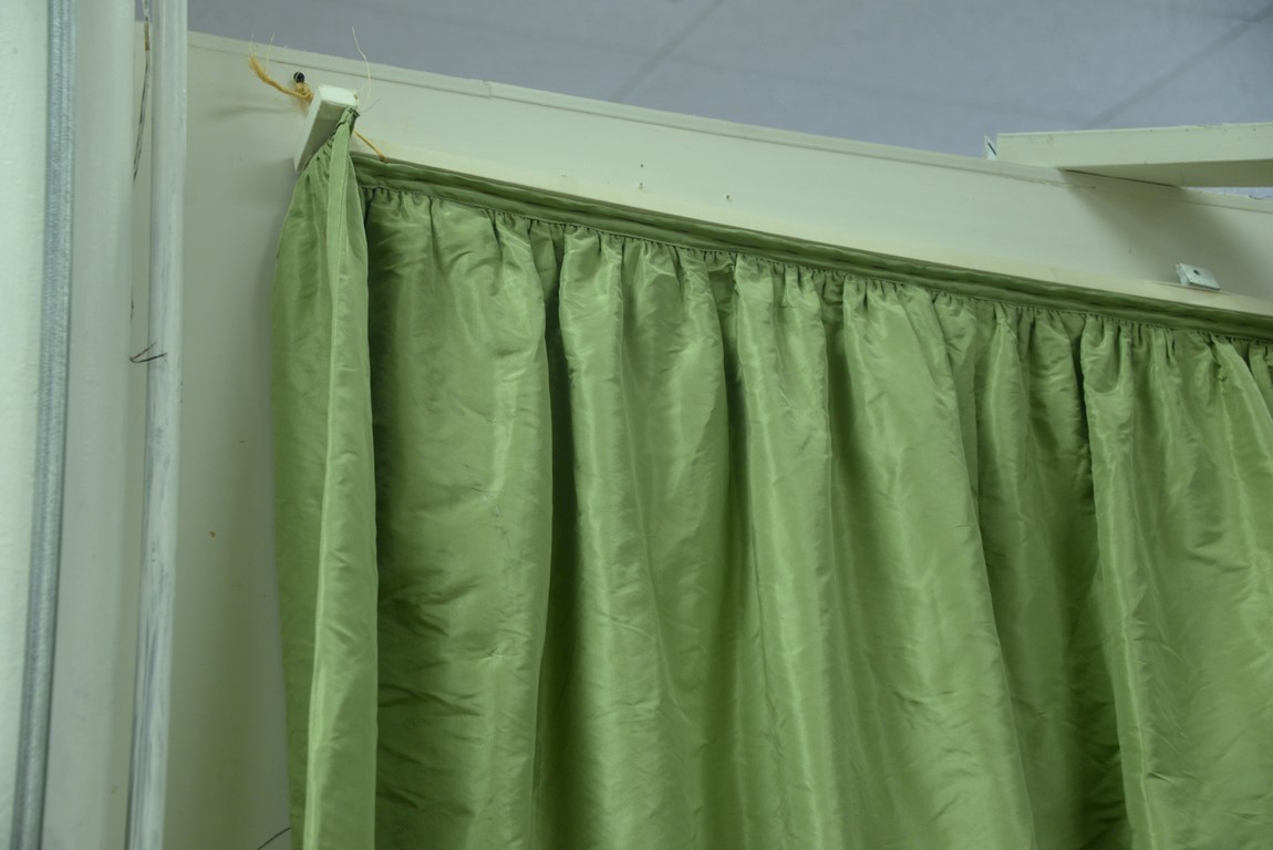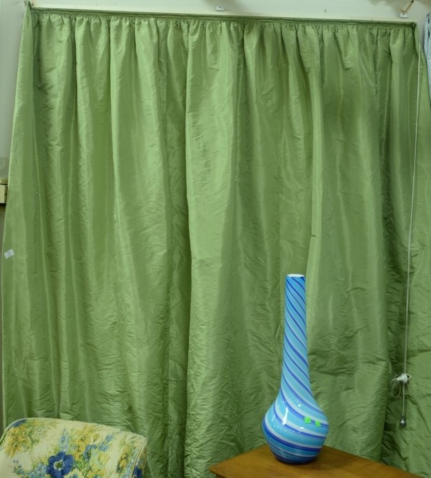 Lot 76: Custom green silk drapes, lined curtains, window treatment. approximate measurements: lg. 92in., wd. 64in.