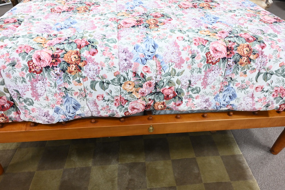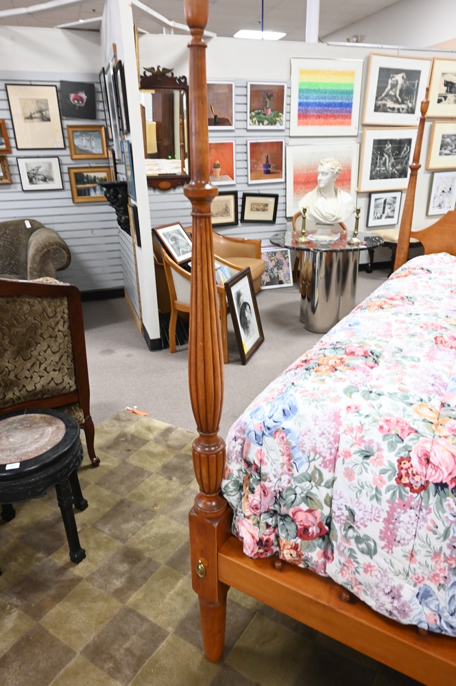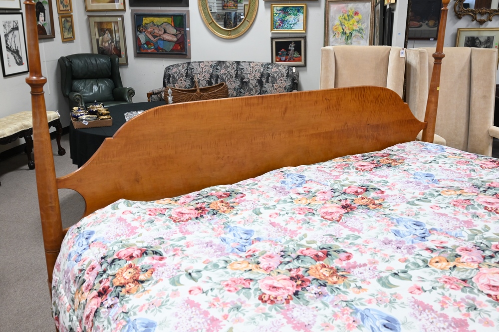Lot 76: Custom Tiger Maple King Size Four Post Bed, initialed HRK, to include headboard, foot board, and side rails, height 67 inches.