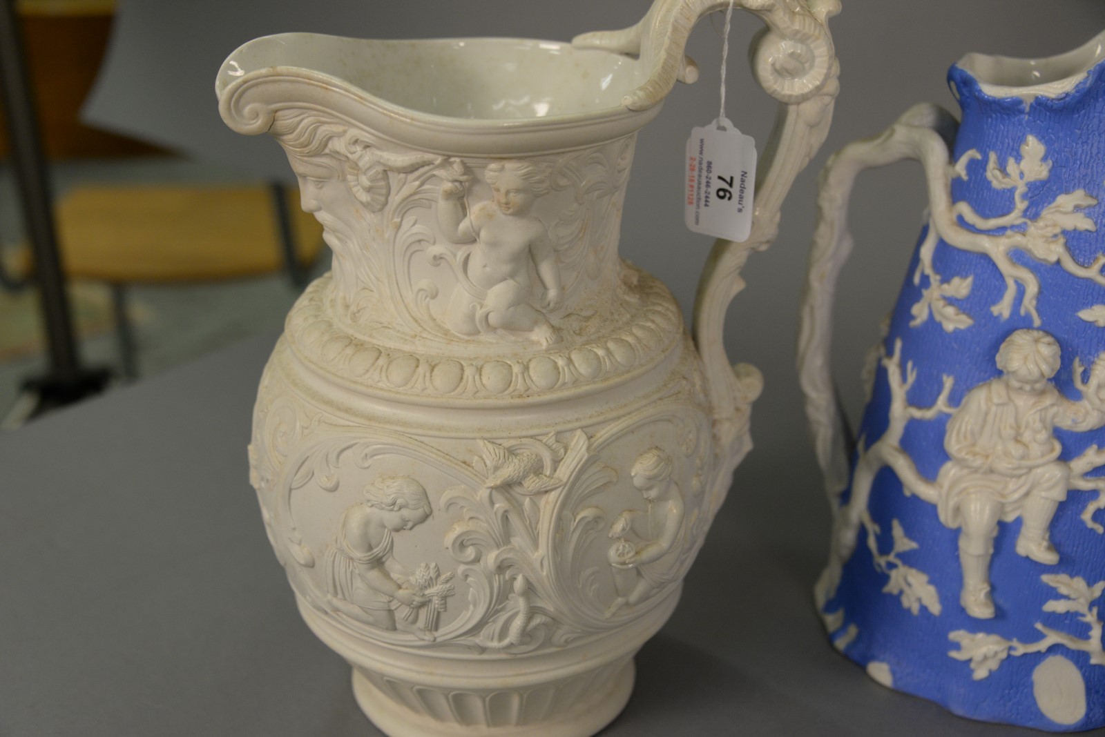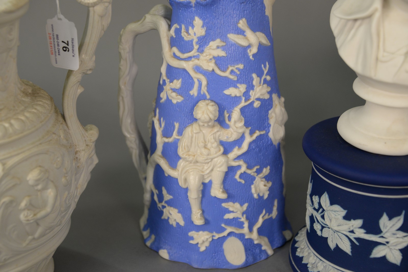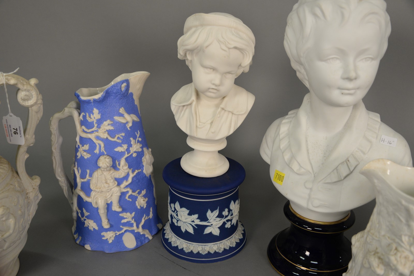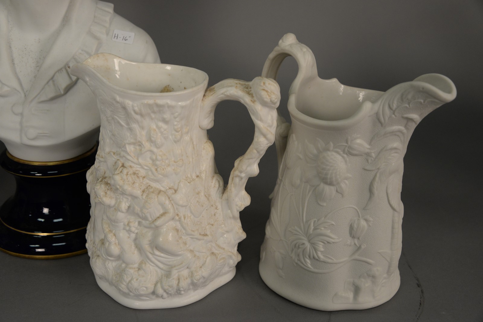 Lot 76: Four Parian porcelain figural jugs and two Parian busts, one by Limoges and other is Wedgwood bust on stand. tall bust: ht. 16 in.
