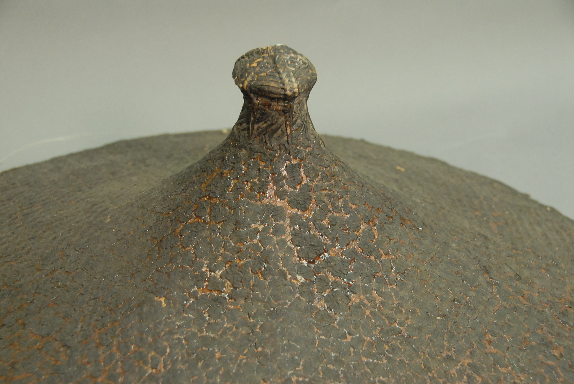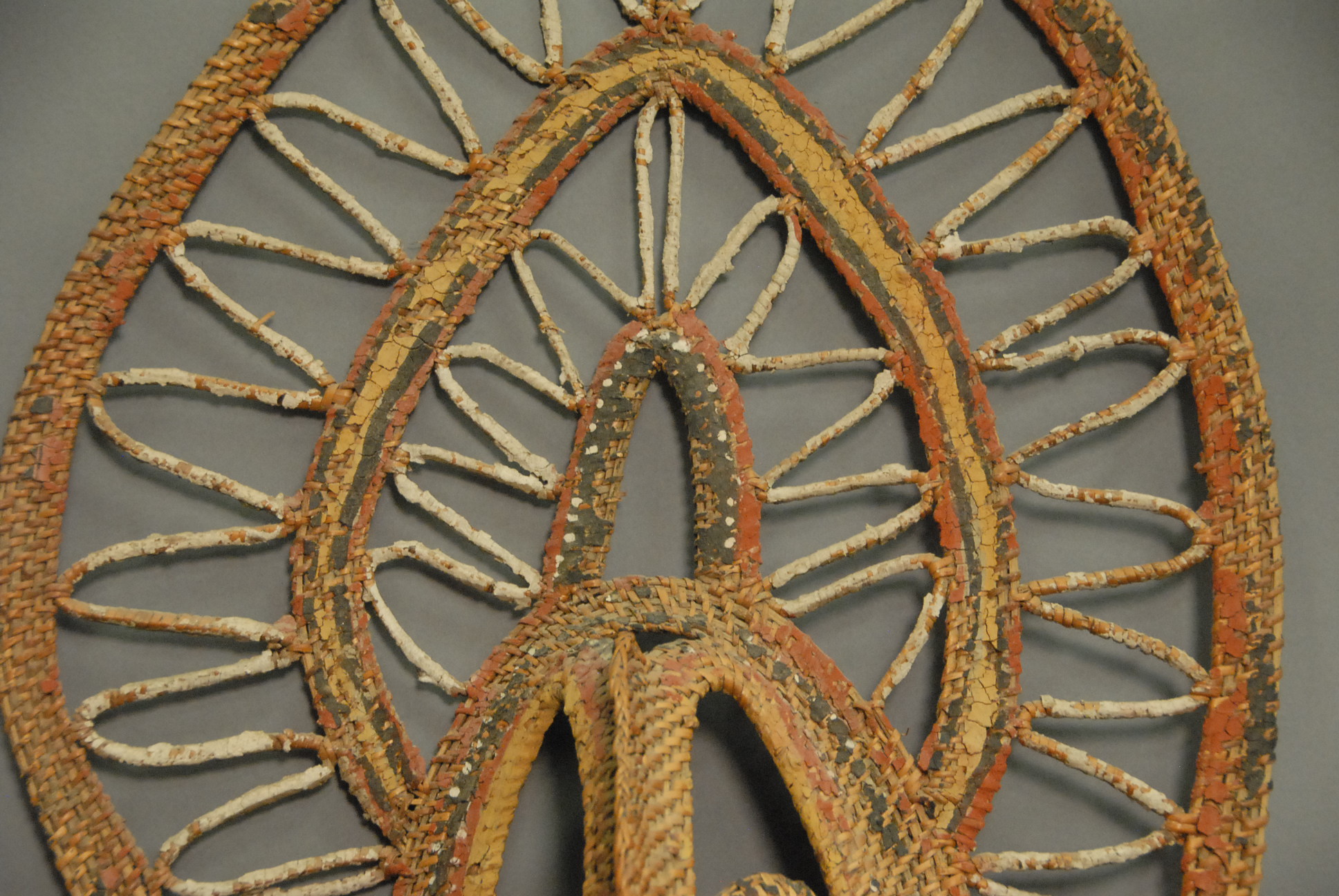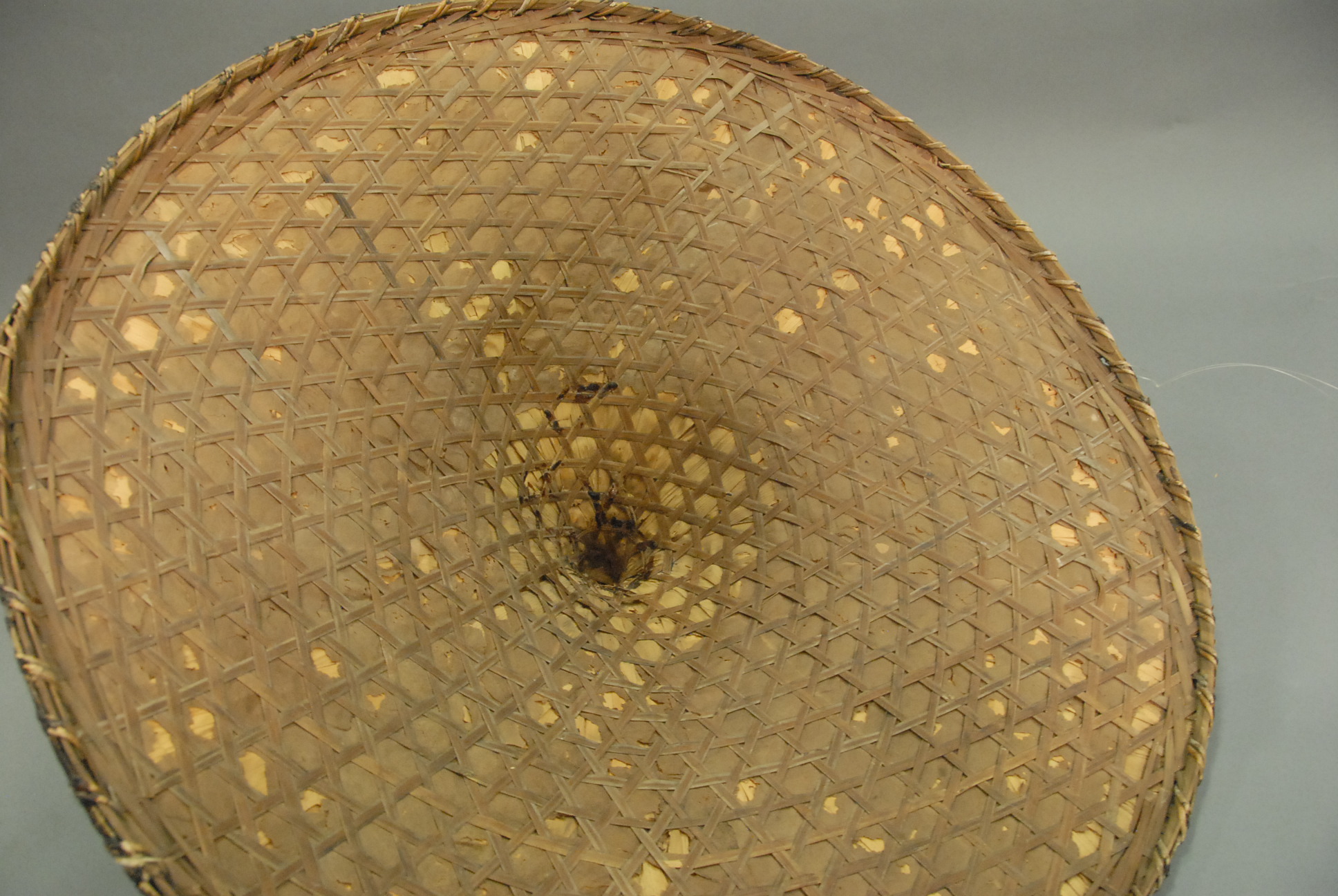 Four piece lot basketry mask from New Guinea, Indonesian hat, and two totems, probably South East Asia, ht. 9, dia. 25.