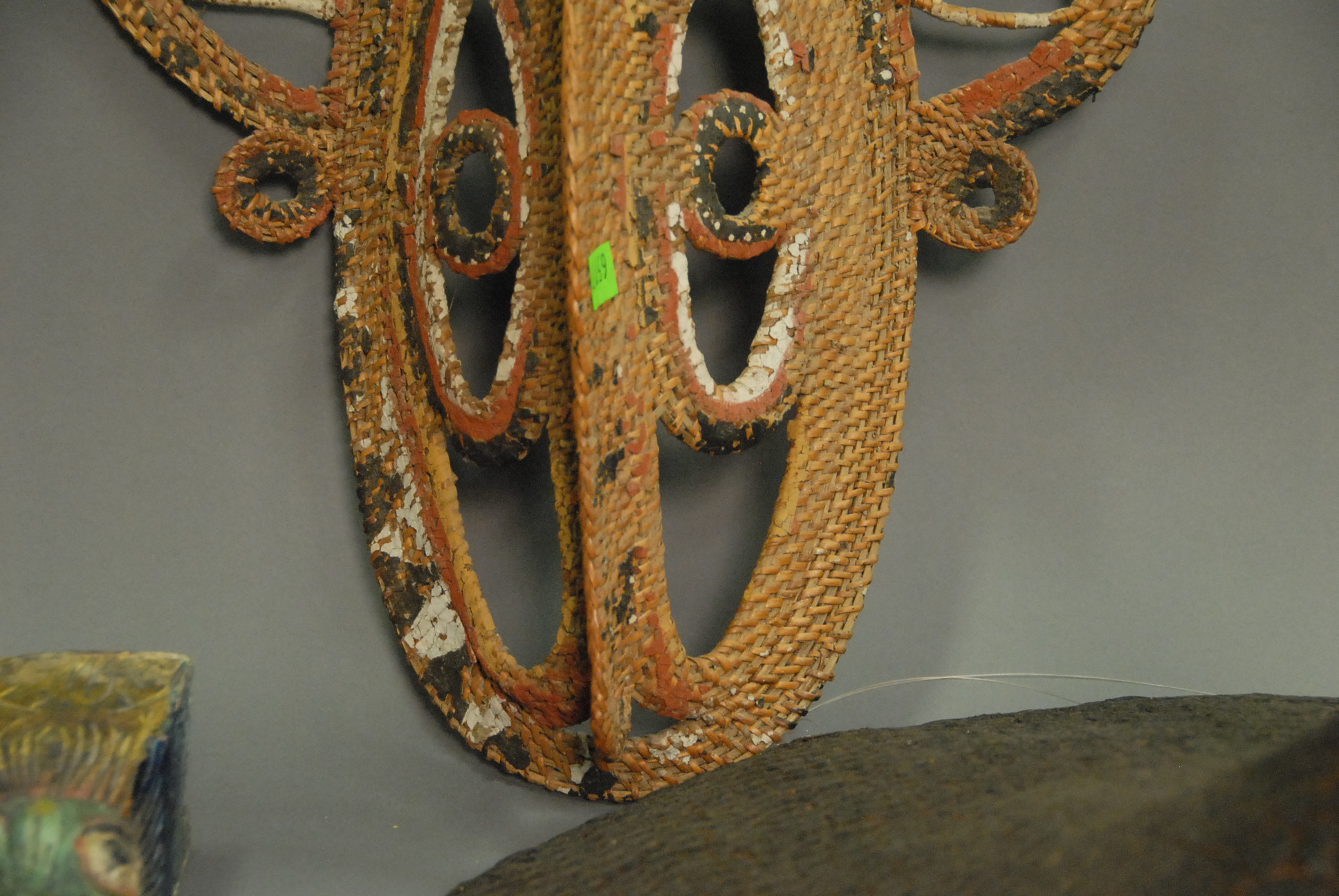 Lot 76: Four piece lot basketry mask from New Guinea, Indonesian hat, and two totems, probably South East Asia, ht