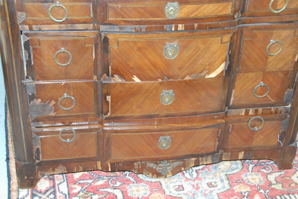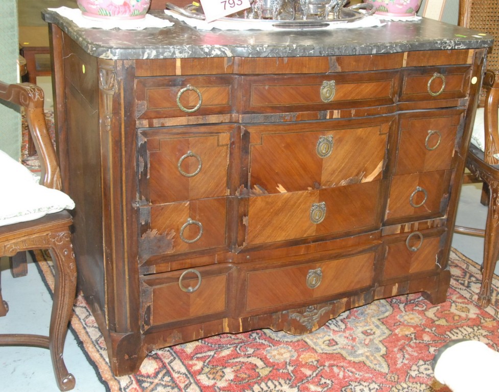 Lot 76: French commode with grey marble top and four drawers, 19th century veneer damage, ht. 32in. wd. 44in.