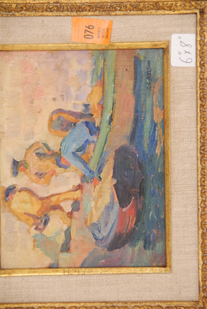 George Laurence Nelson 1887-1978 oil on board painting of men in boat signed lower right C. L. Nelson.