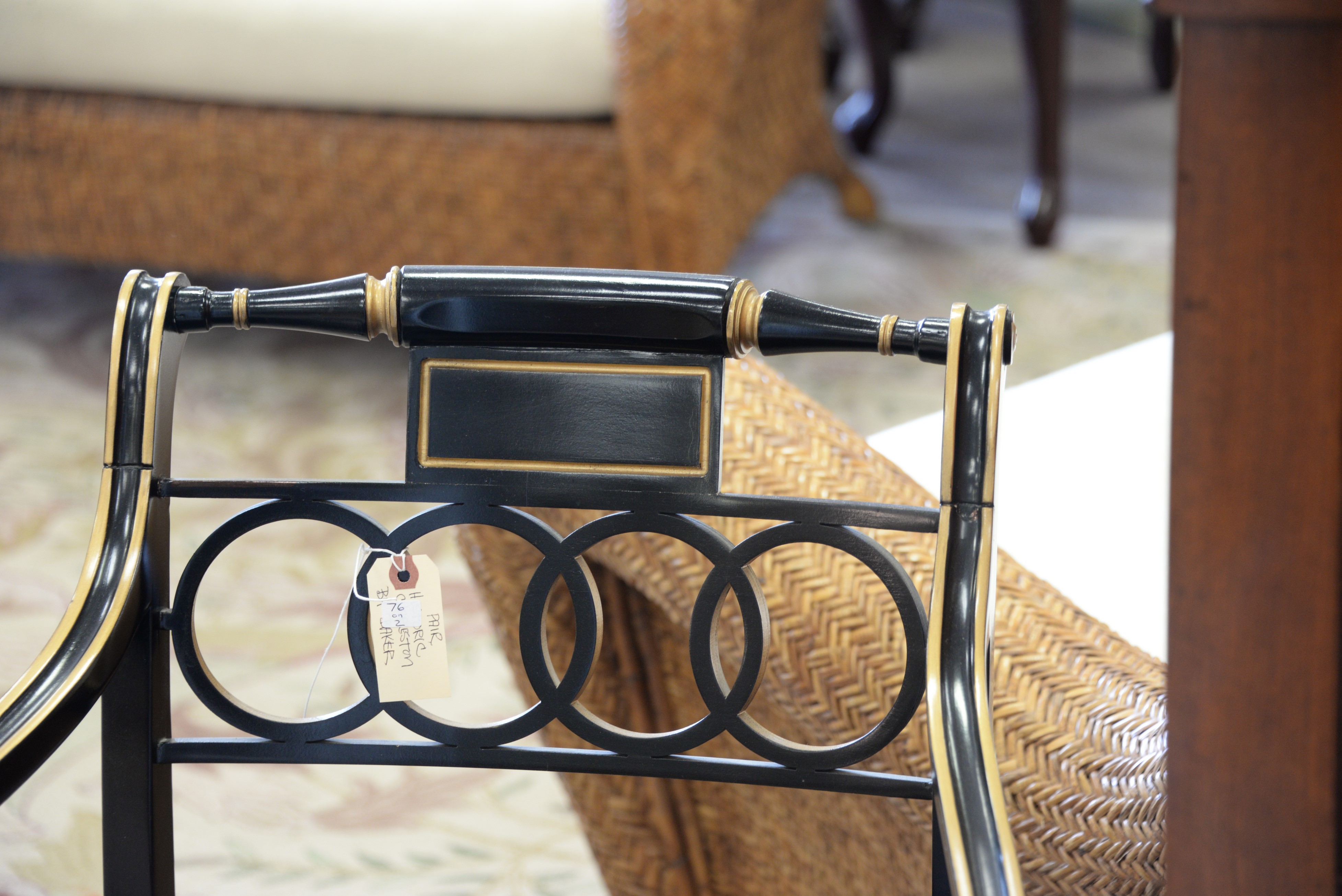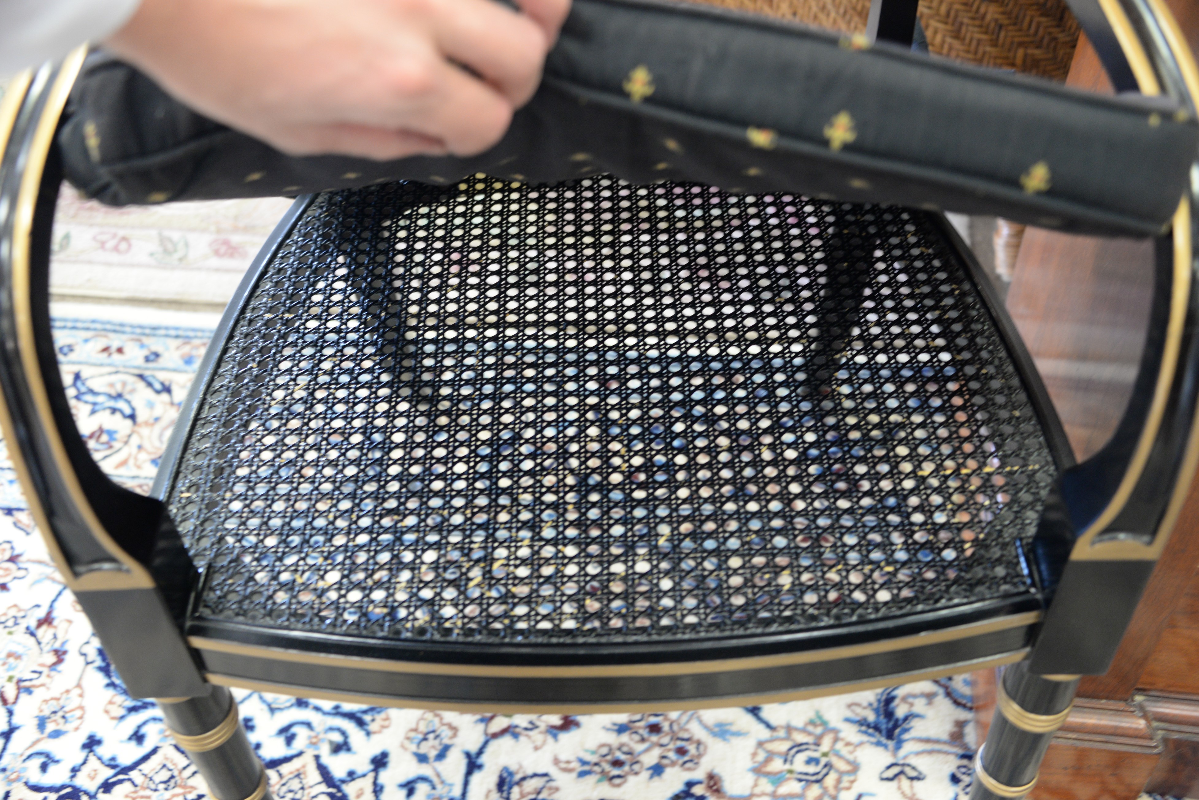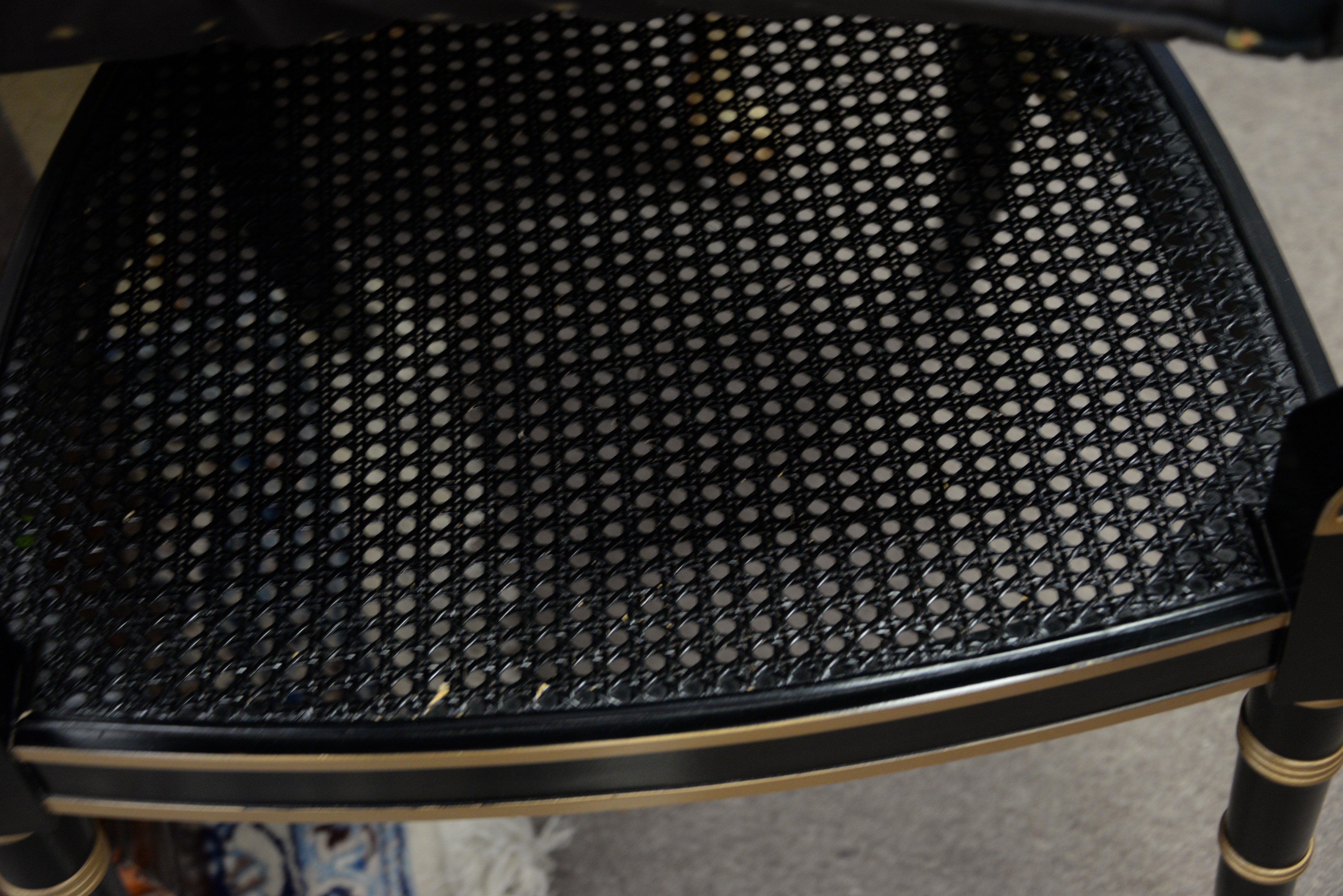 Historic Charleston by Baker, pair of black and gold armchairs with caned seats.