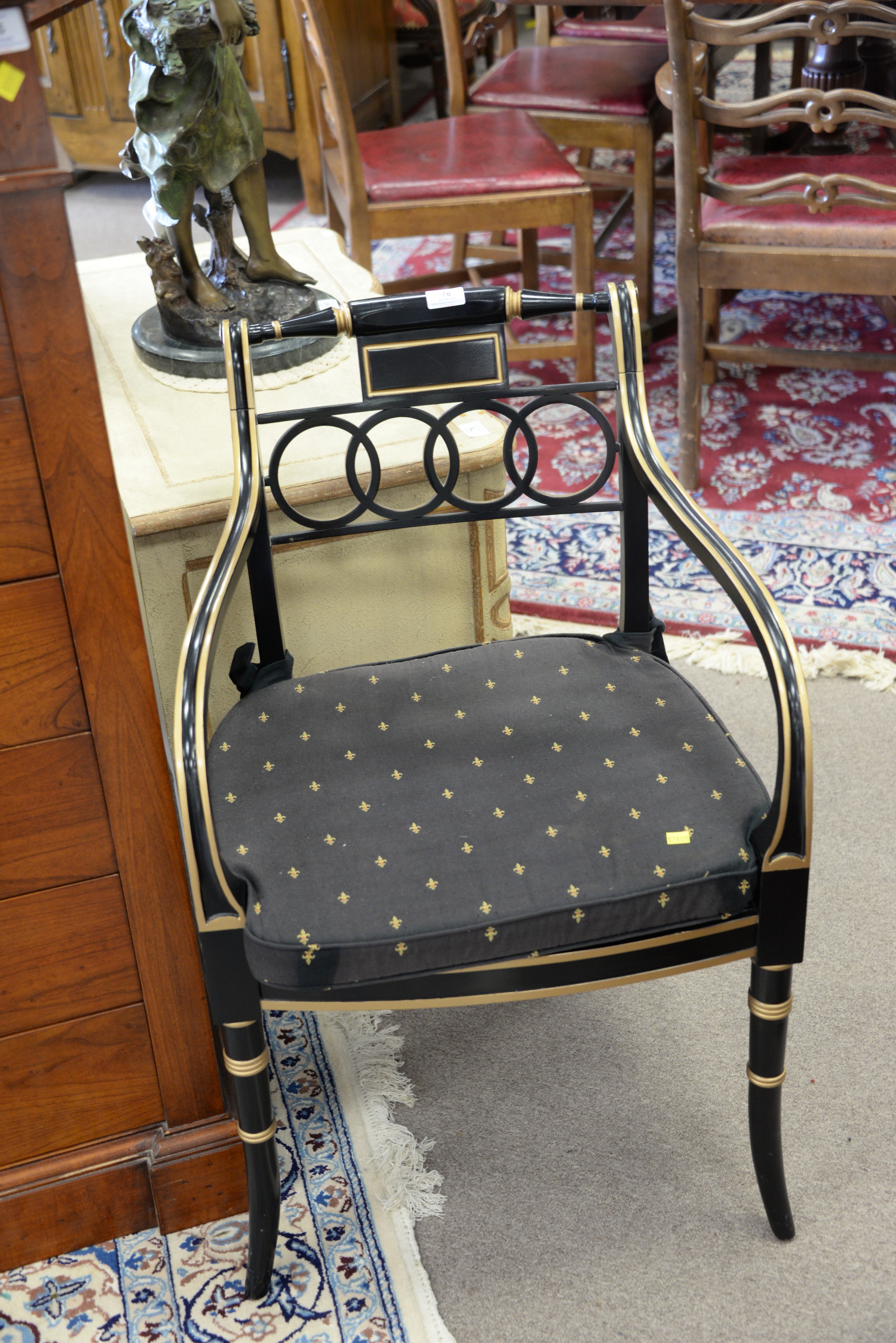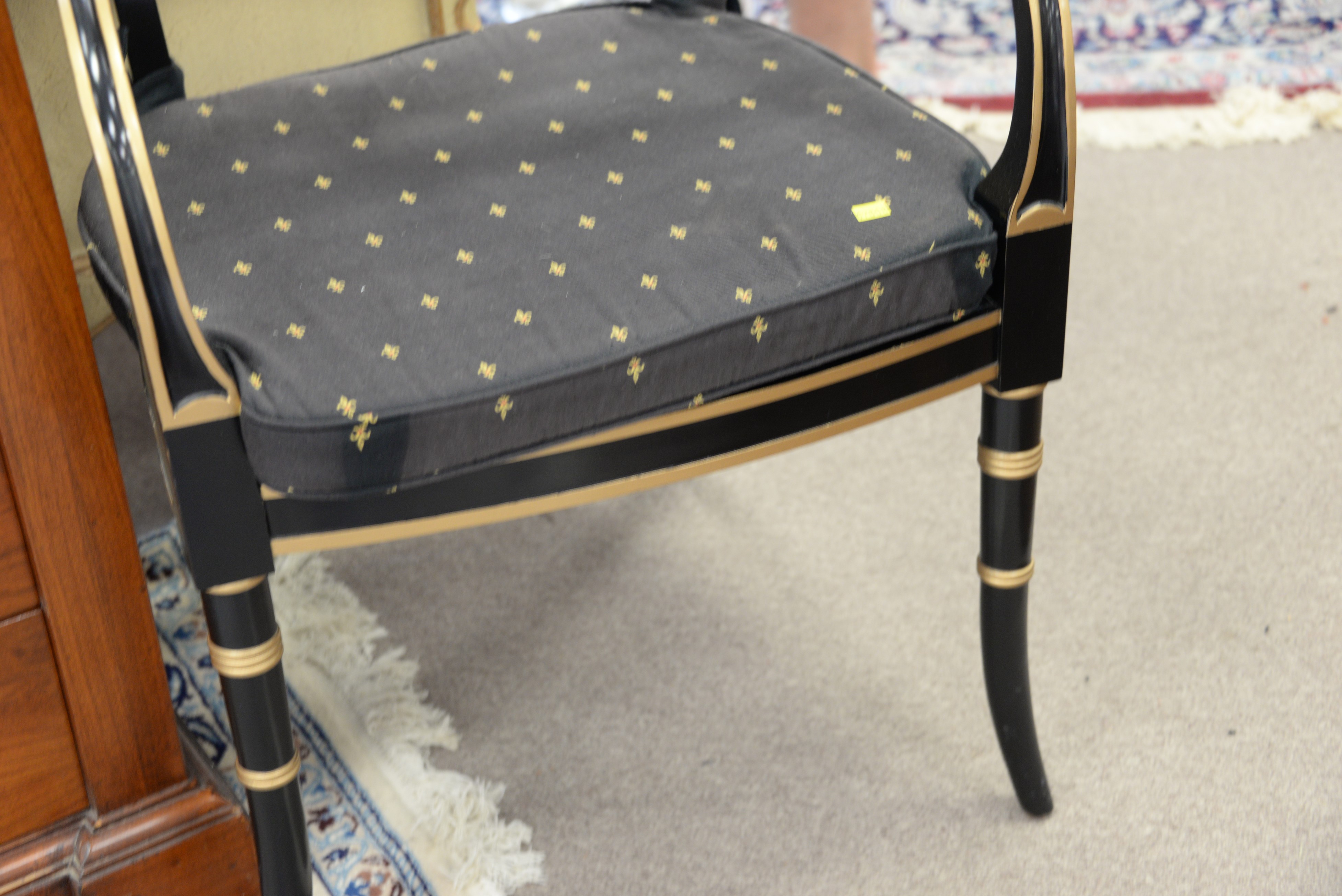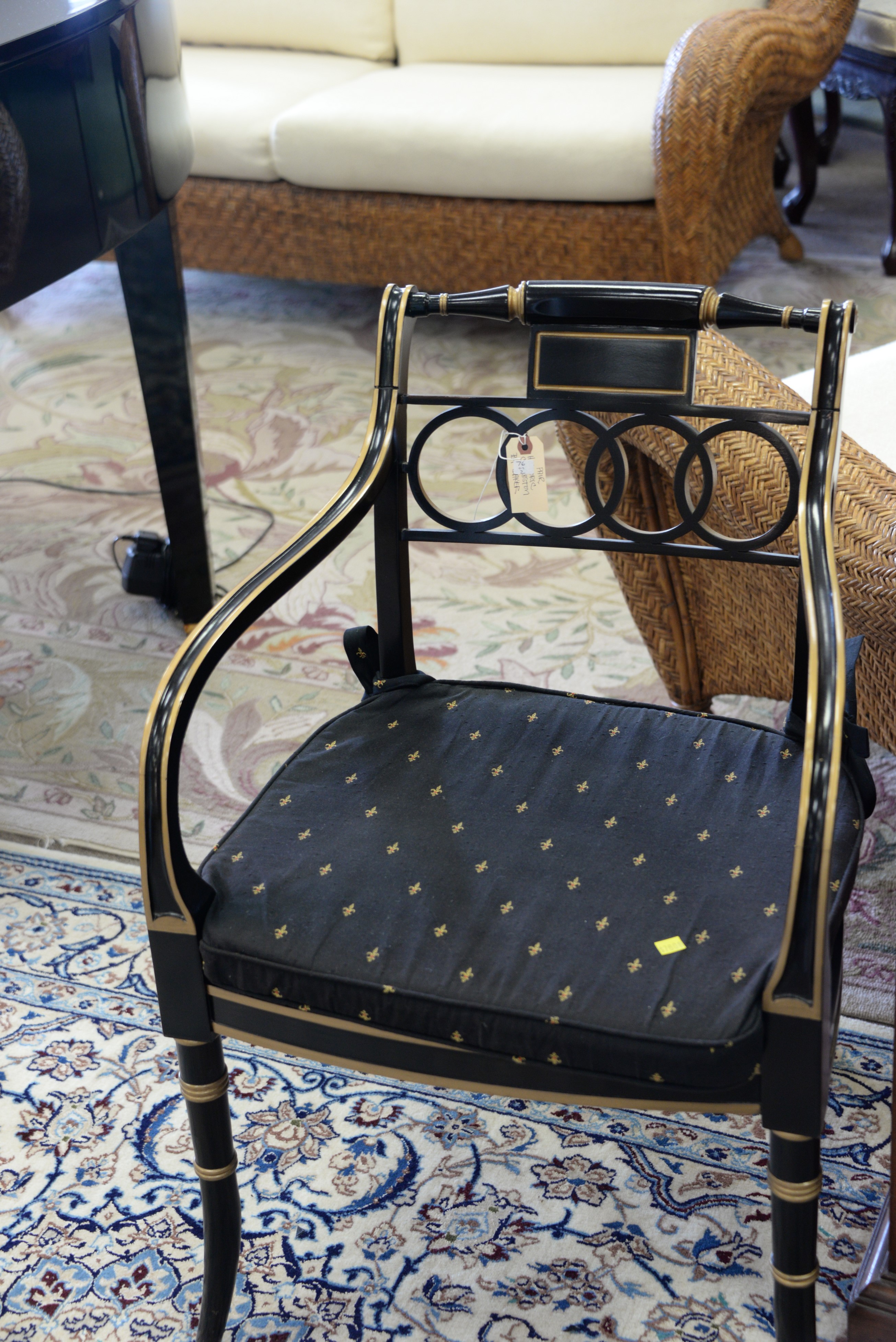 Historic Charleston by Baker, pair of black and gold armchairs with caned seats.
