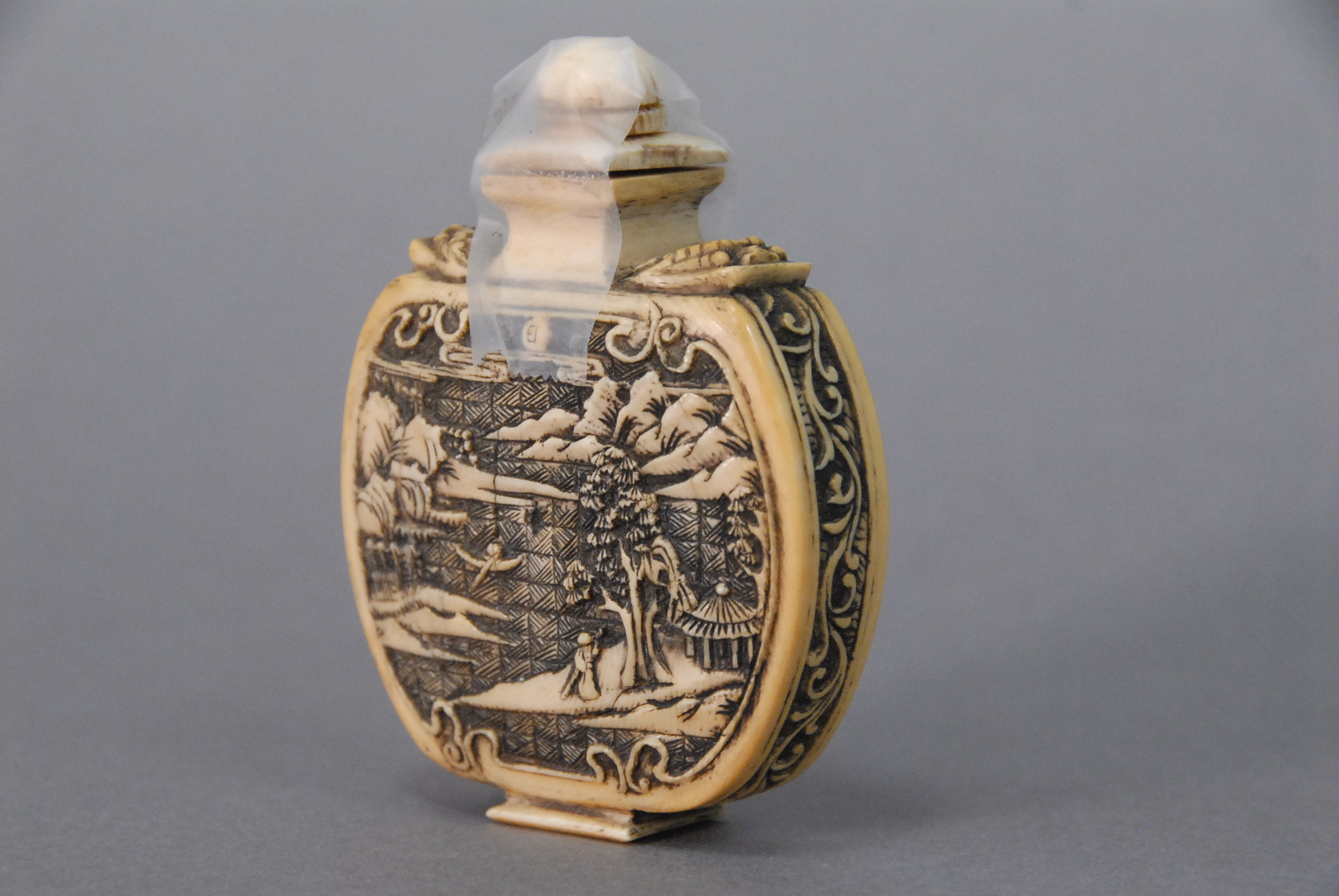 Lot 76: Ivory snuff bottle with carved landscape scene on both sides and carved foo dog head near neck, ht. 3 1/4.