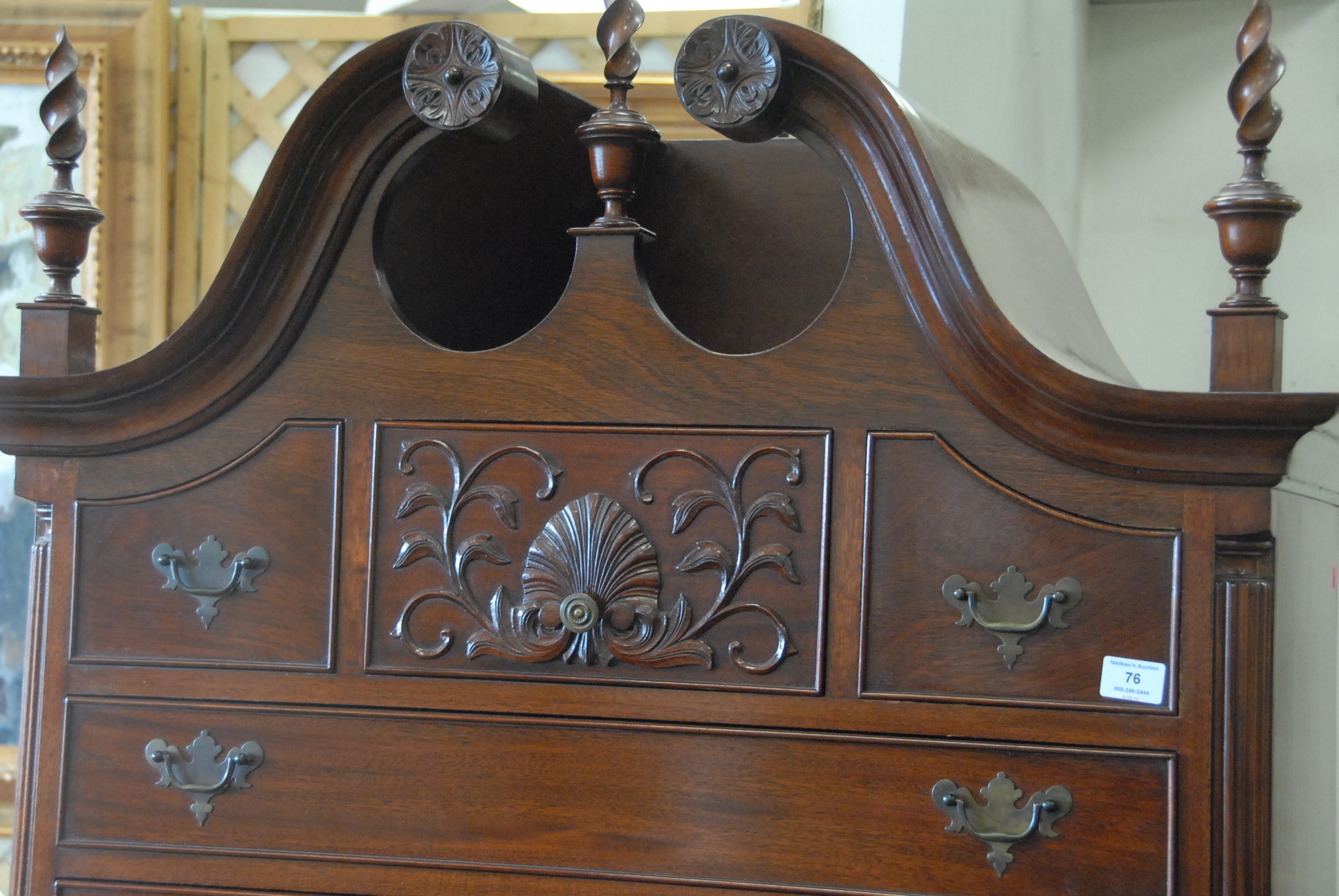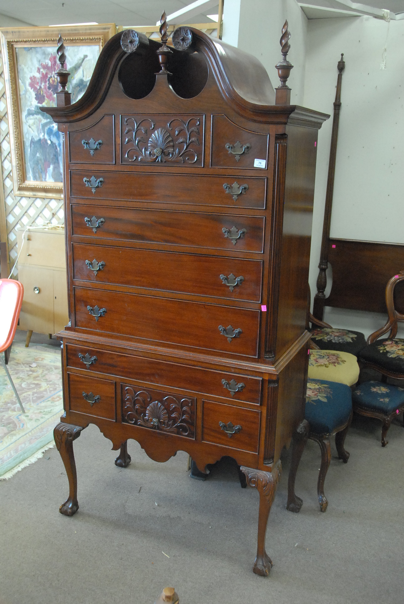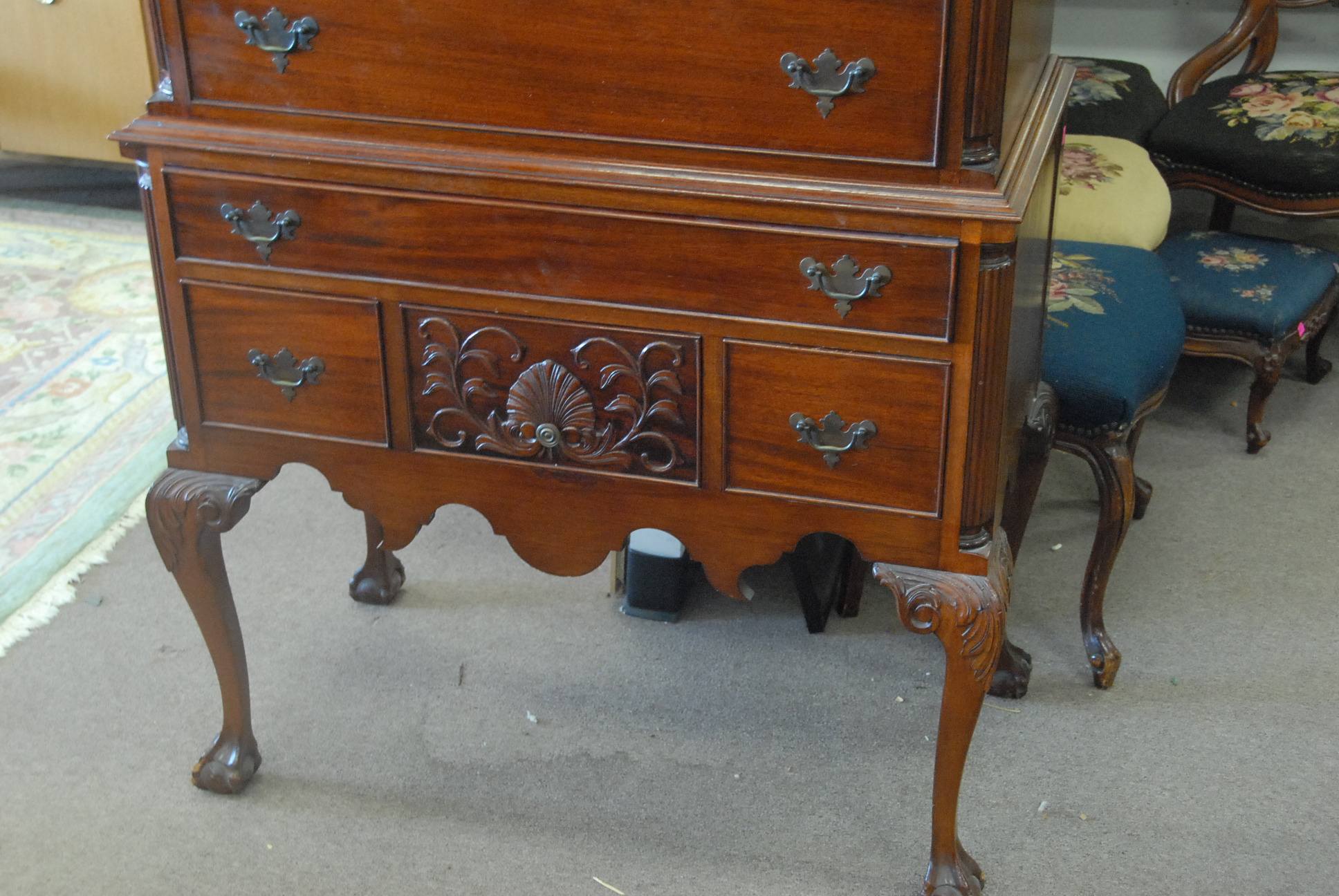 Lot 76: Kaplan Furniture Company custom mahogany Chippendale style highboy with shell carved center drawers, ht. 81, wd. 38 1/2, dp. 20.