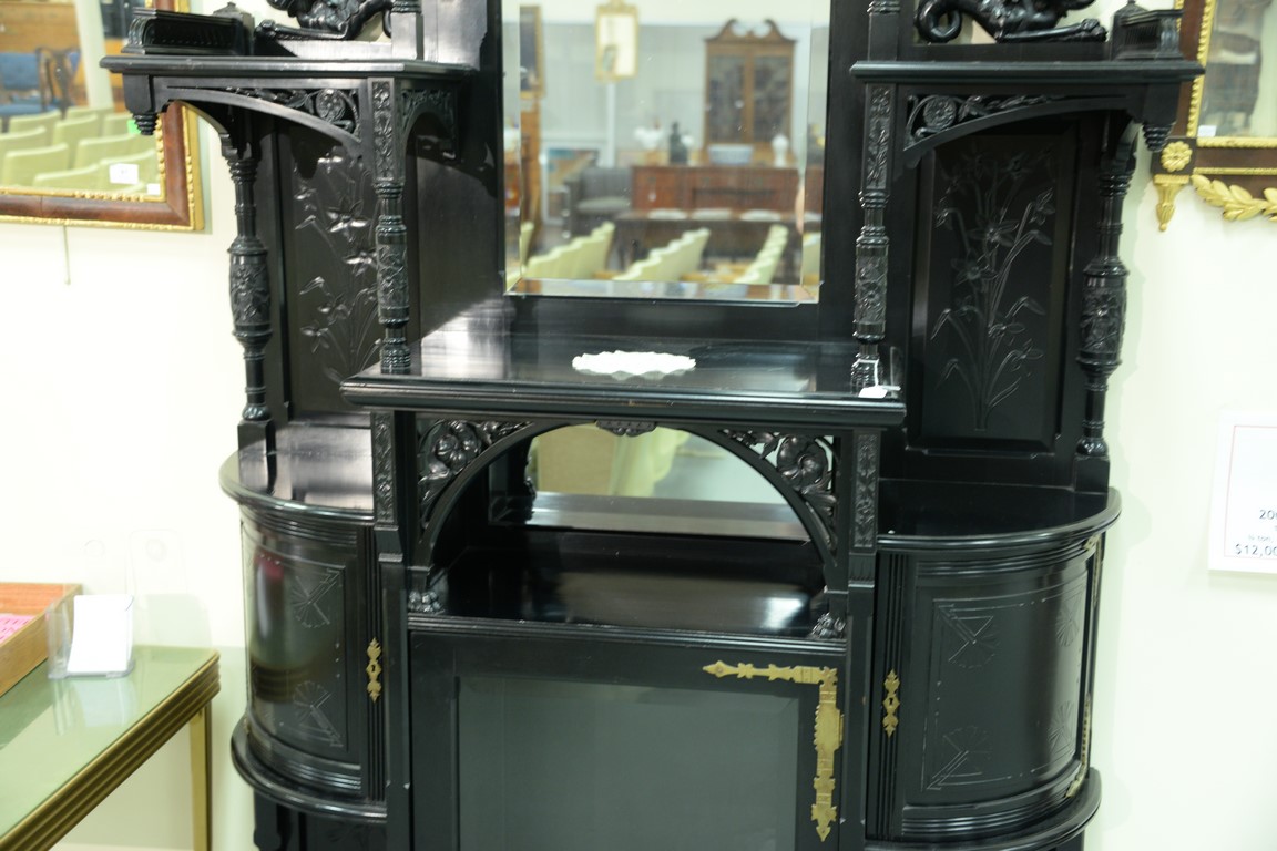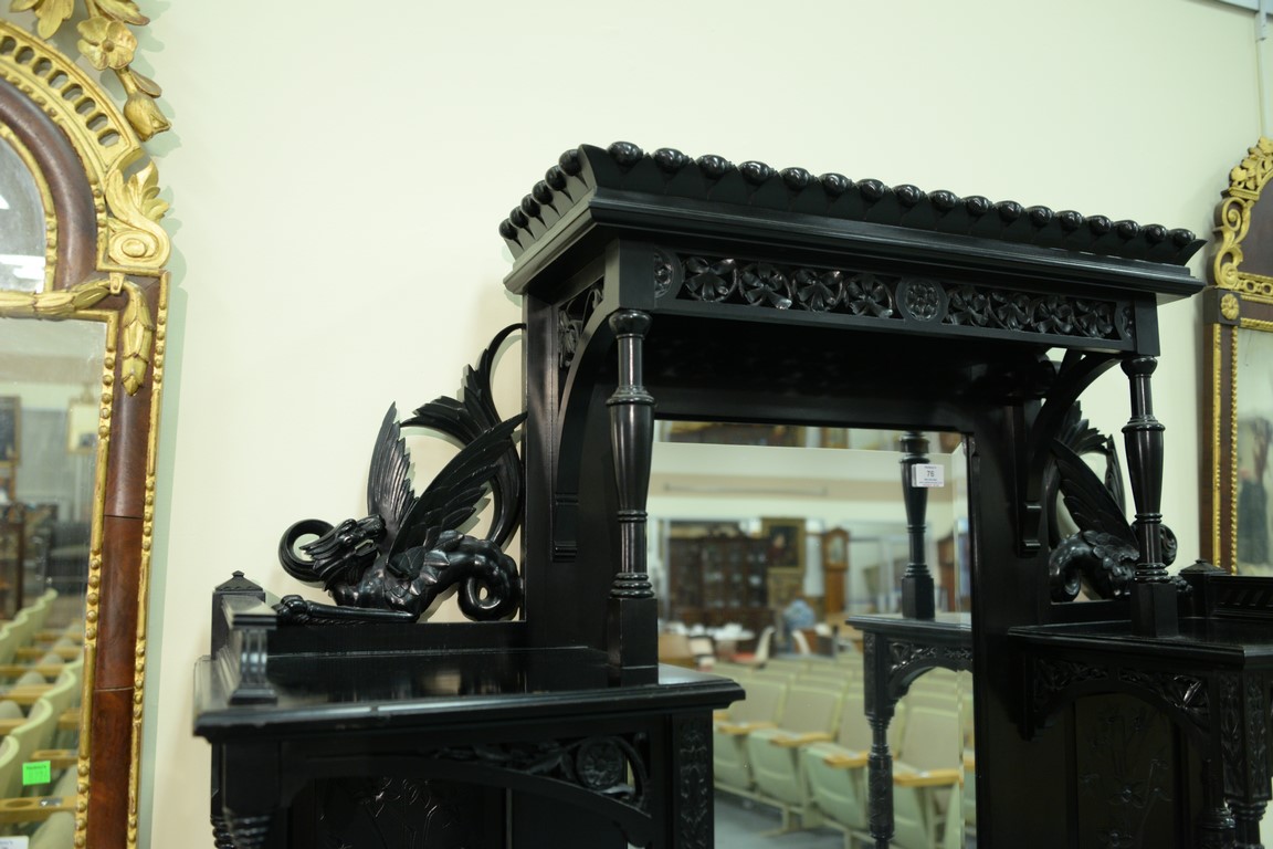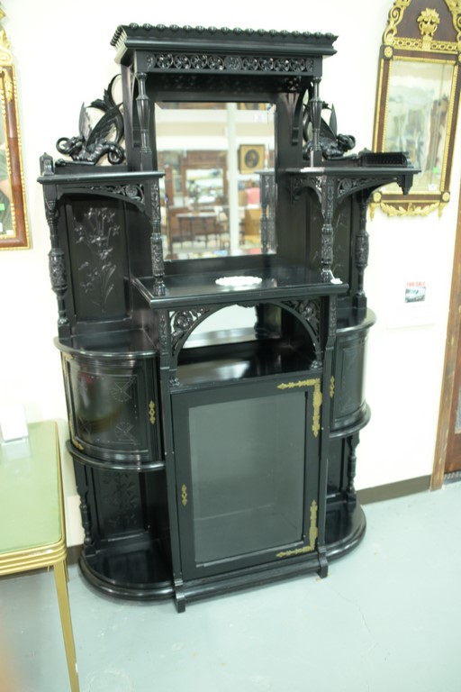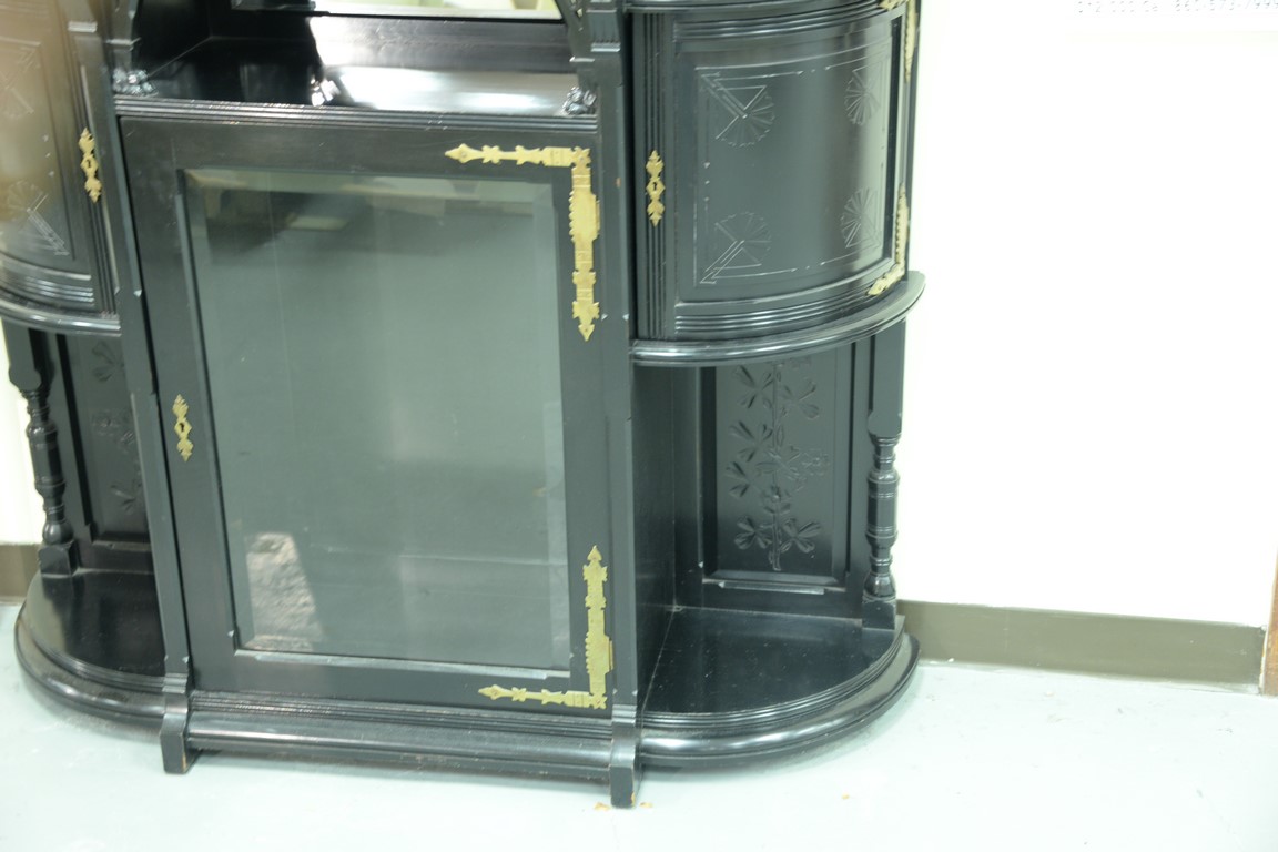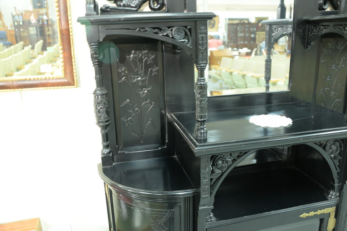 Lot 76: Kimbel & Cabus aesthetic ebonized etagere having centered mirror flanked by carved winged dragons over shelves and two bowed doors a…