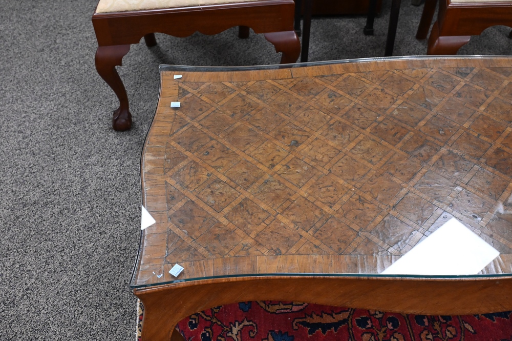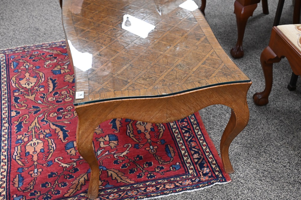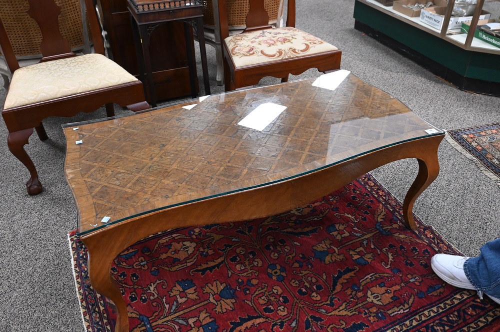 Lot 76: Louis XV Style Coffee Table, having parquetry inlaid top, height 18 inches, top 23 1/2″ x 48″.