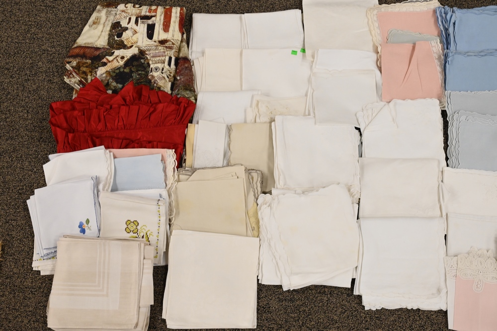 Miscellaneous Lot of Table Linens, to include a round linen Asian themed table cover, a red table cover, along with a large lot of napkin sets, including linen, Damask and cotton, various sizes, condition consistent with wear, some stains.