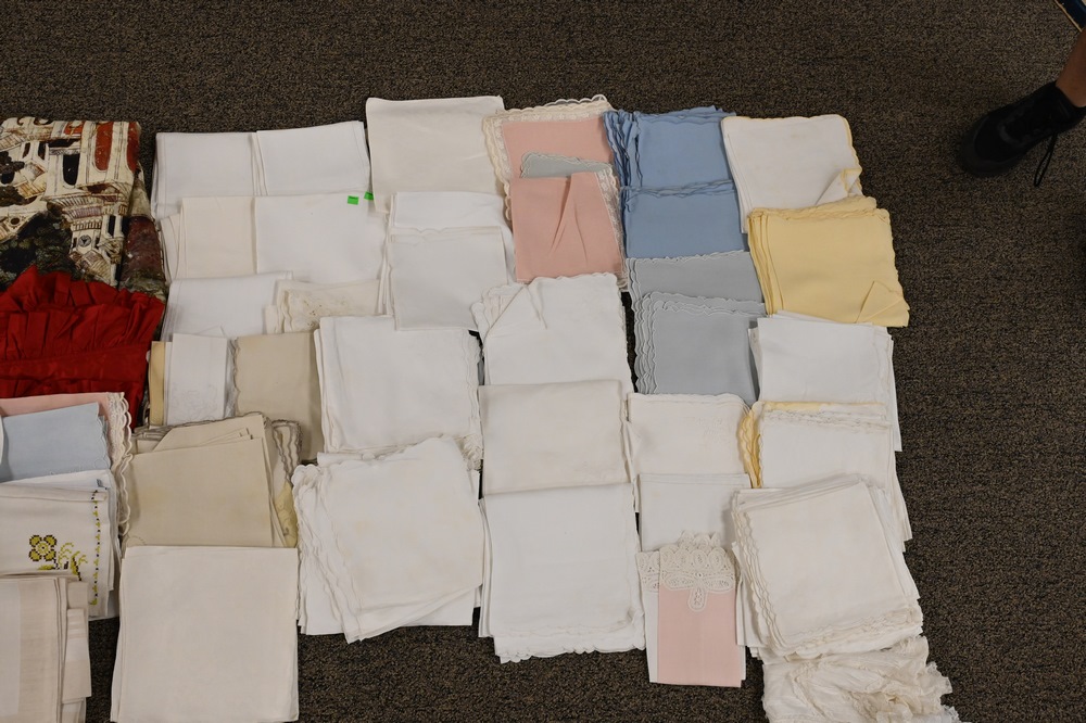 Lot 76: Miscellaneous Lot of Table Linens, to include a round linen Asian themed table cover, a red table cover, along with a large lot of n…