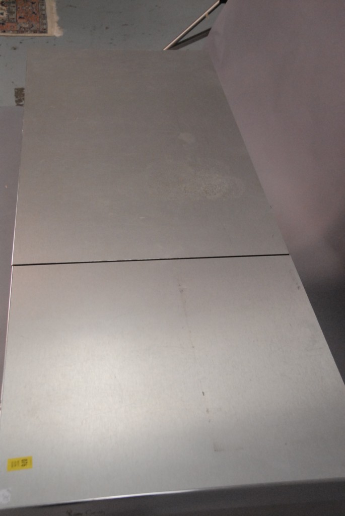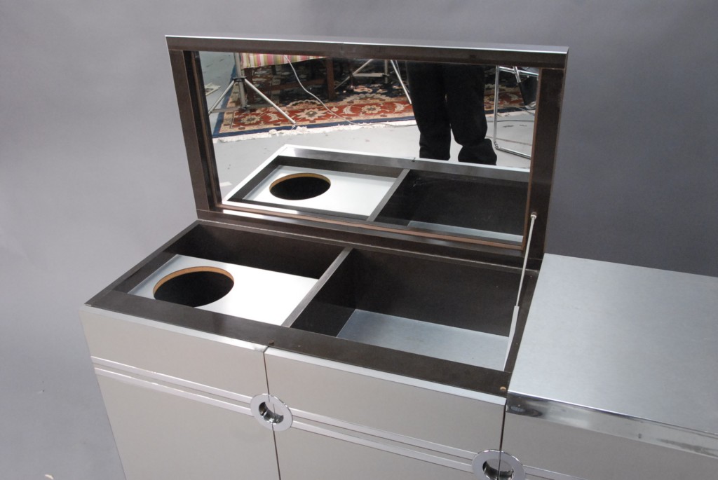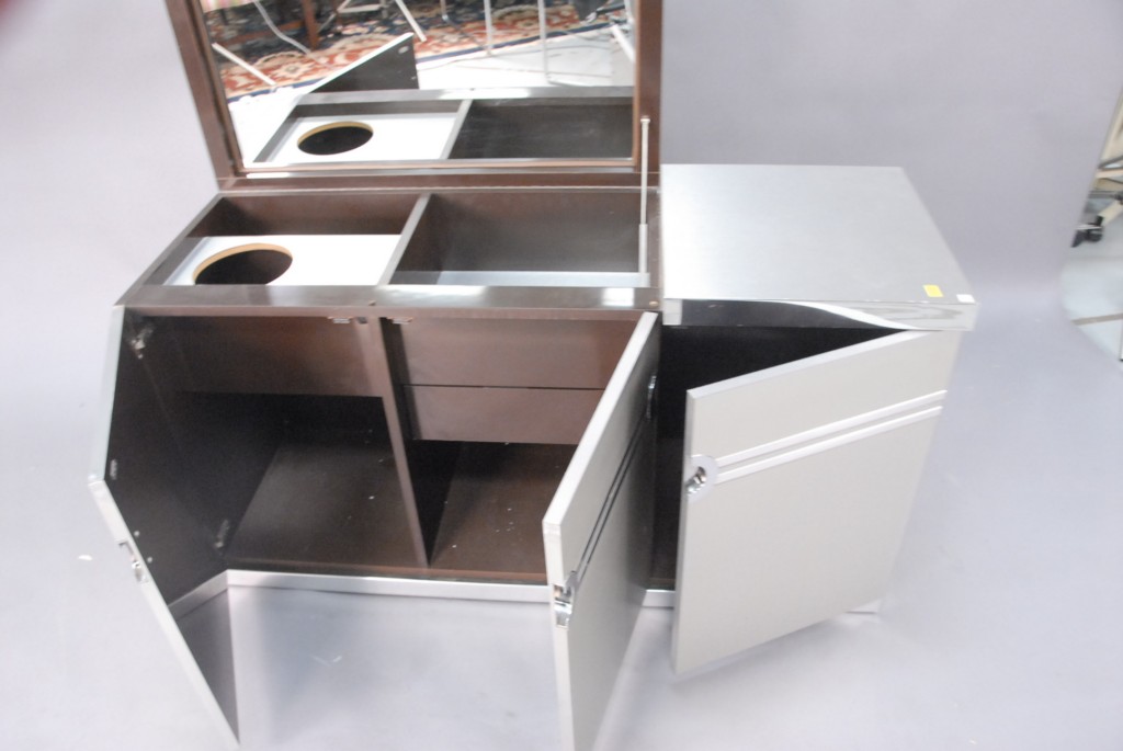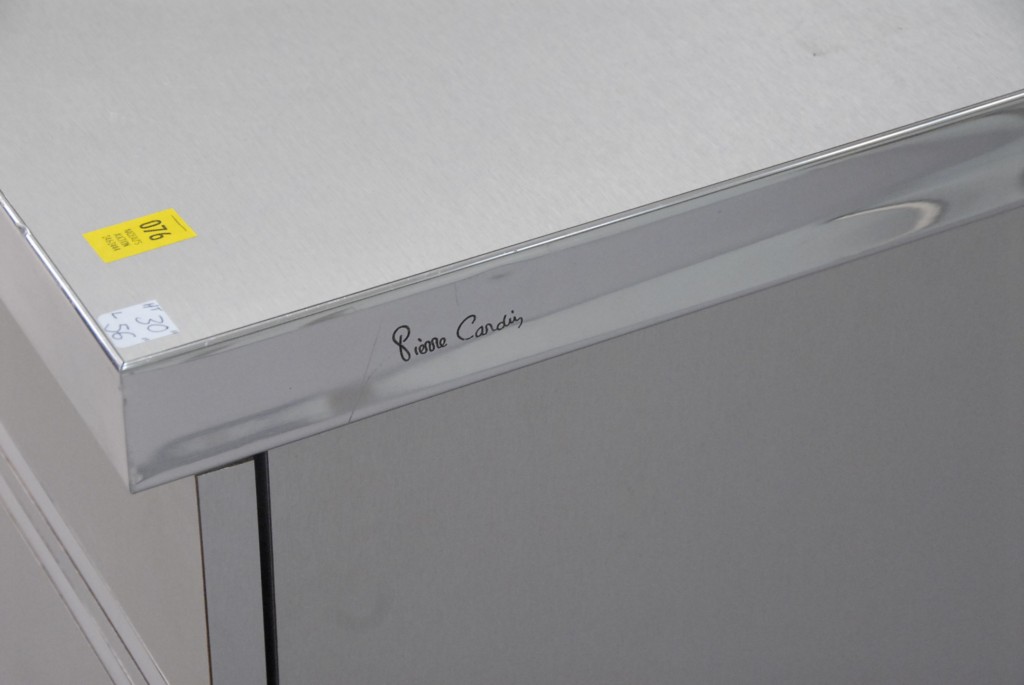 Lot 76: Pierre Cardin chrome and brushed metal bar / server signed Pierre Cardin on side of lift top, interior mirror, and doors opening to …