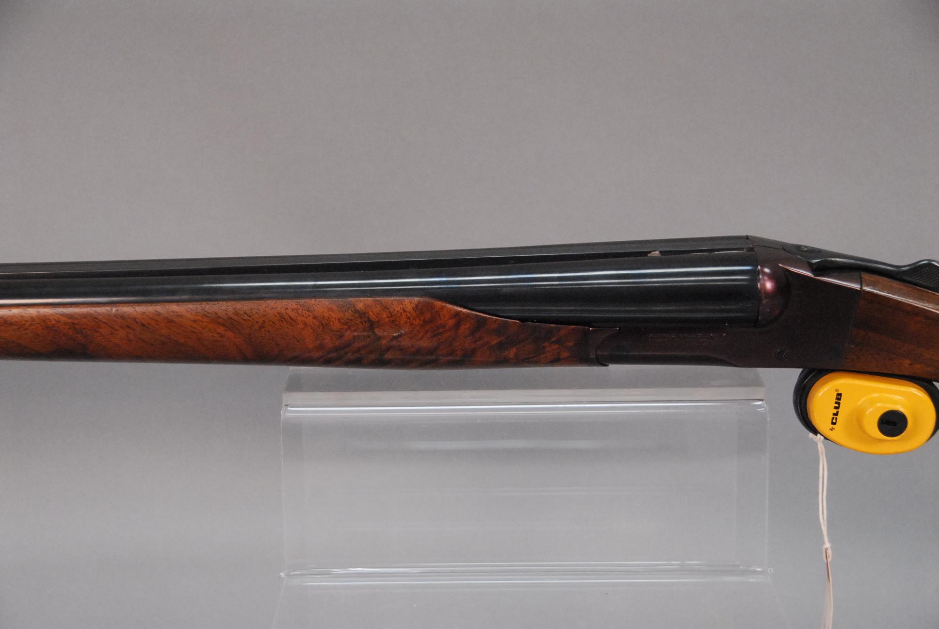 Lot 76: Riverside Arms side by side shotgun, 12 gauge with mahogany stock, 30 barrels marked High Pressure Compressed Steel Barrel and Lug …