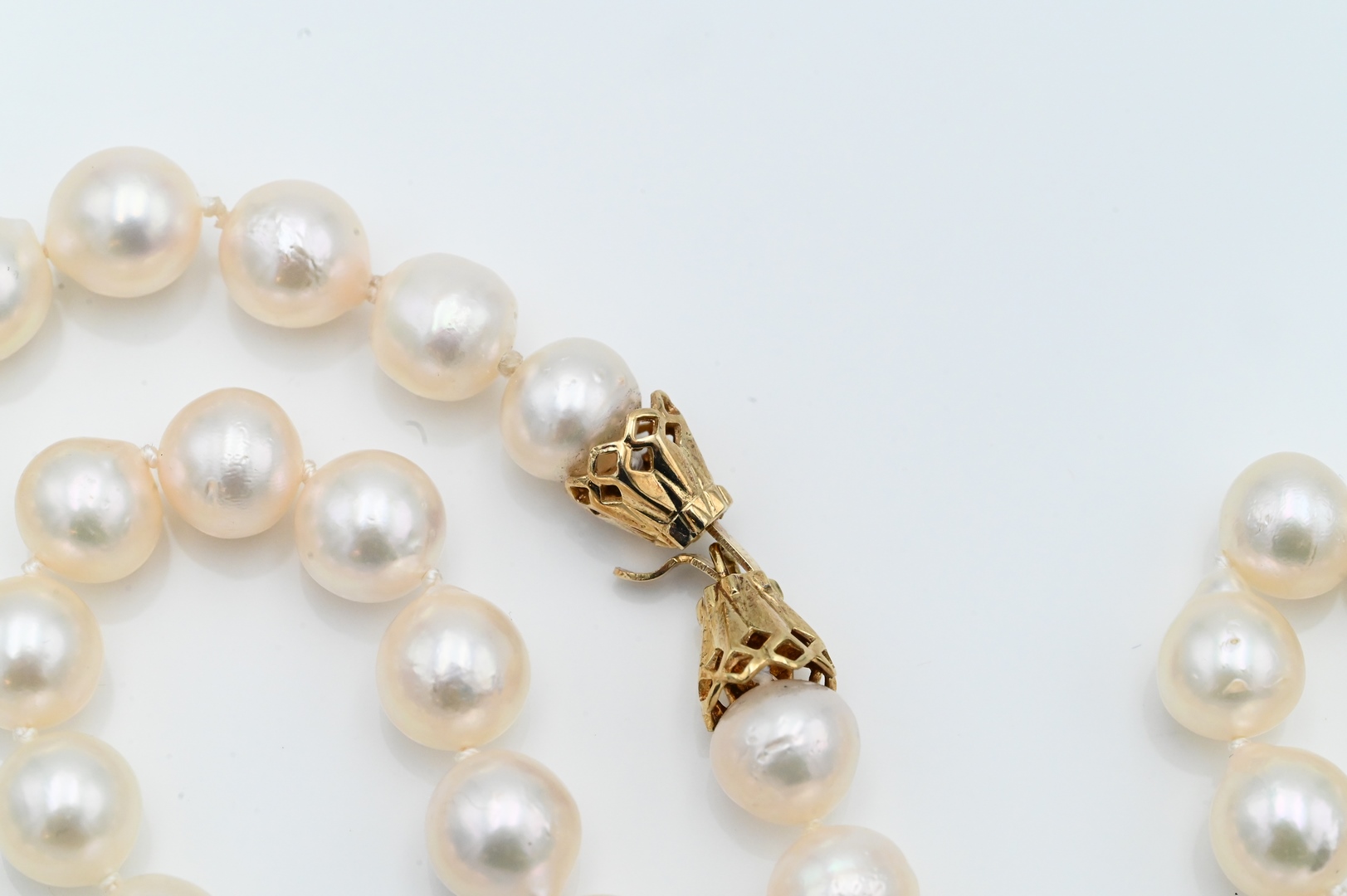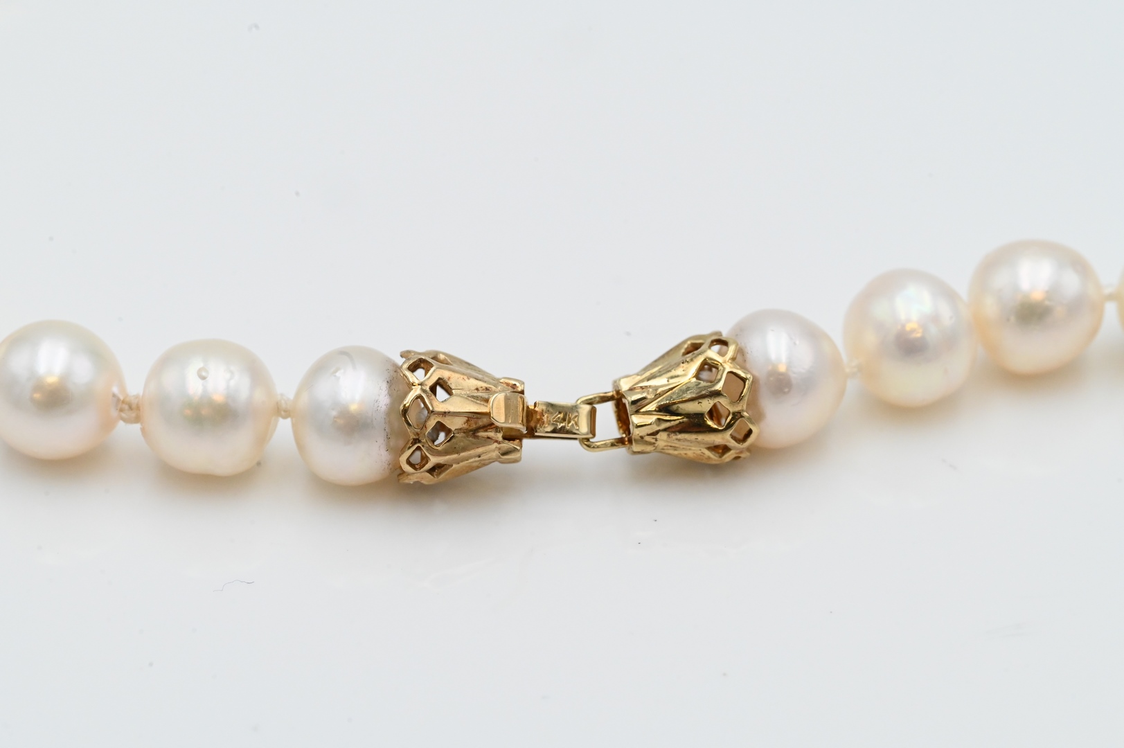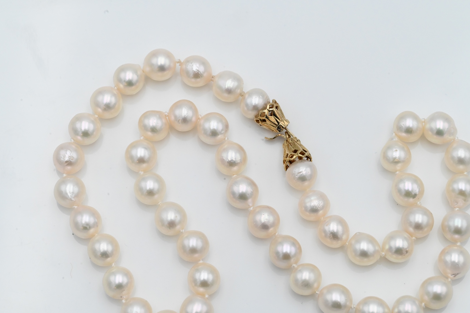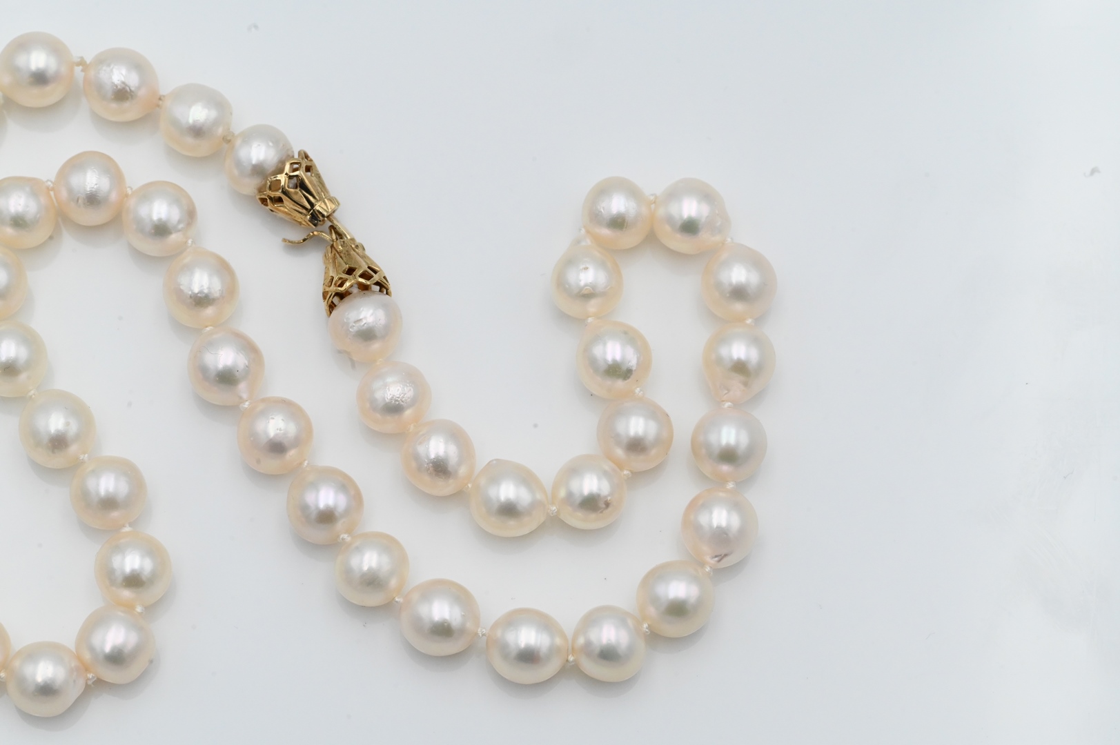 Single Strand of Pearls having 14 Karat yellow gold clasp marked 14K length 17 inches, 8.6 – 8.7 millimeters Condition: good condition