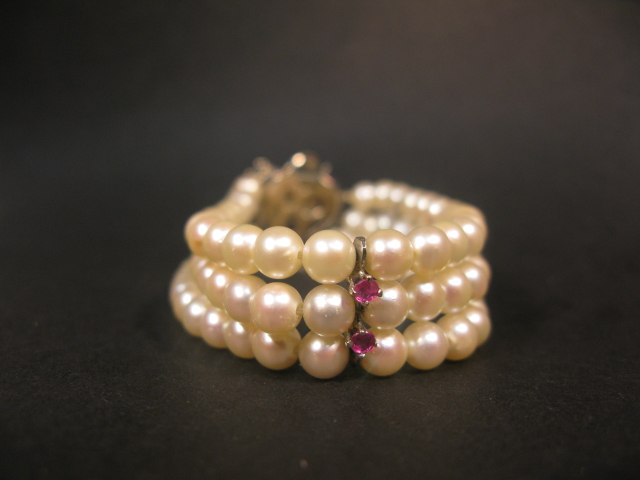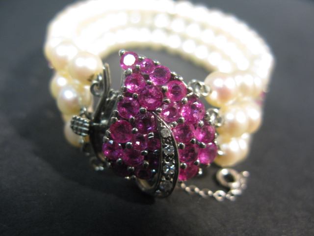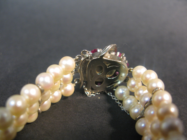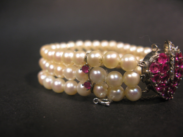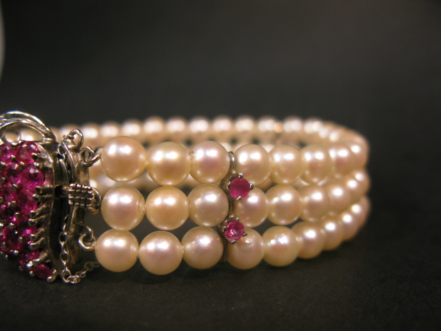 Triple strand pearl bracelet set with a 14K white gold clasp set in a heart shape set with rubies.
