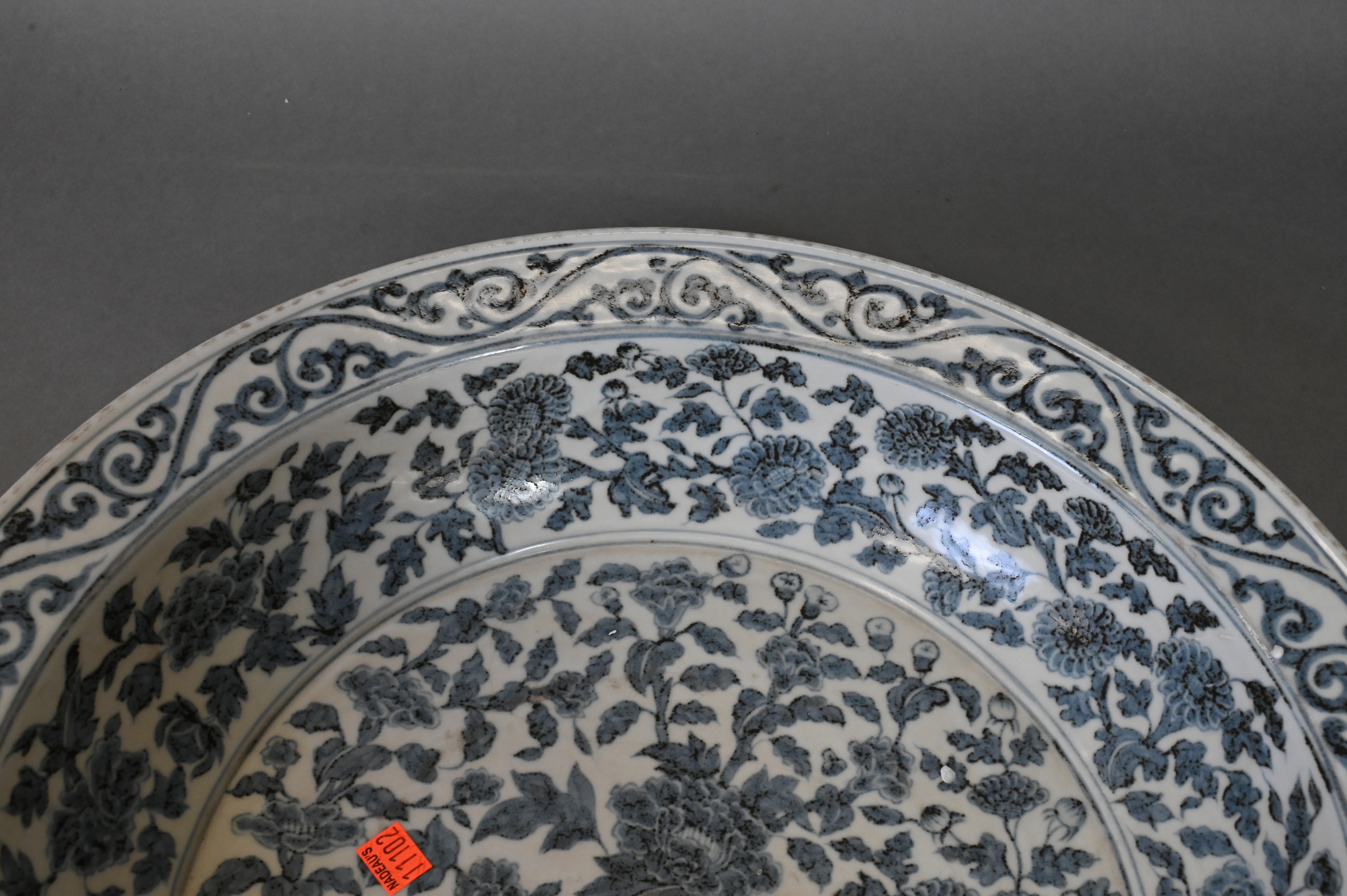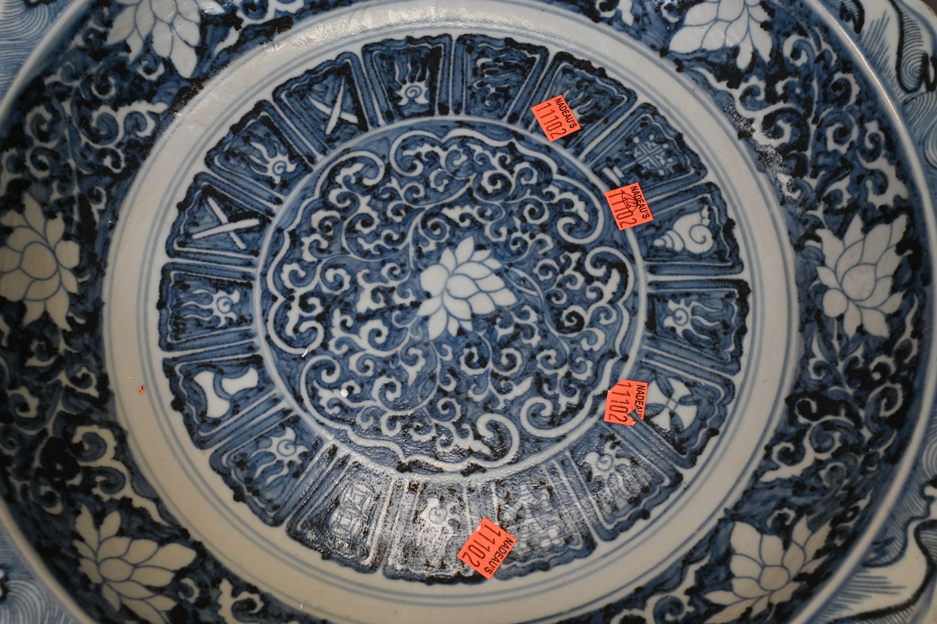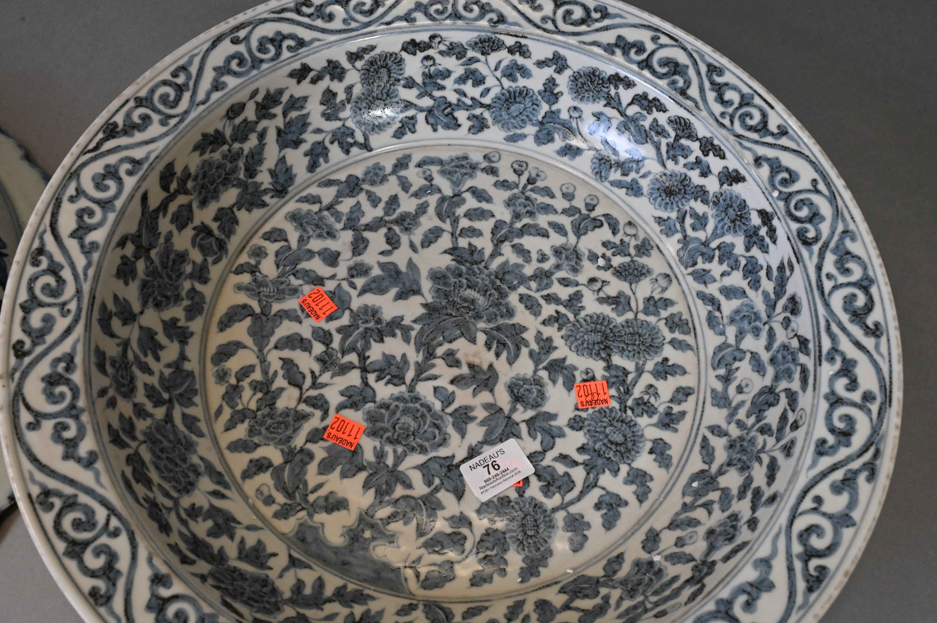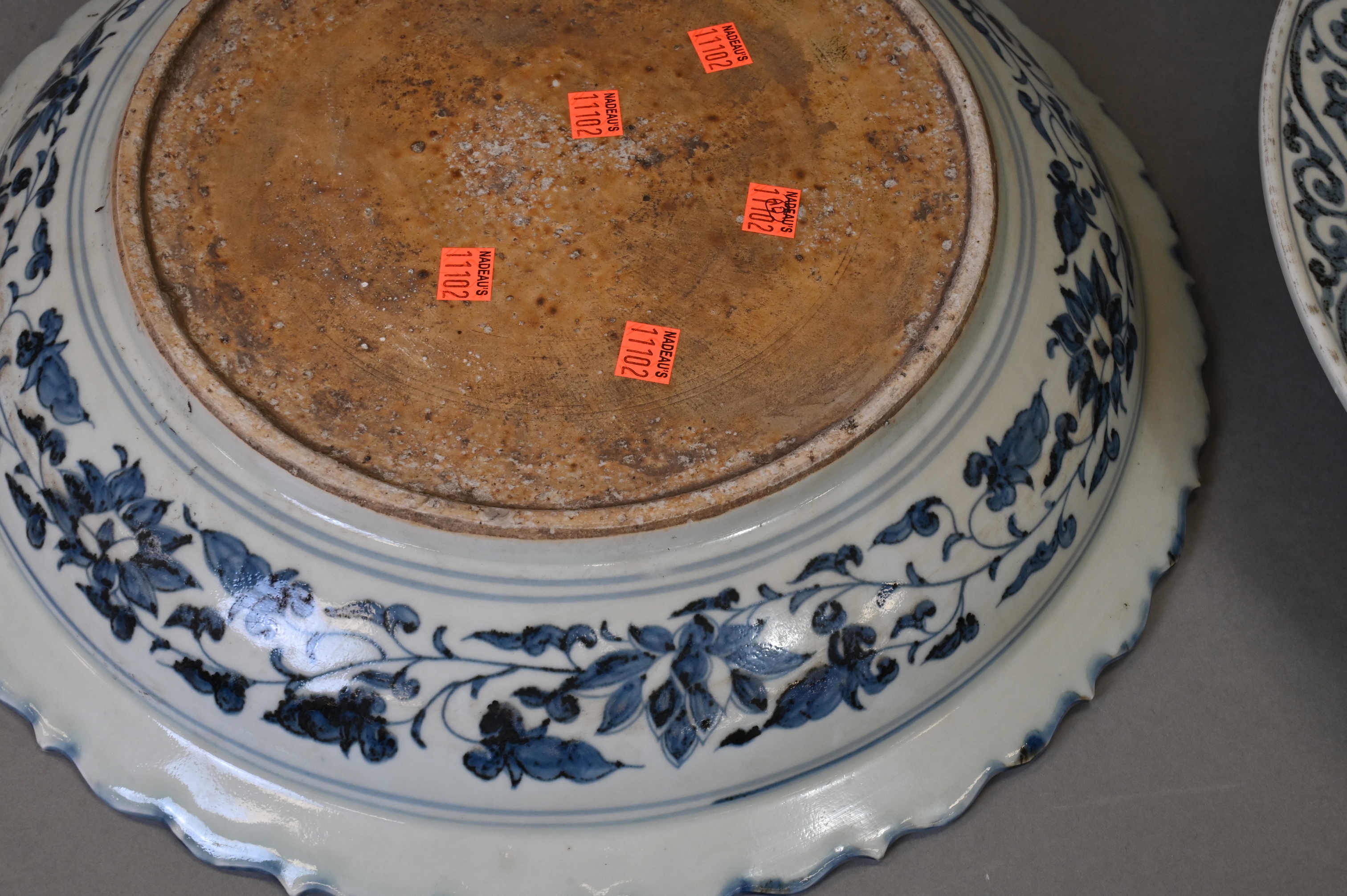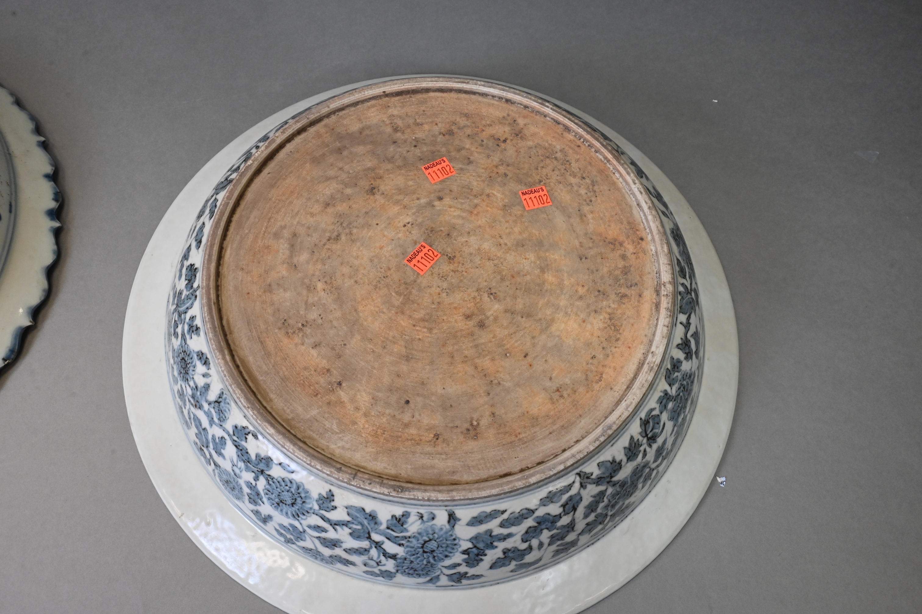 one decorated allover floral and scrolling vine pattern, diameter 18 1/2 inches, the other having lotus and crashing waves motif and shaped rim, diameter 18 inches