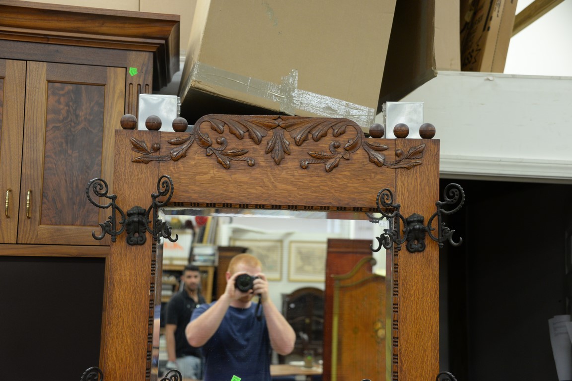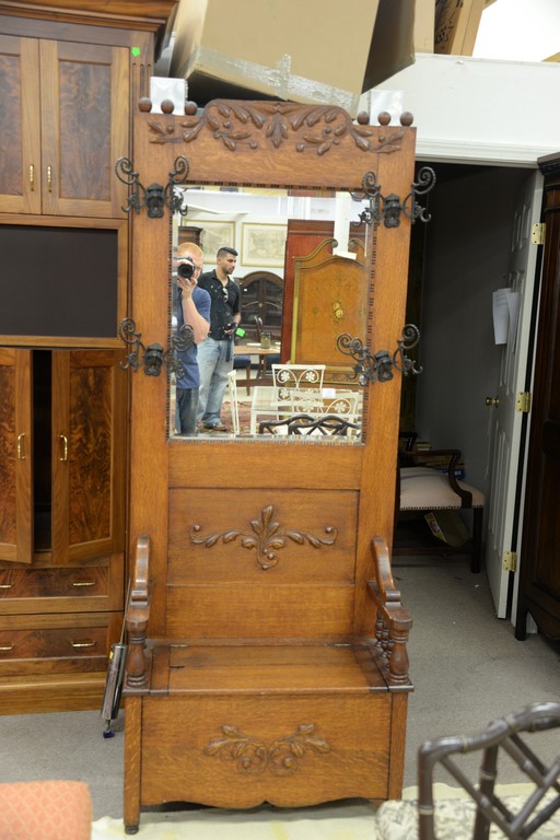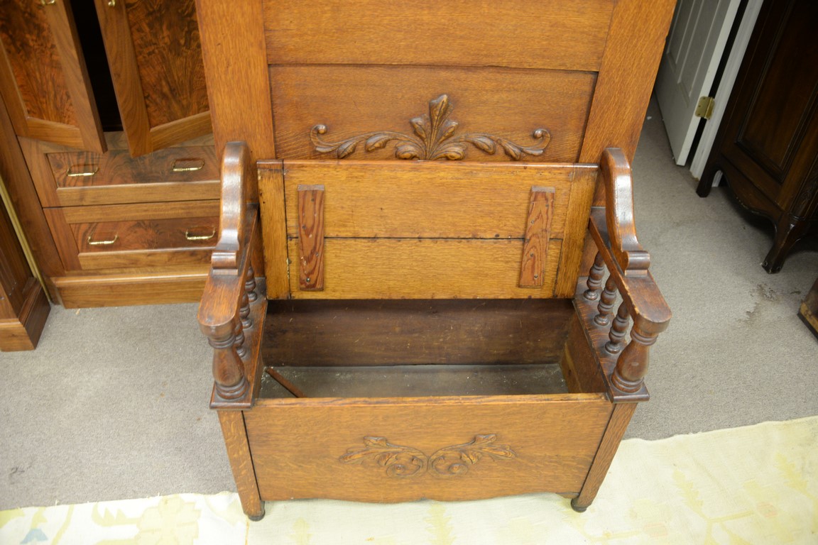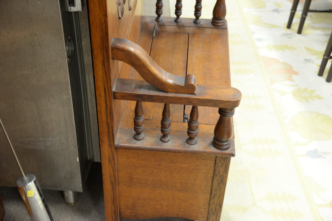 Victorian oak hall seat with coat hooks. ht. 80in. wd. 32in.