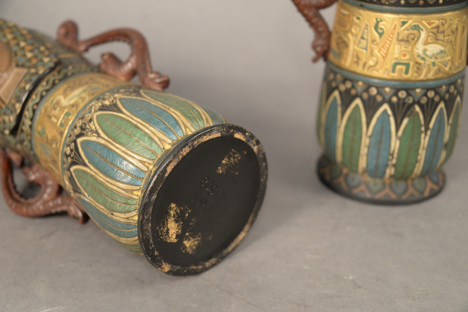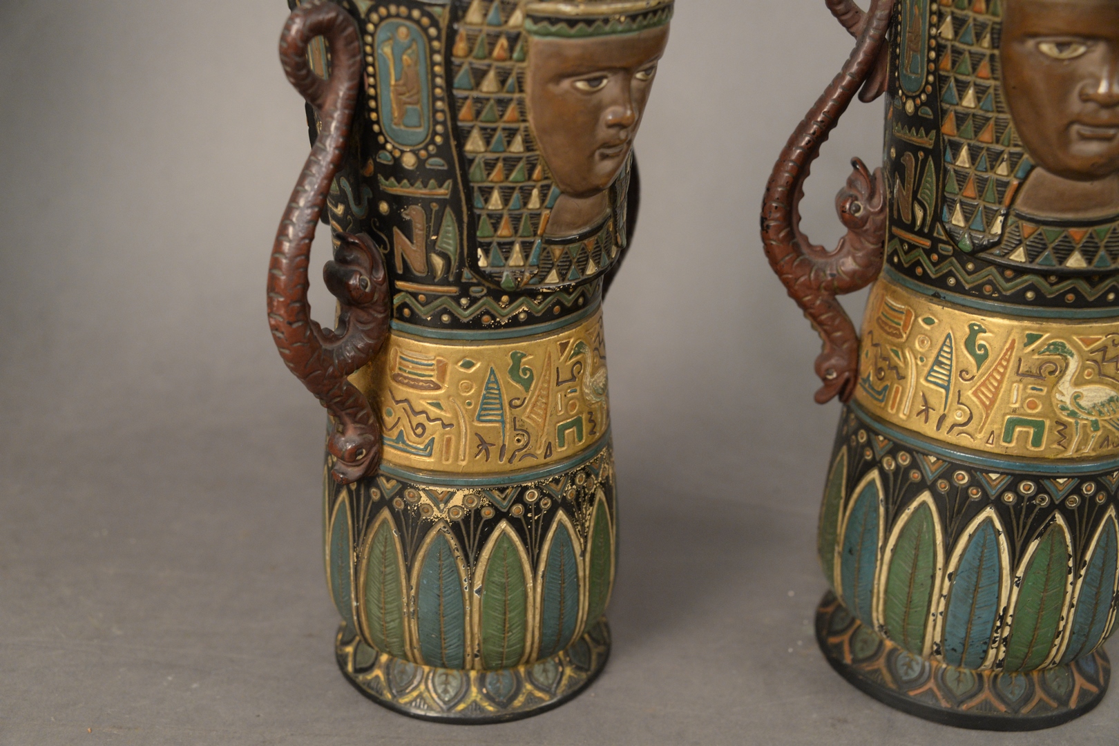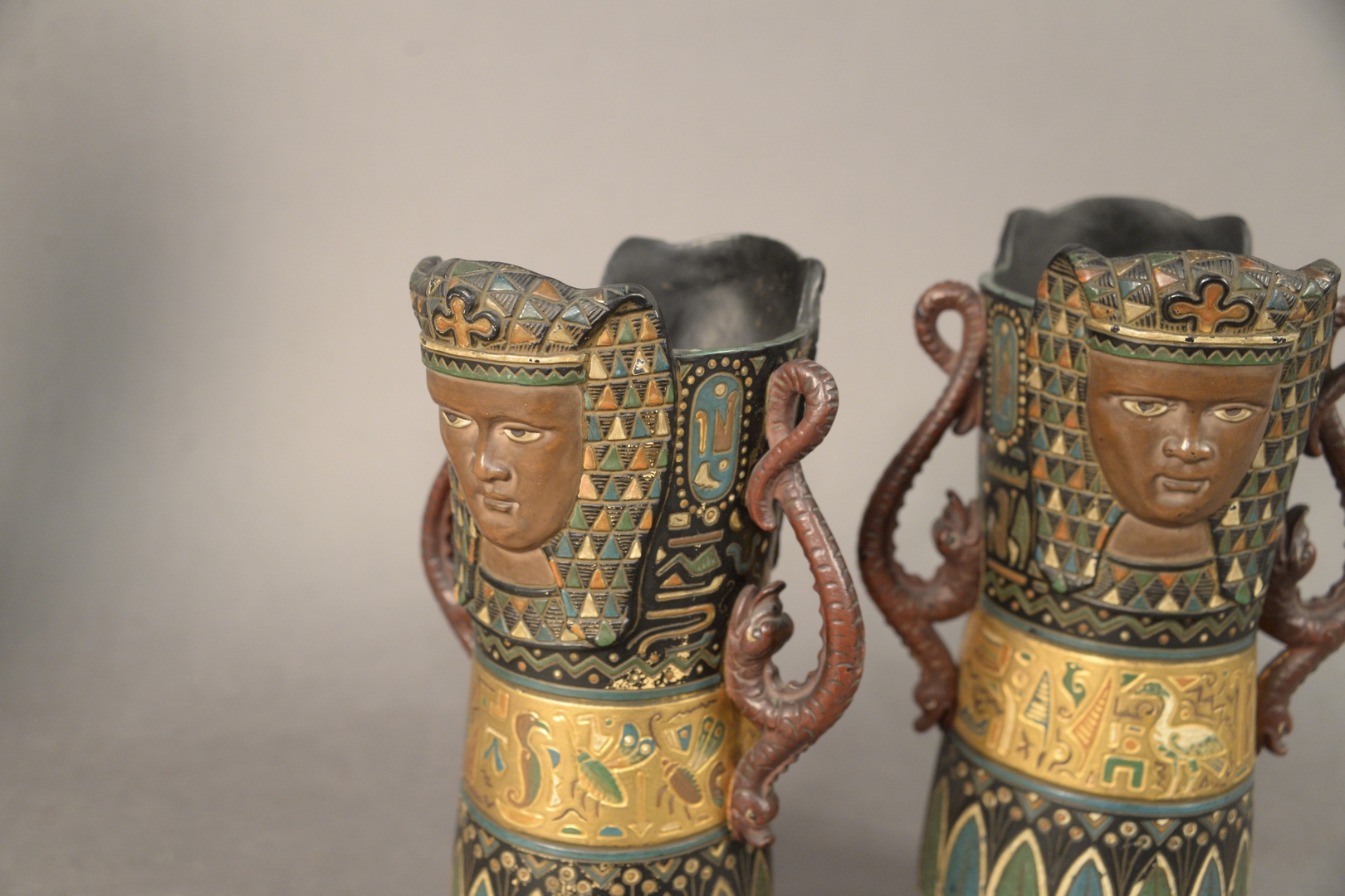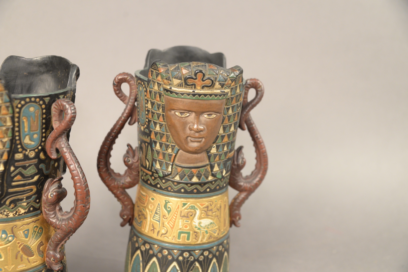 Lot 760: Pair of William Schiller and Son, Austria, Egyptian Revival Style Ceramic Vases, both marked to the underside, height 11 inches, wid…