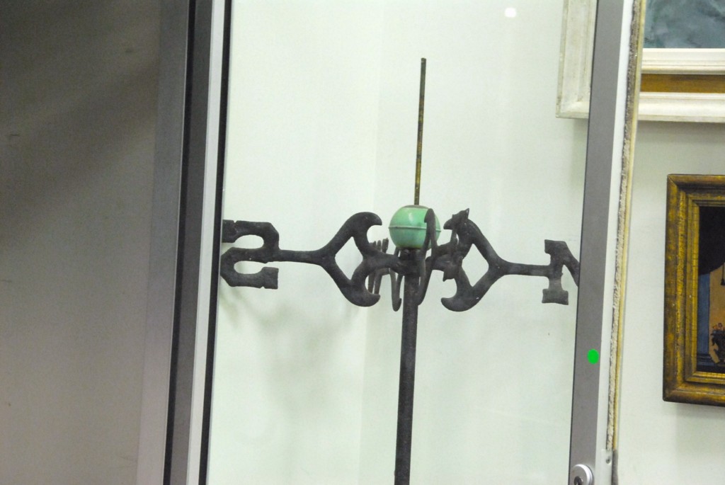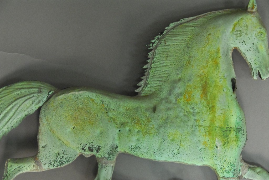 Copper horse weathervane trotting with flowing mane and tail having full directionals, in great green patina one bullet hole in throat. – ht. 17in. lg. 23in.
