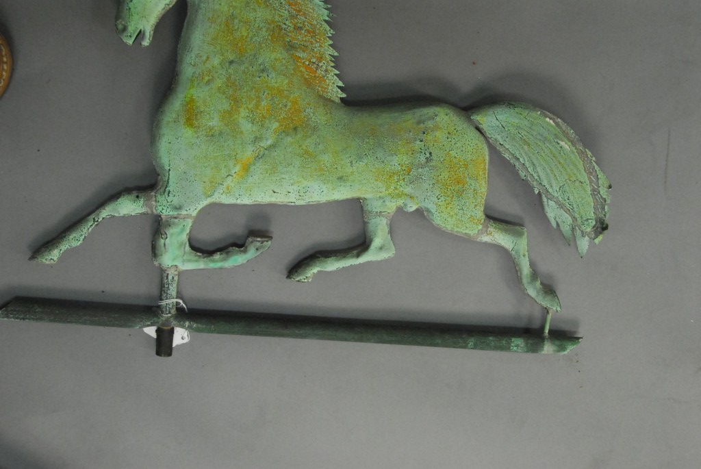 Lot 762: Copper horse weathervane trotting with flowing mane and tail having full directionals, in great green patina one bullet hole in thr…