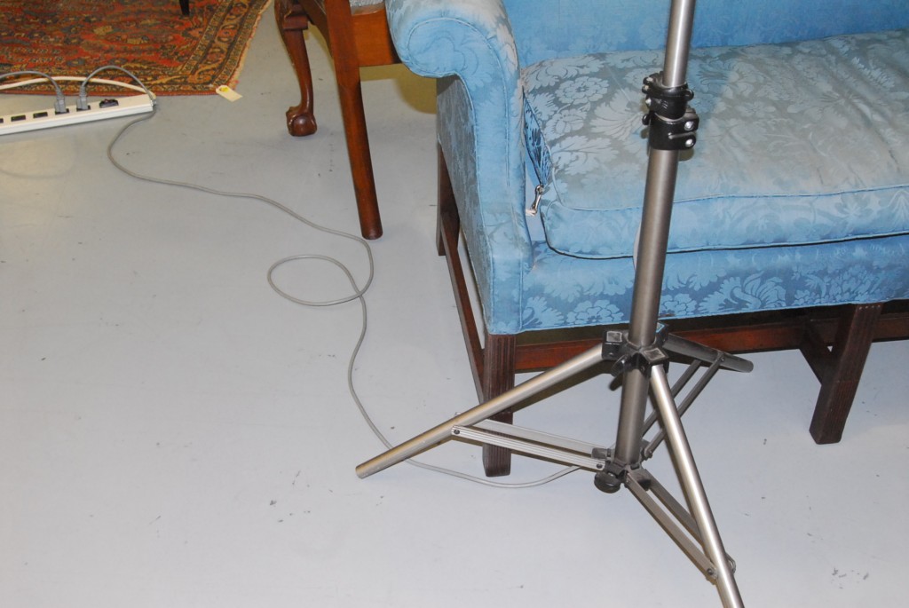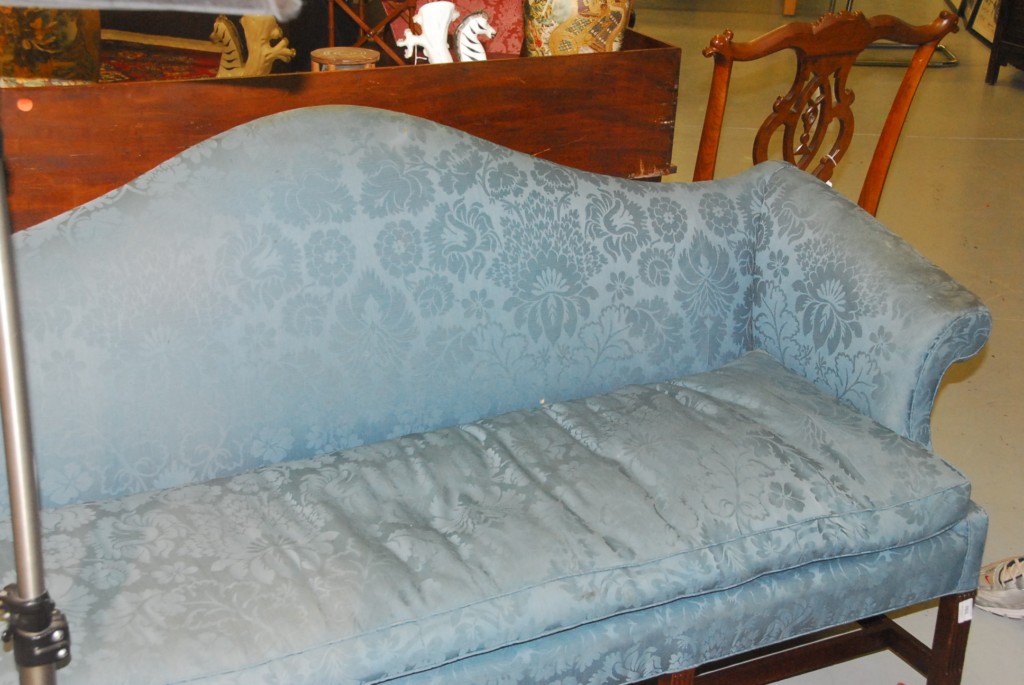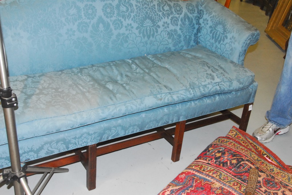 Lot 763: Kittinger Chippendale camelback loveseat, blue and brocade upholstery with four square molded stop-fluted legs connected by box stre…