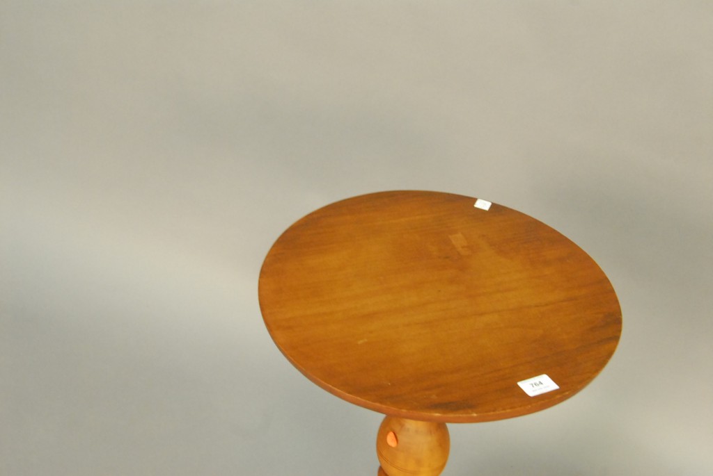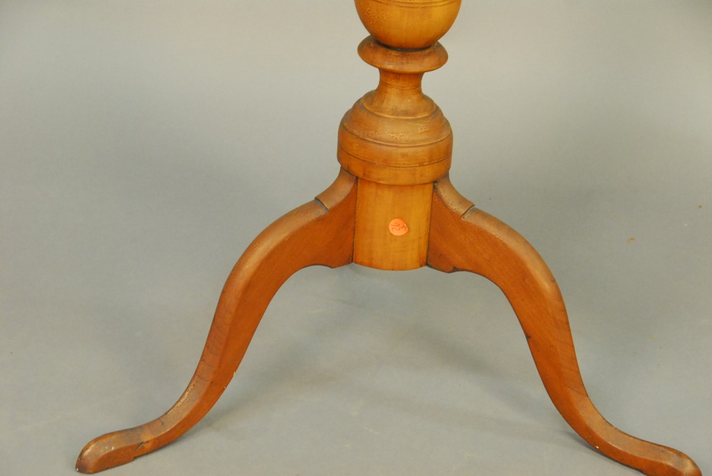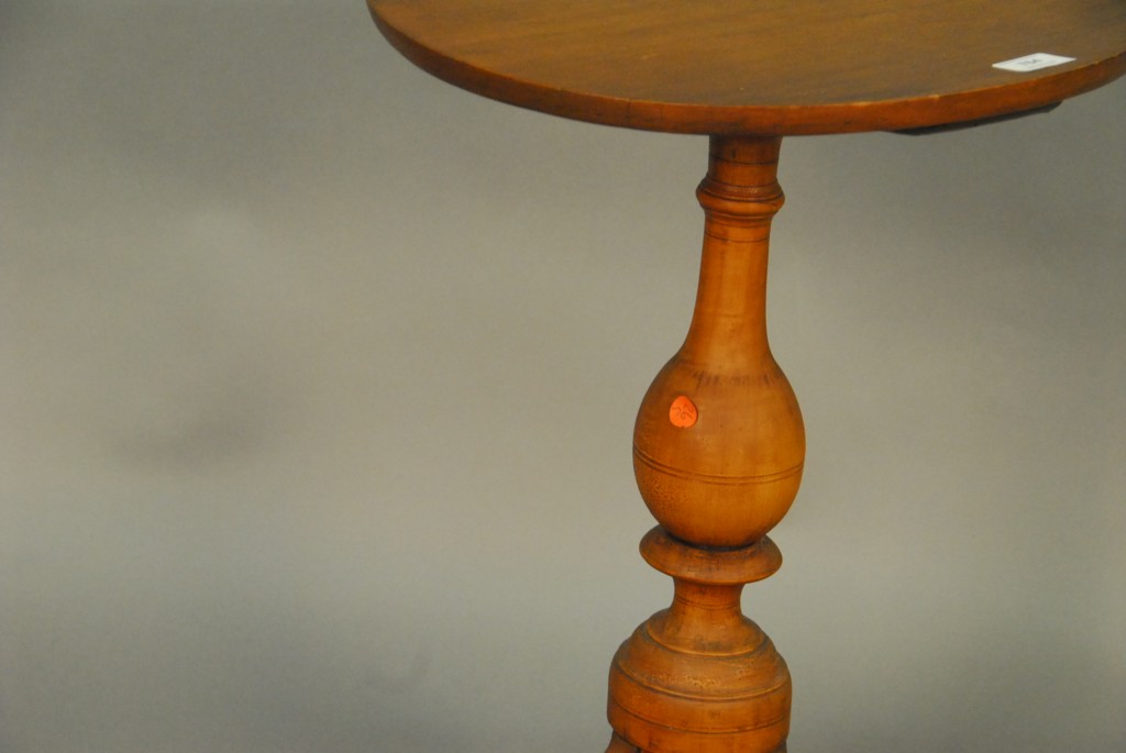 Connecticut cherry Queen Anne oval top candlestand with well proportioned turned shaft, resting on three arch-carved legs ending in slipper feet, 18th century. – ht. 27 1/2in. dia. 17in.