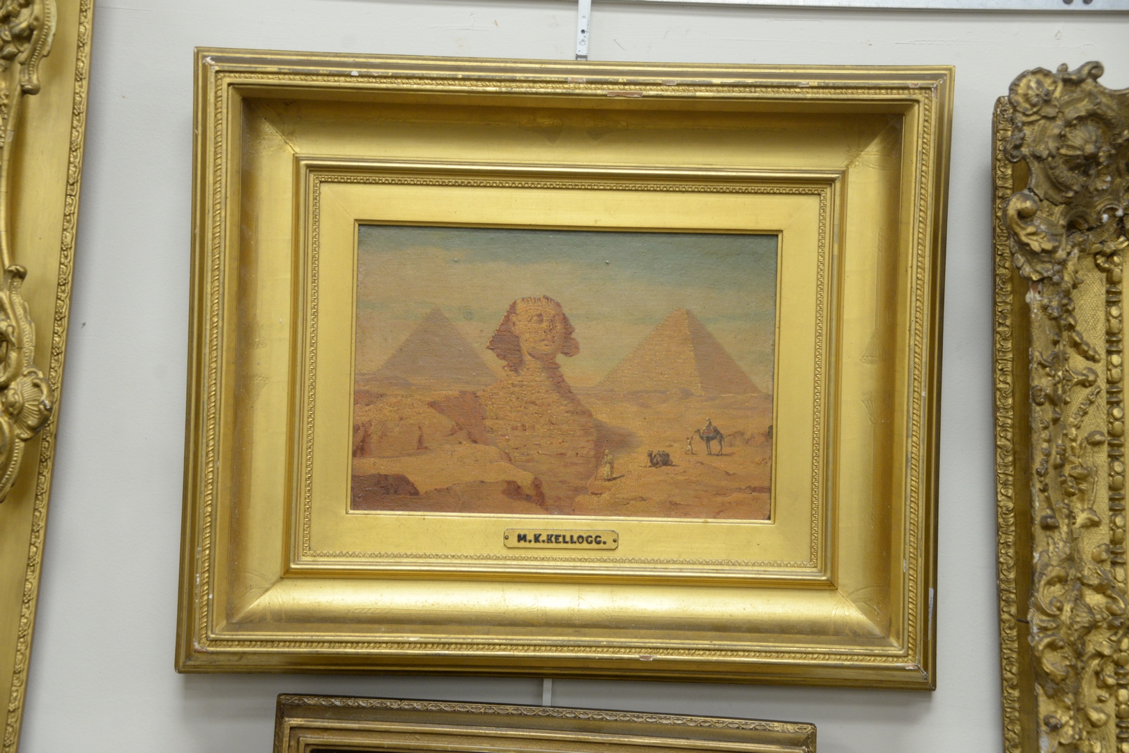 Miner Kellogg American, 1814 – 1889, Sphinx and Pyramids at Cheops and Cyphrene, Egypt, oil on board, signed and dated lower right MK Kellogg 1870 titled and inscribed on the reverse, 9 x 13, having a Charles B. Jarvis label adhered on the reverse.