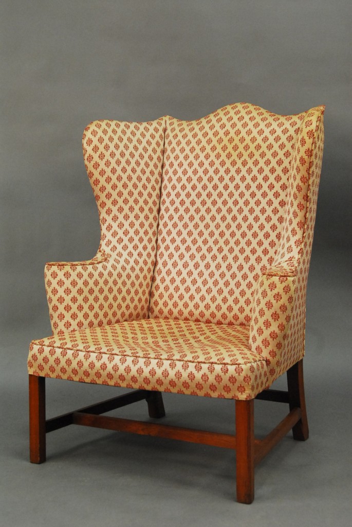 Lot 769: Chippendale upholstered wing chair on plain square legs and stretcher base, circa 1780. – ht. 45in. wd. 34in. seat ht. 15in.