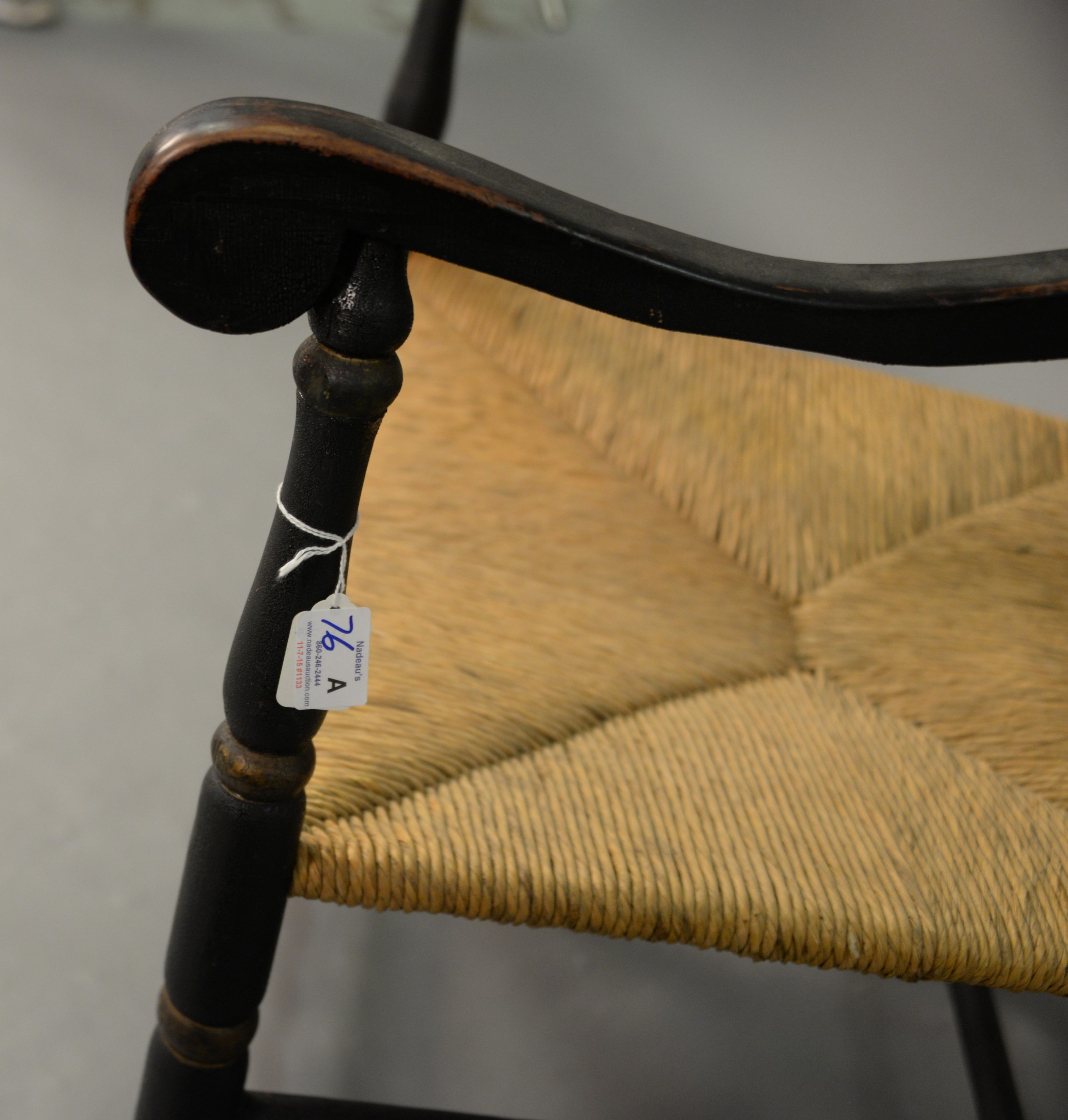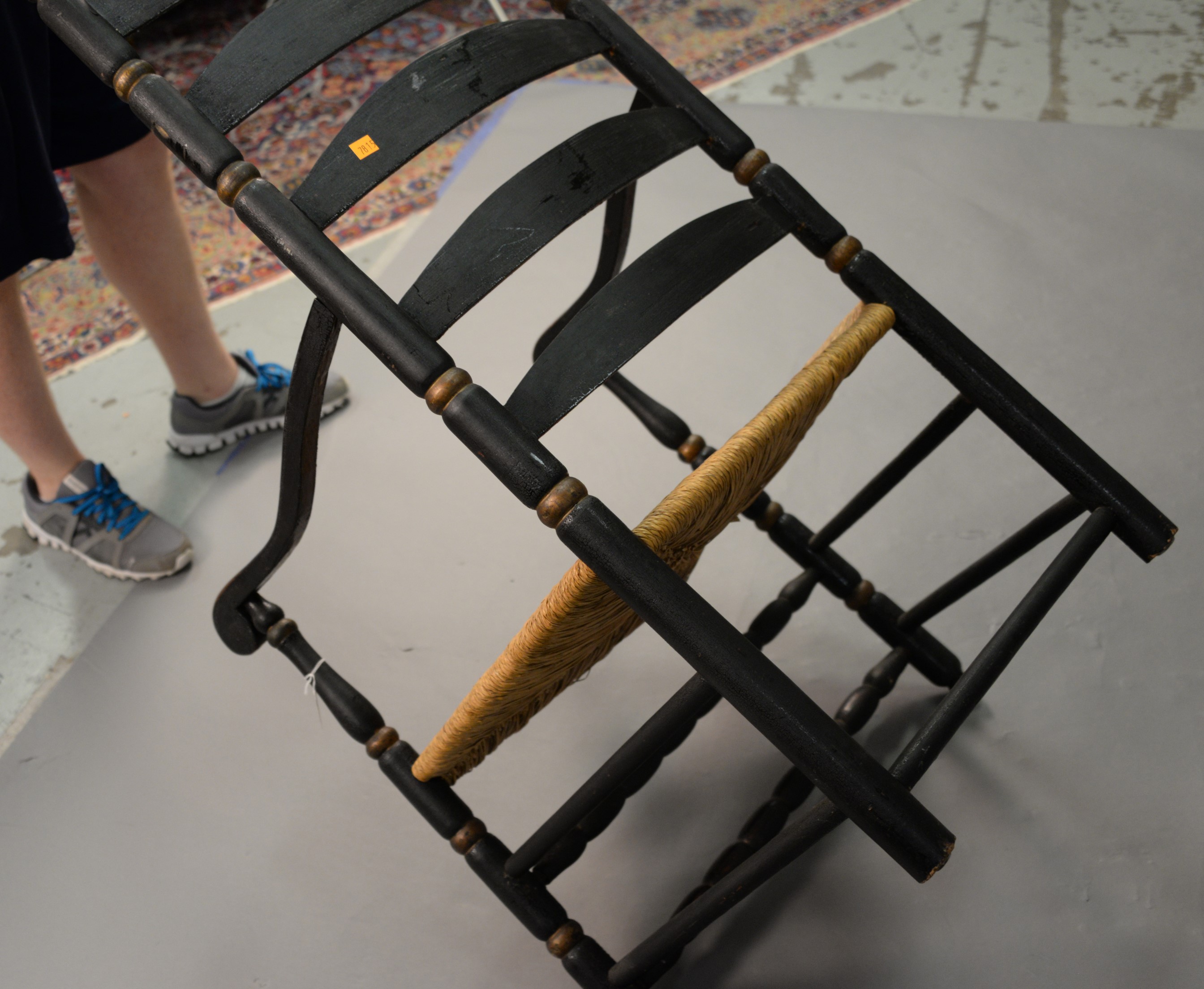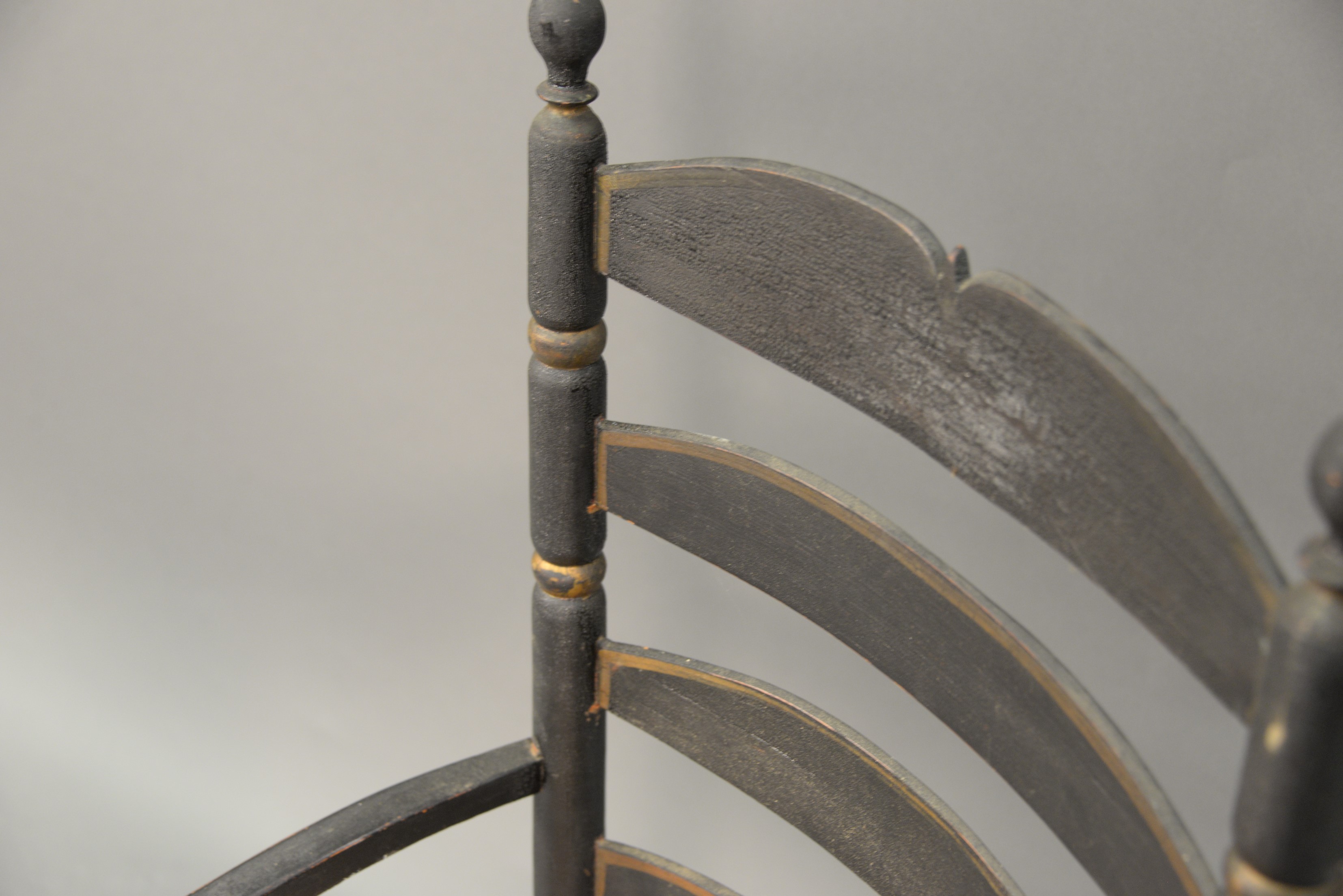 Lot 76A: Ladderback great chair having five arched slats with sausage turned stiles and front legs and turned stretchers, old black and gold…