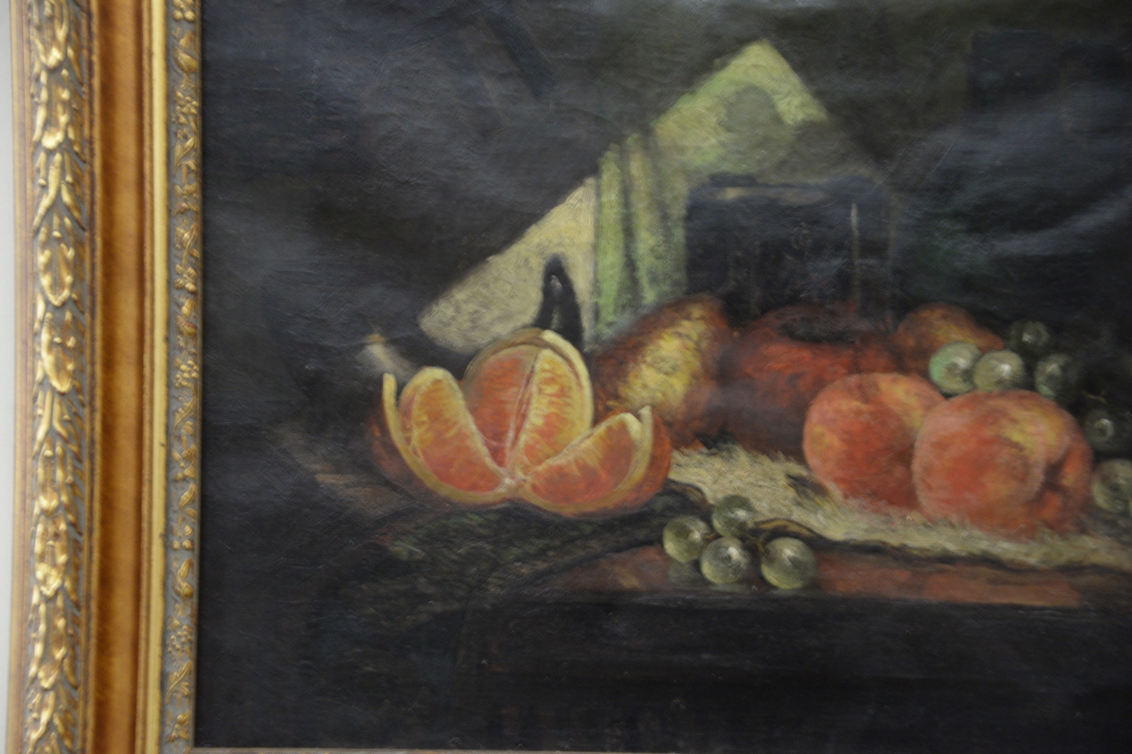 Lot 77: Continental School (19th century), still life with apples, grapes and an orange, oil on canvas, unsigned, 16″ x 22″.