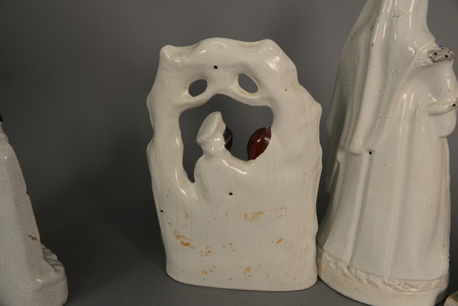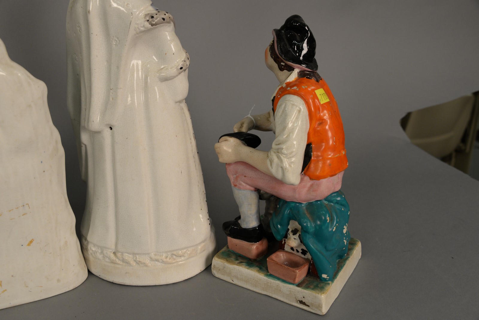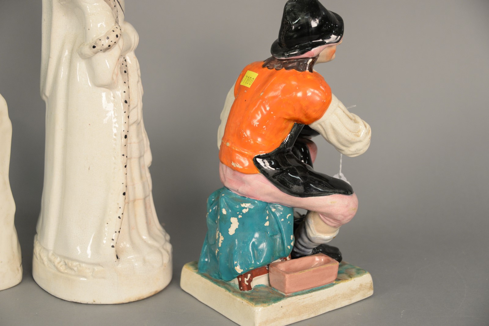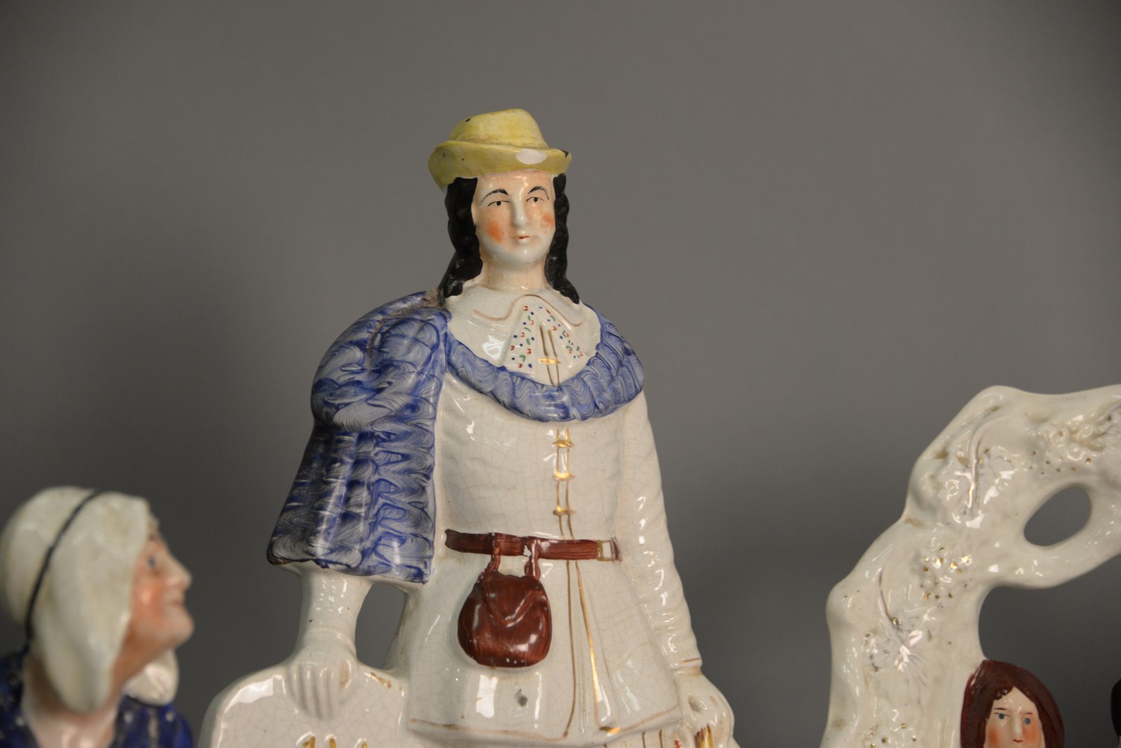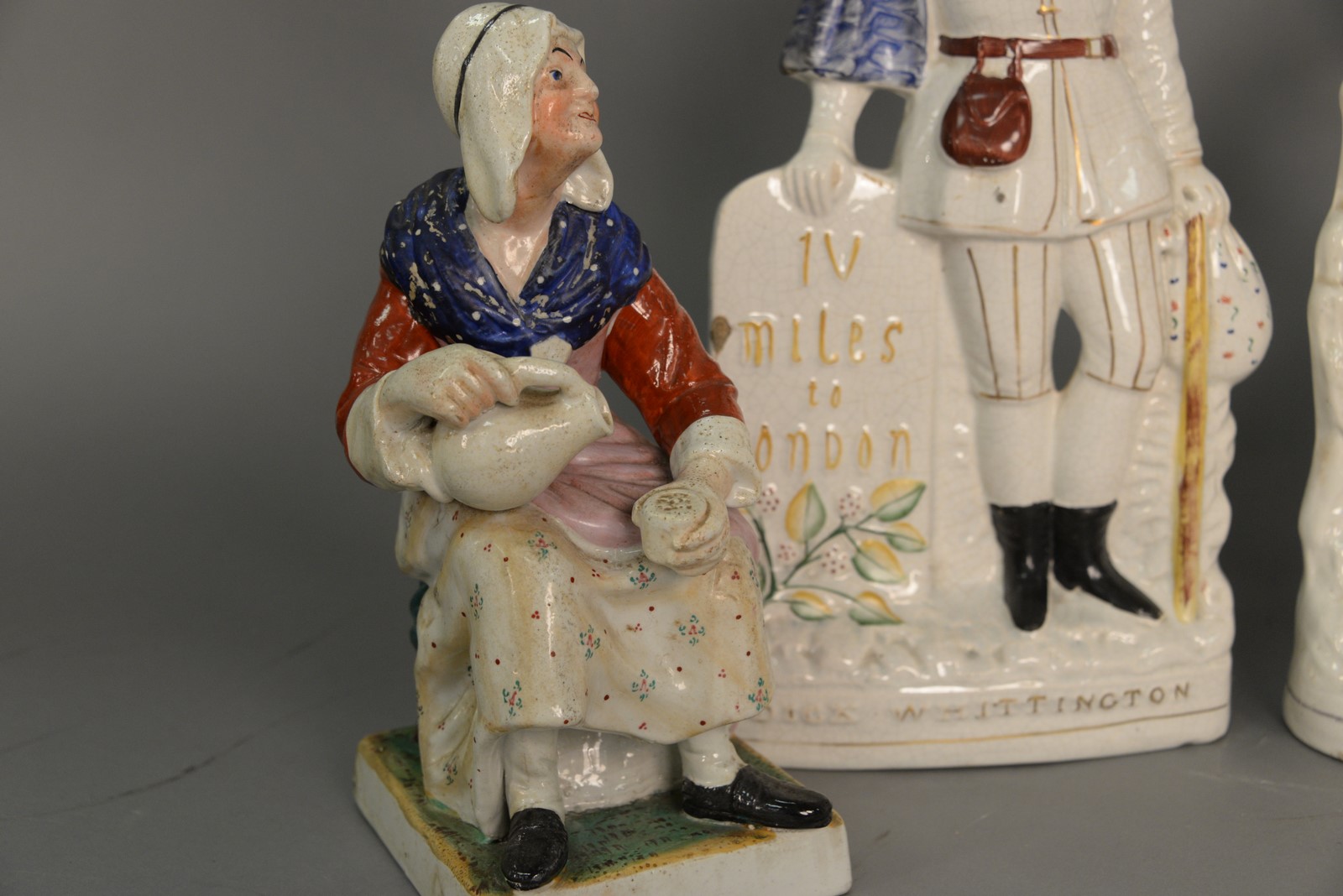 Lot 77: Five large Staffordshire figure, Dick Whittington IV Miles to London, standing girl, two people seated, a seated shoe boy, and water…