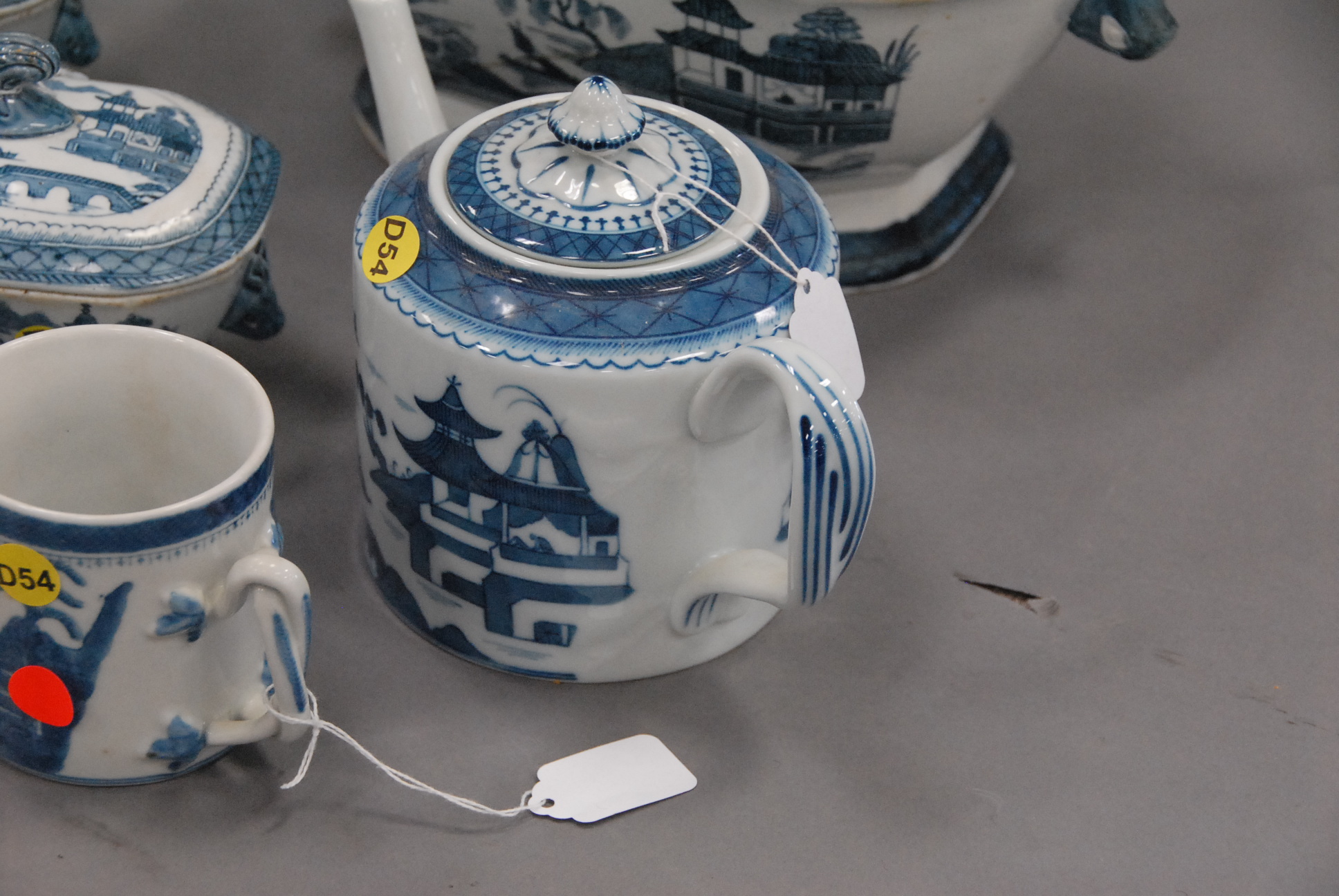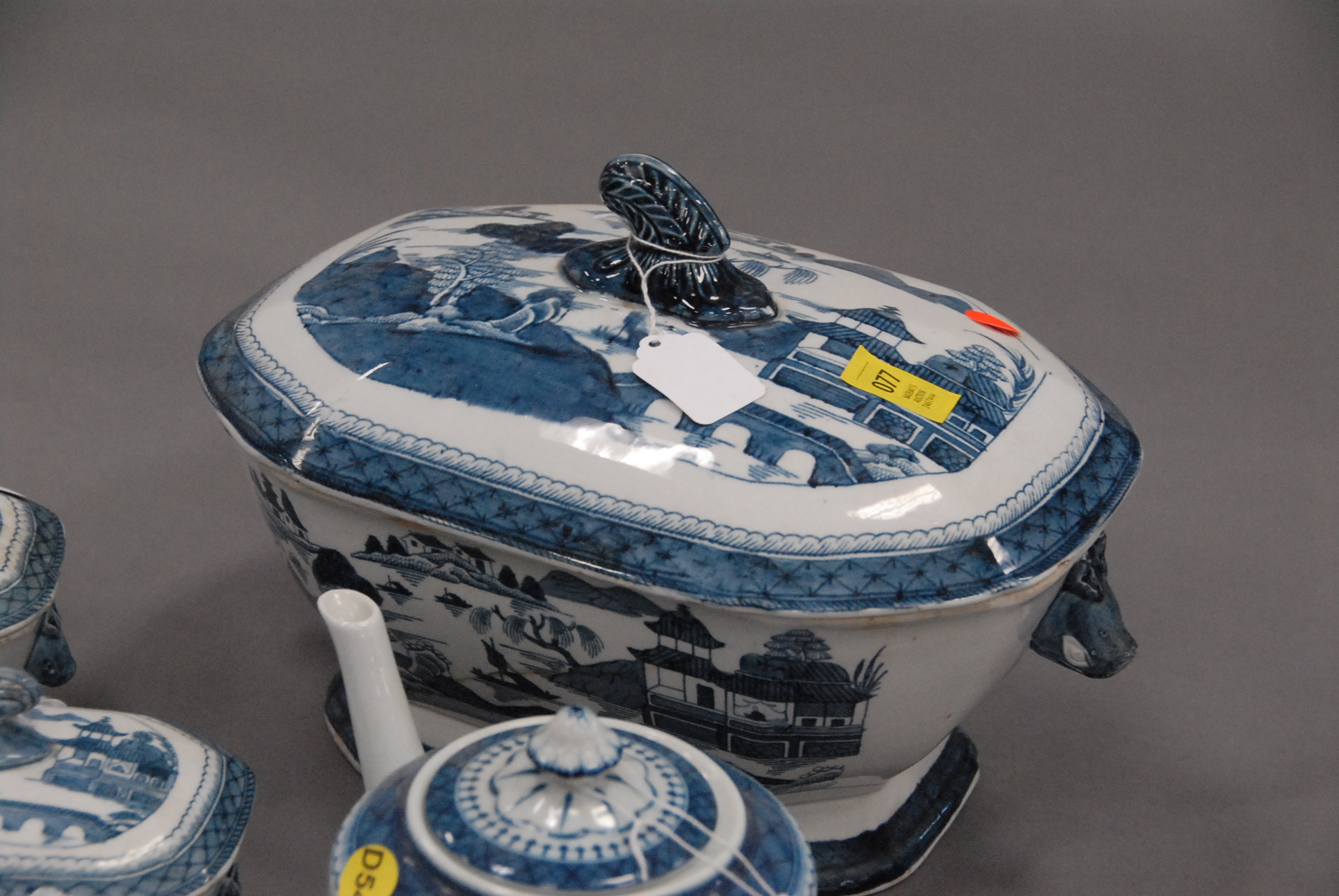 Four piece Canton style lot to include a tureen, teapot, two covered sauce dishes, and two mugs.