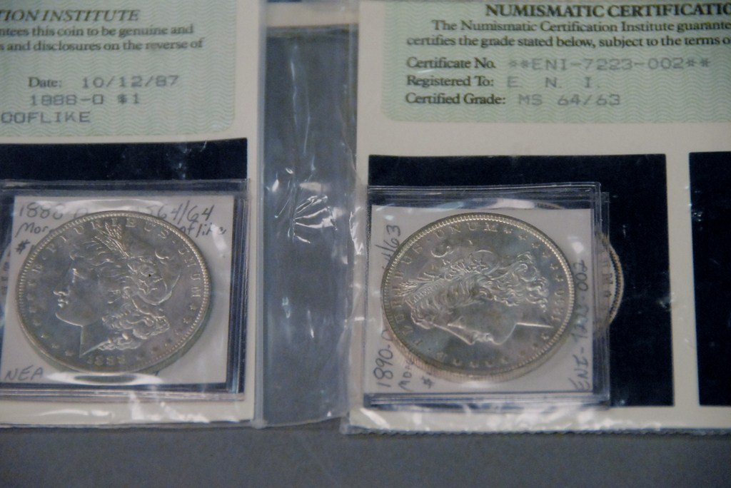 Lot 77: Four silver dollars 1878-S NCI 64/64, 1881-O NCI 64/64, 1880-O NCI 64/64, and 1890-O NCI 64/63.